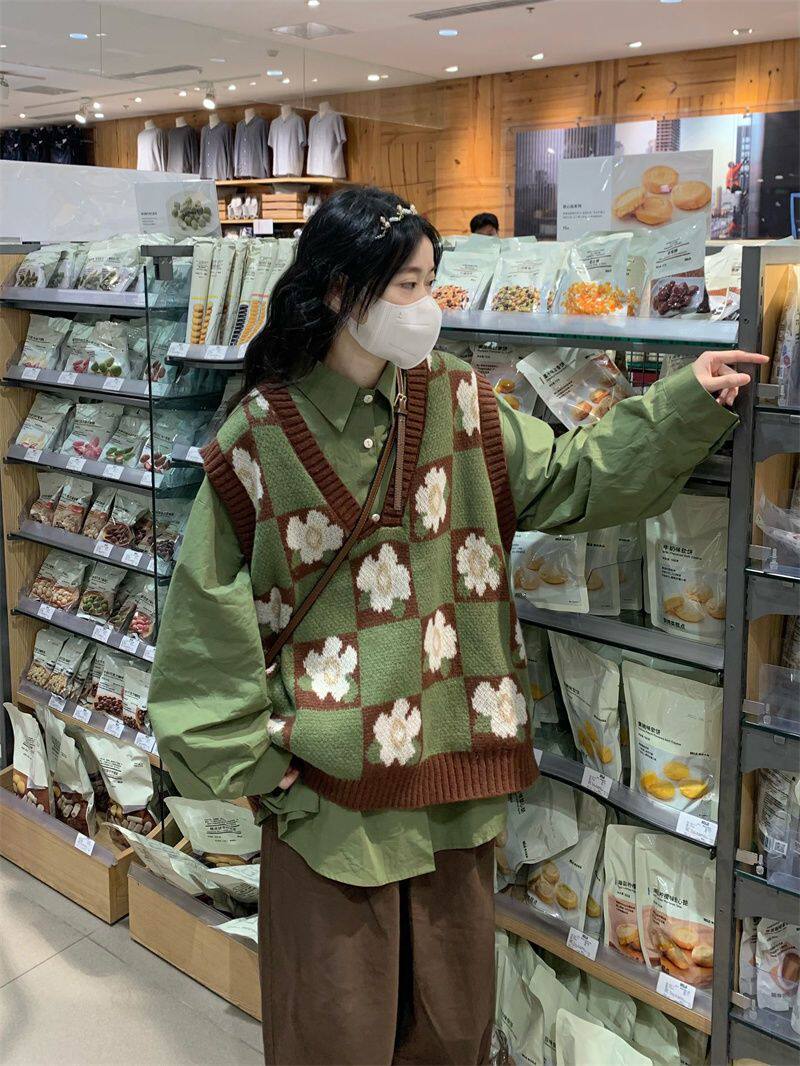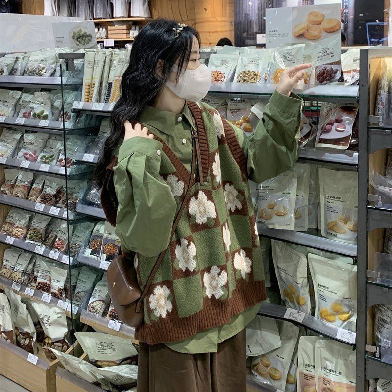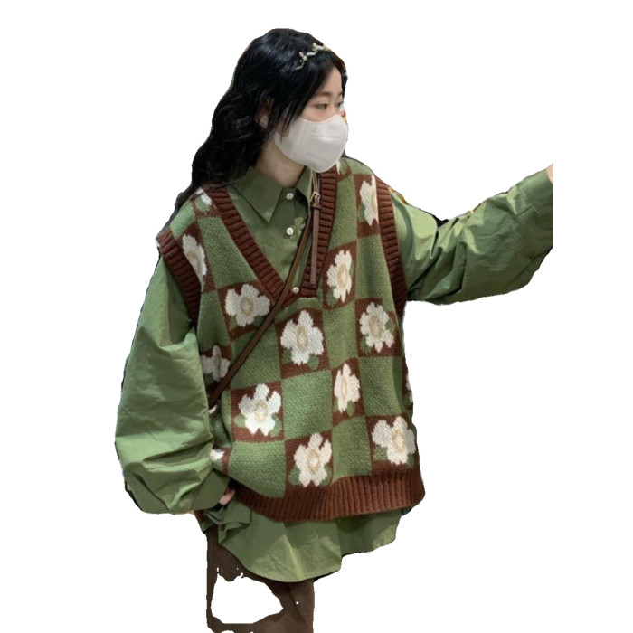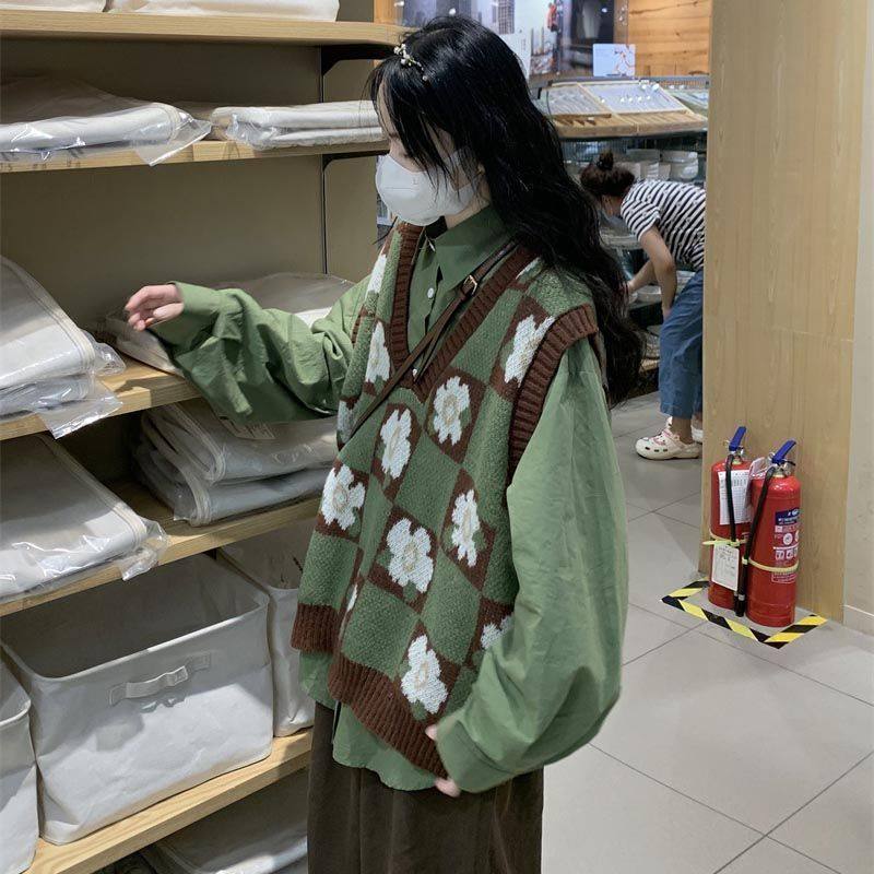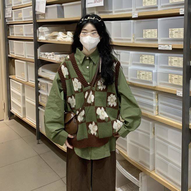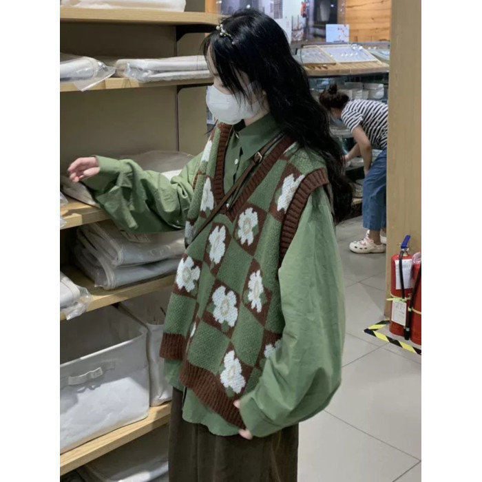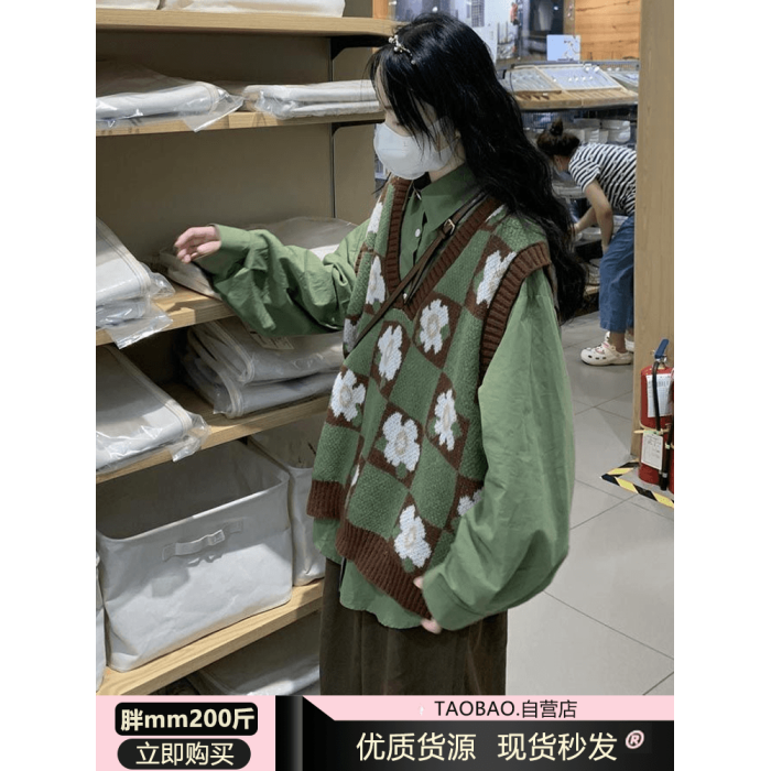 胖MM200斤特大碼套裝甜美小花拼色曡穿針織毛衣馬甲背心綠色襯衫