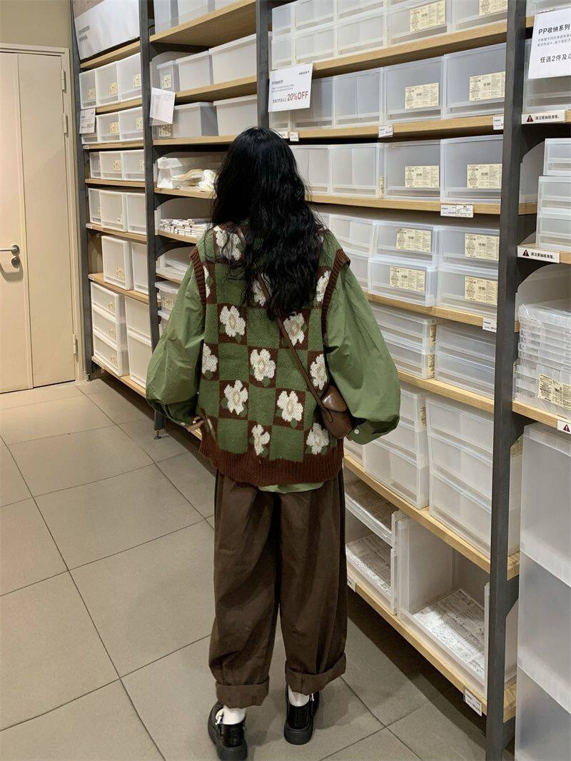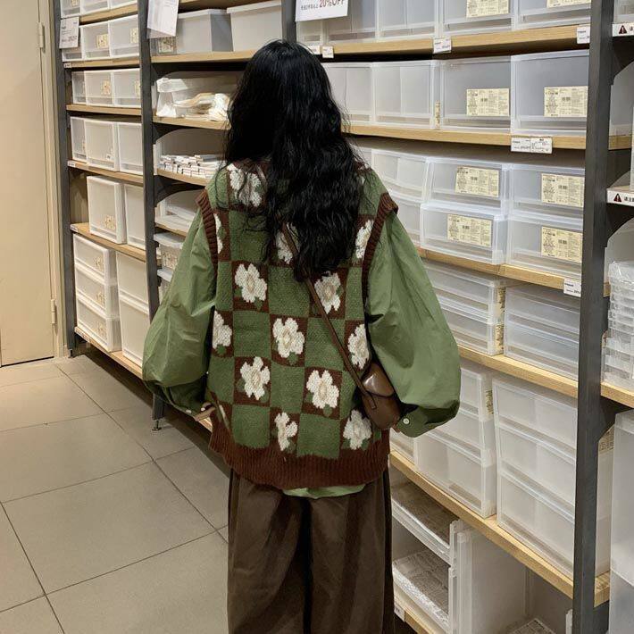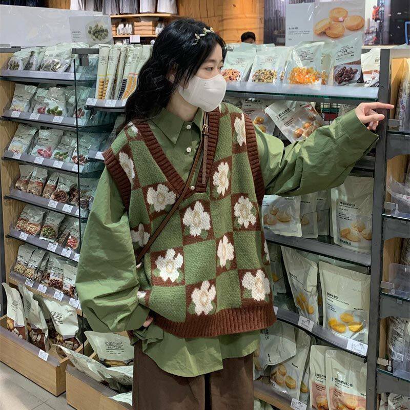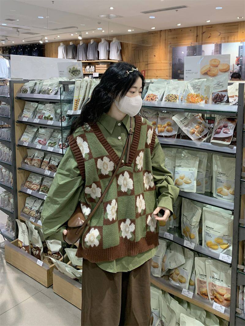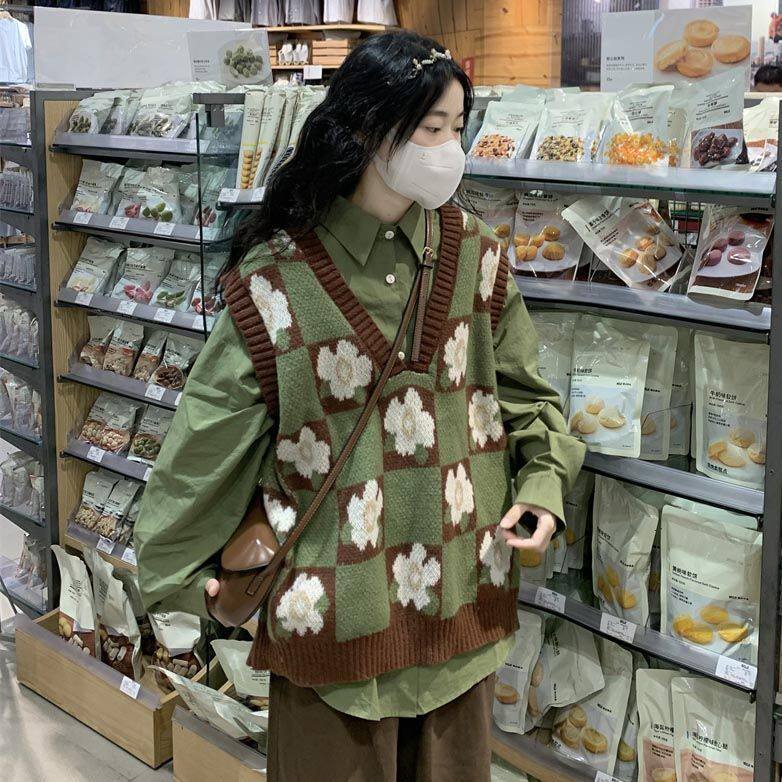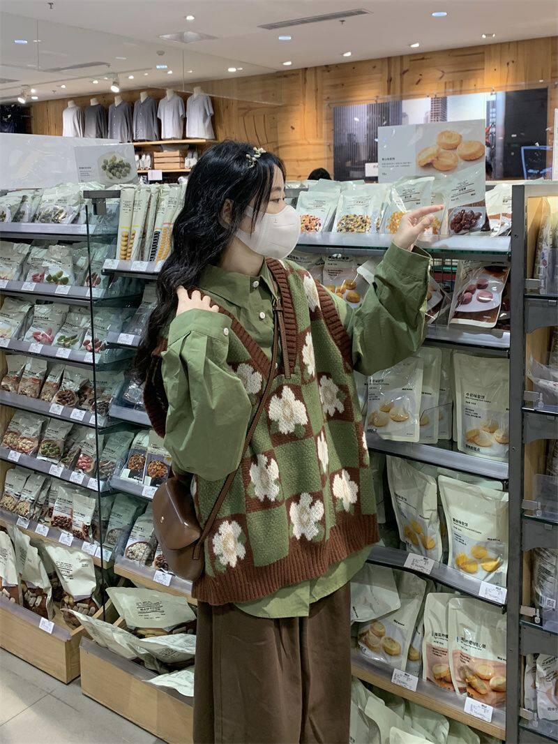 胖MM200斤特大碼套裝甜美小花拼色曡穿針織毛衣馬甲背心綠色襯衫