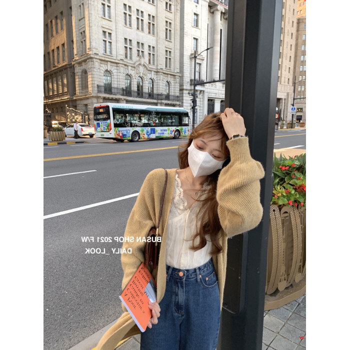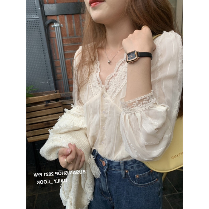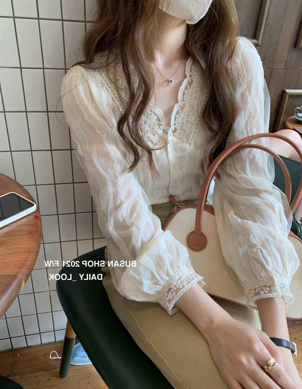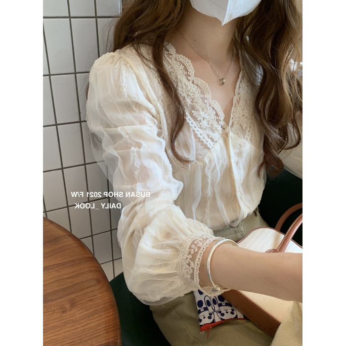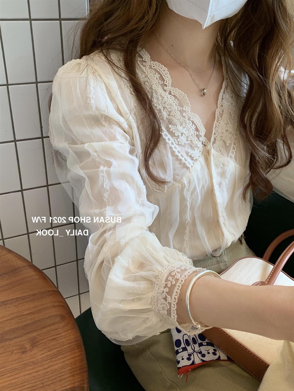 高級感法式小衆上衣初秋溫柔超仙蕾絲衫V領襯衫長袖獨特漂亮小衫