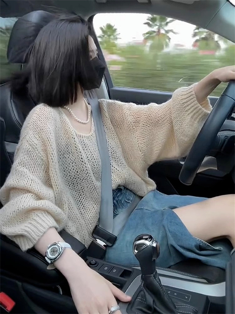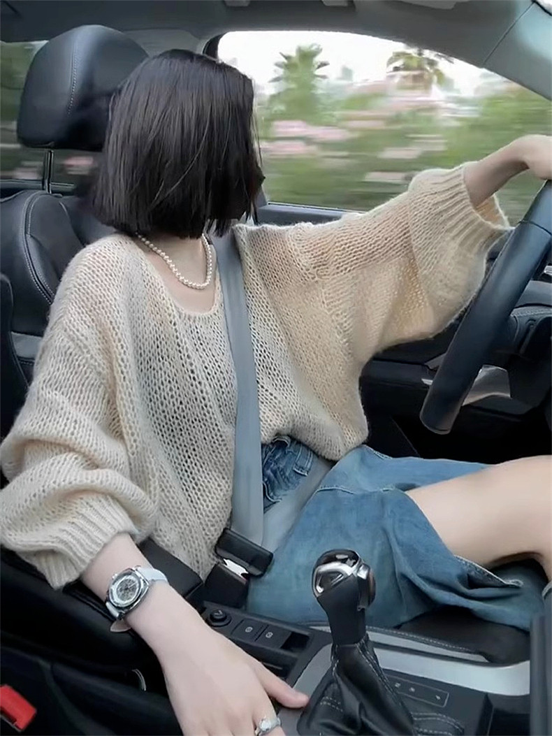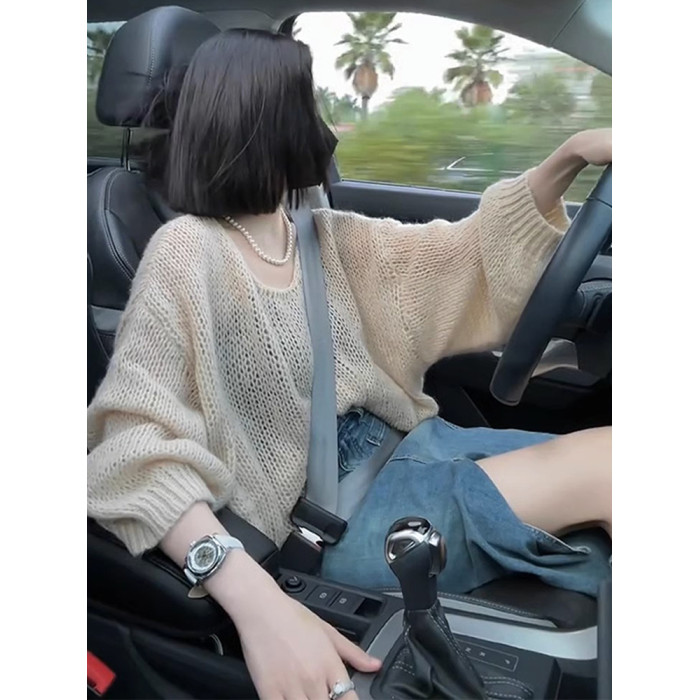 2025新款馬海毛軟糯毛衣女秋冬薄款寬松慵懶風鏤空針織衫上衣女秋