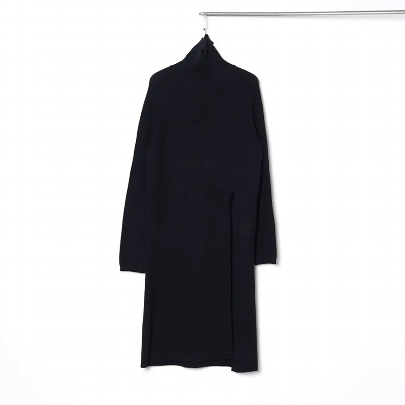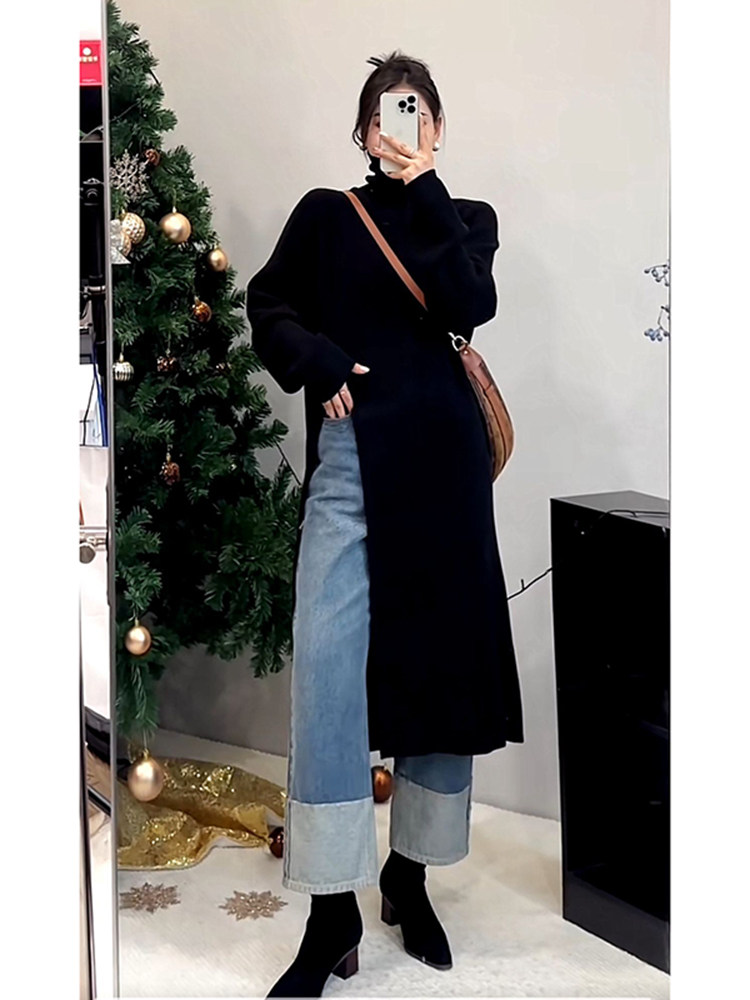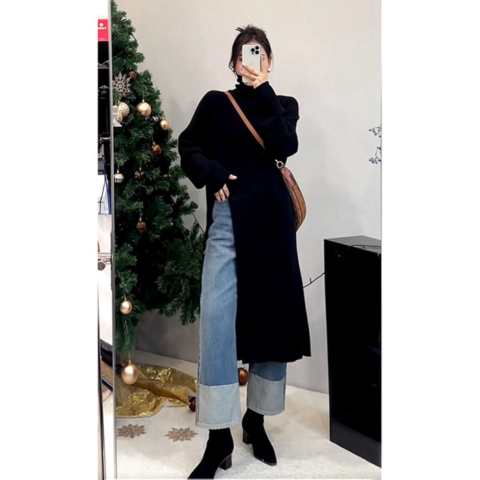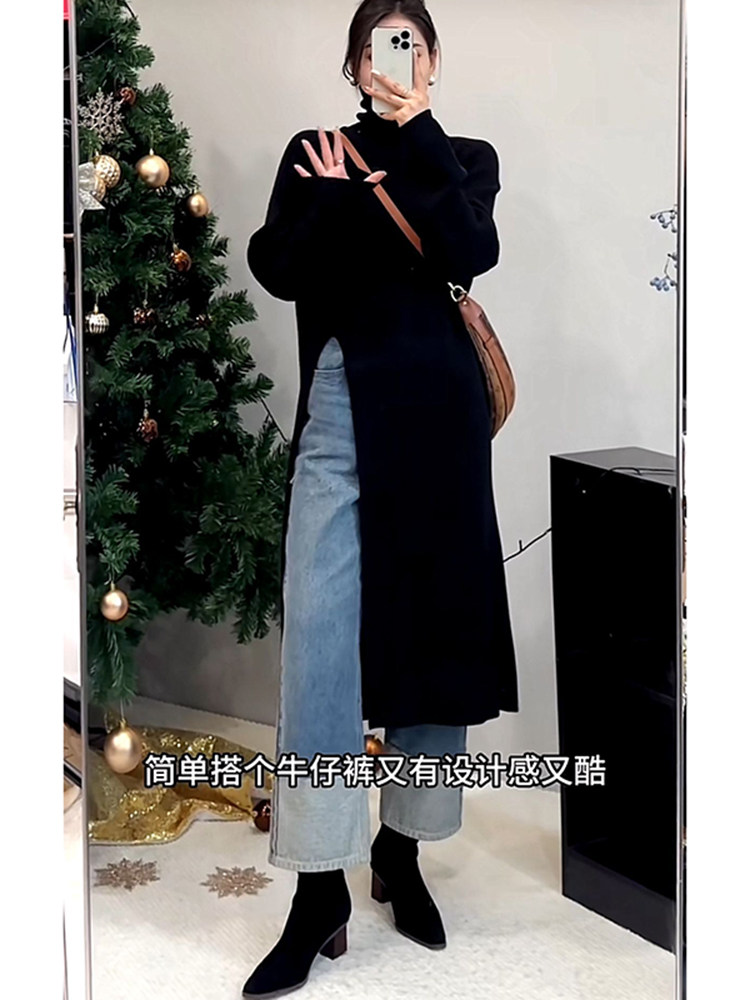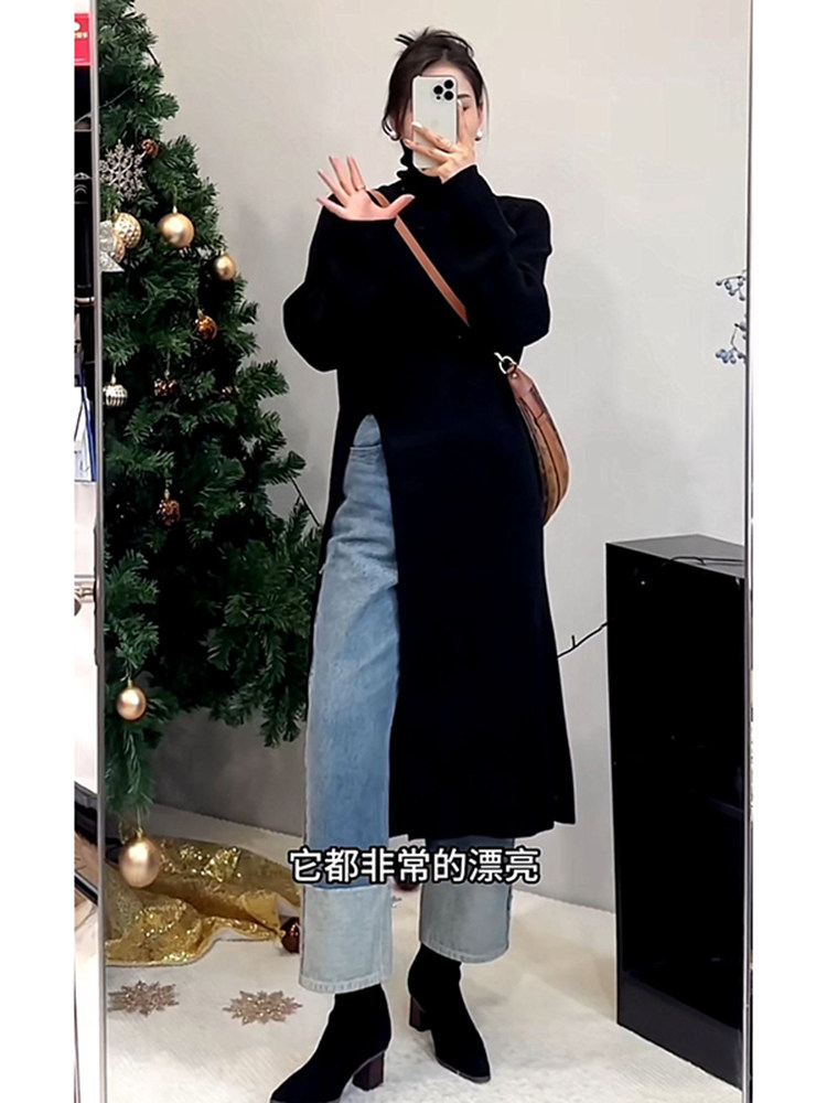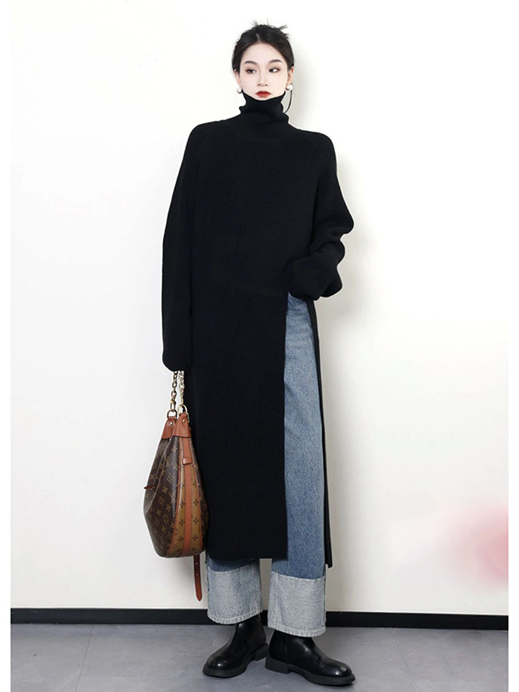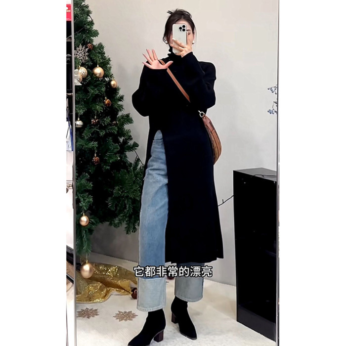 設計感別致開叉高領毛衣女大碼微胖mm顯瘦上衣秋冬韓版長款針織衫