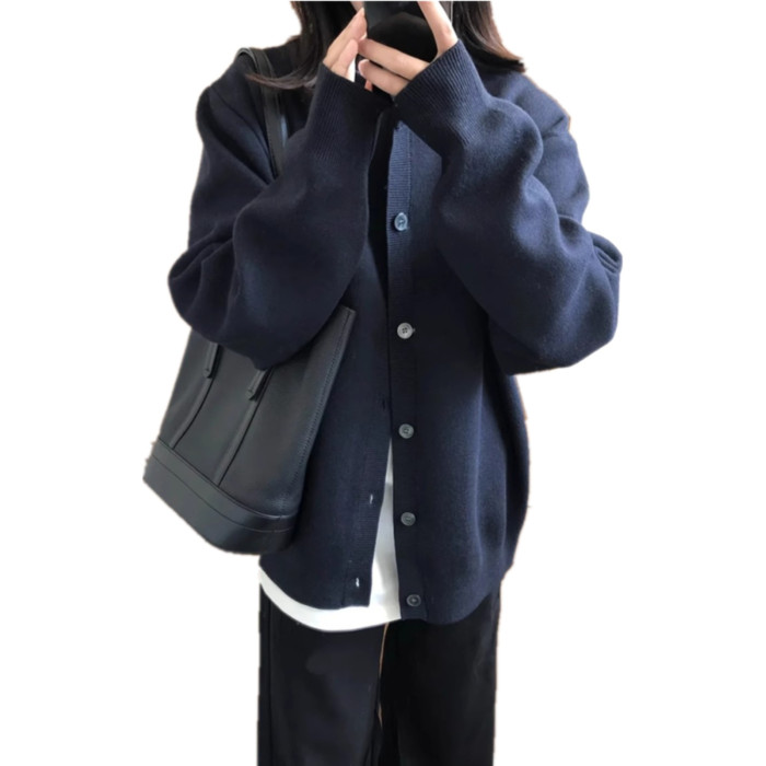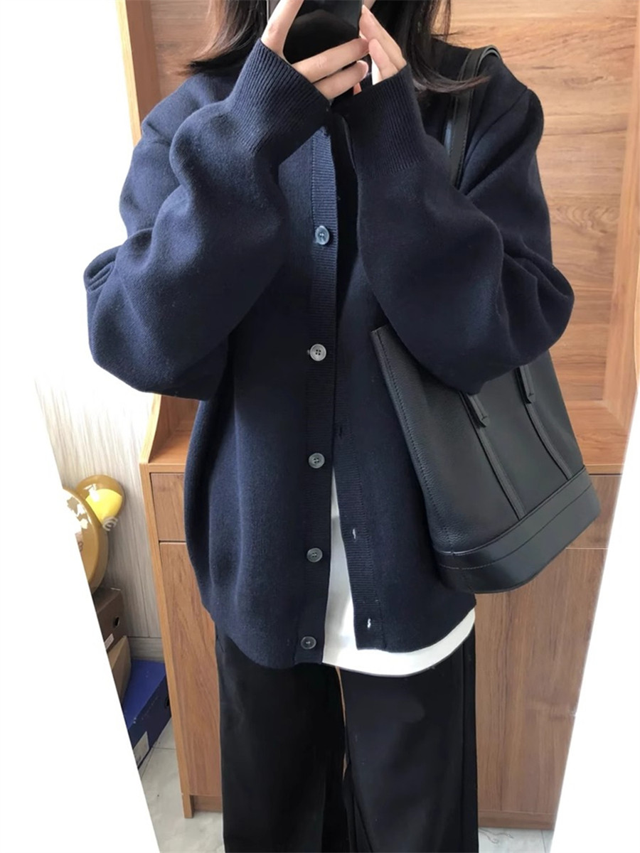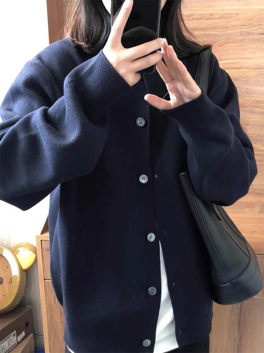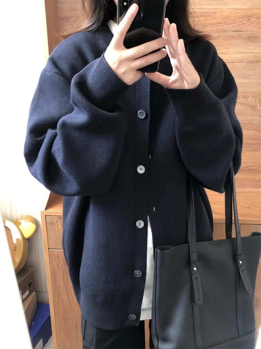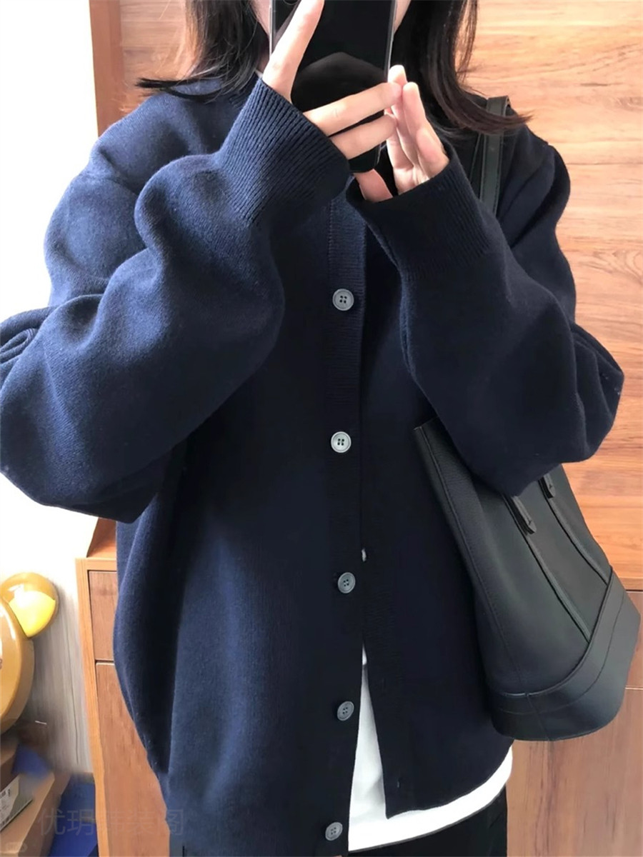 藏青色毛衣開衫外套女針織衫秋季新款寬松慵懶風別致休閒百搭上衣