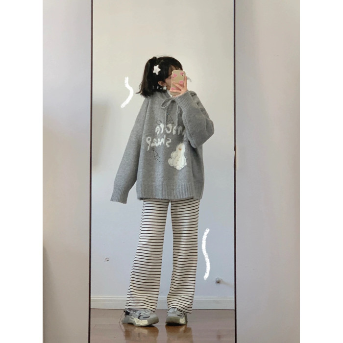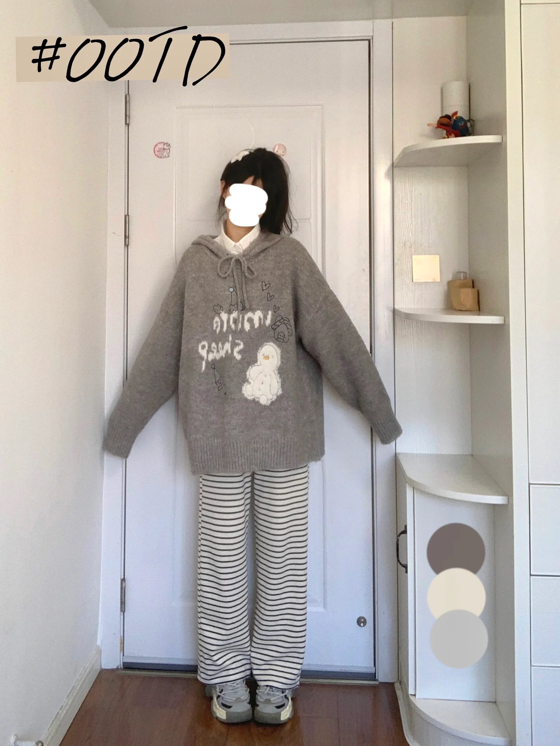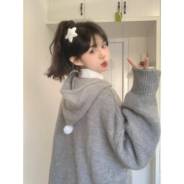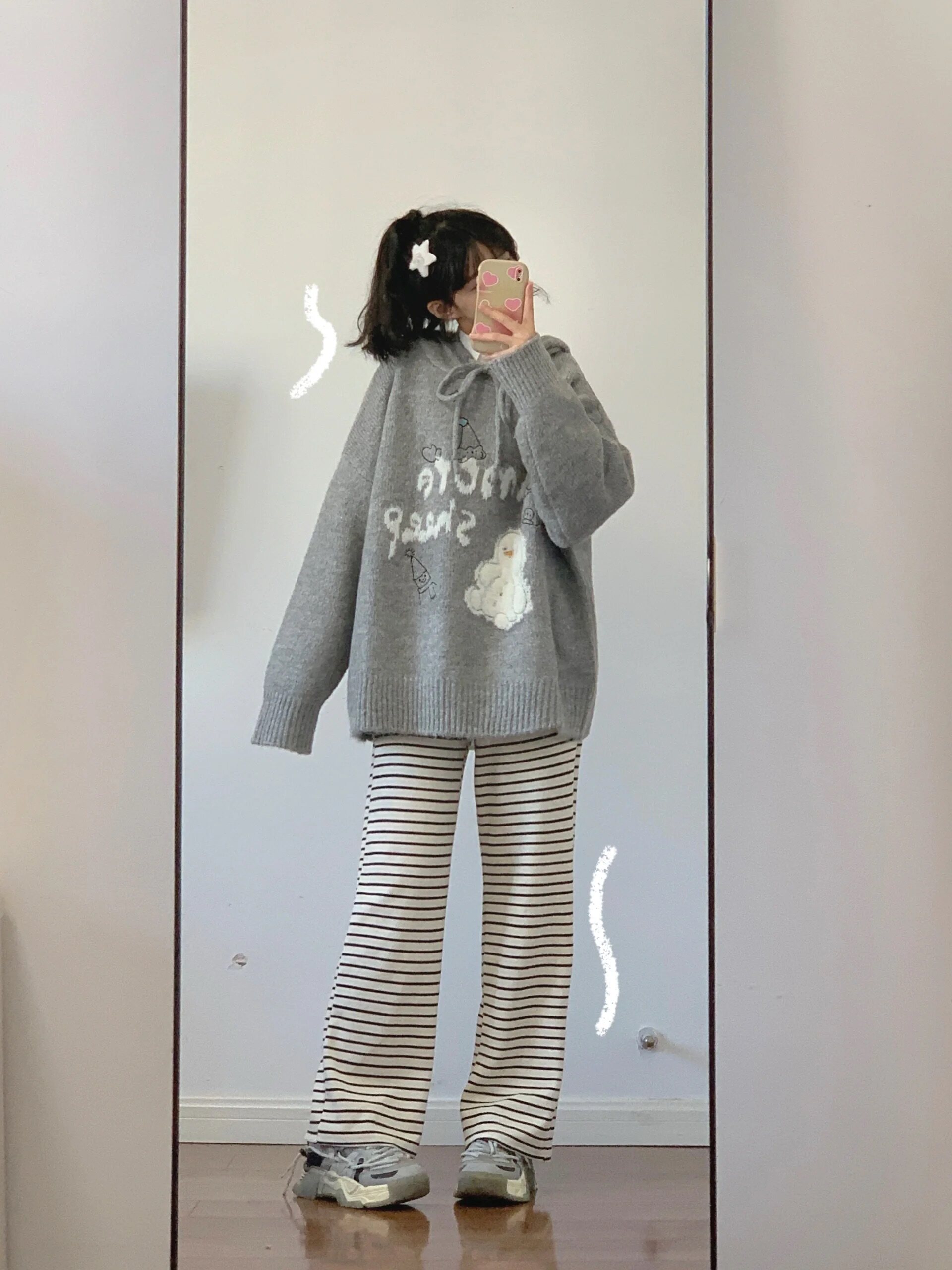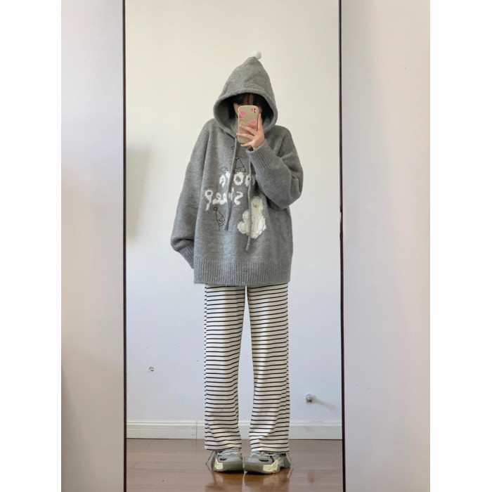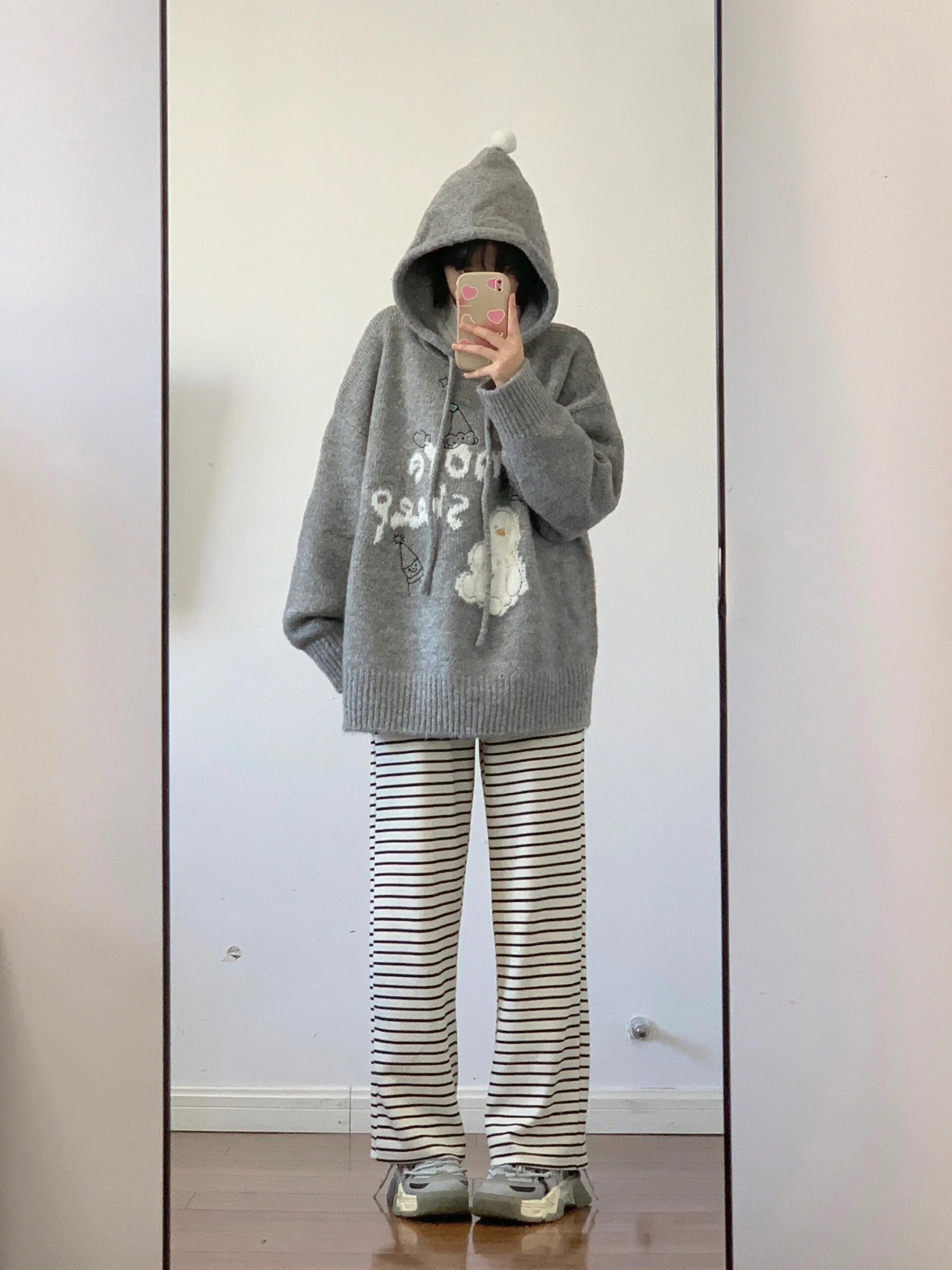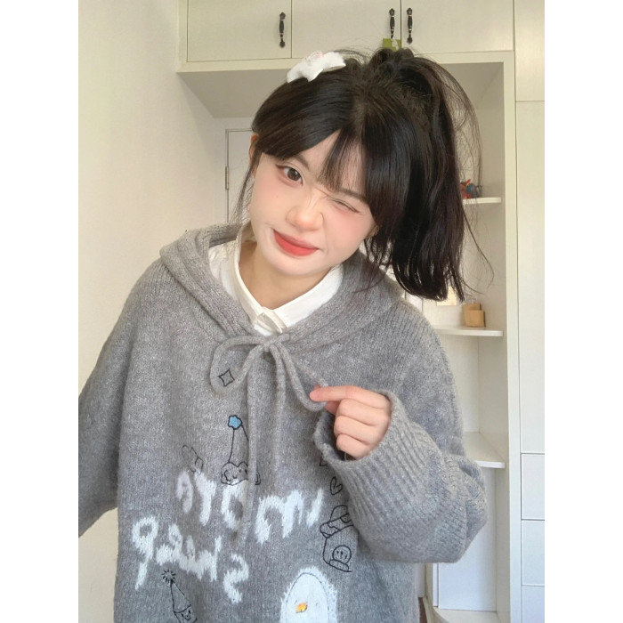 慵懶風灰色卡通連帽外穿毛衣女秋季新款韓版寬松套頭針織衫衛衣冬