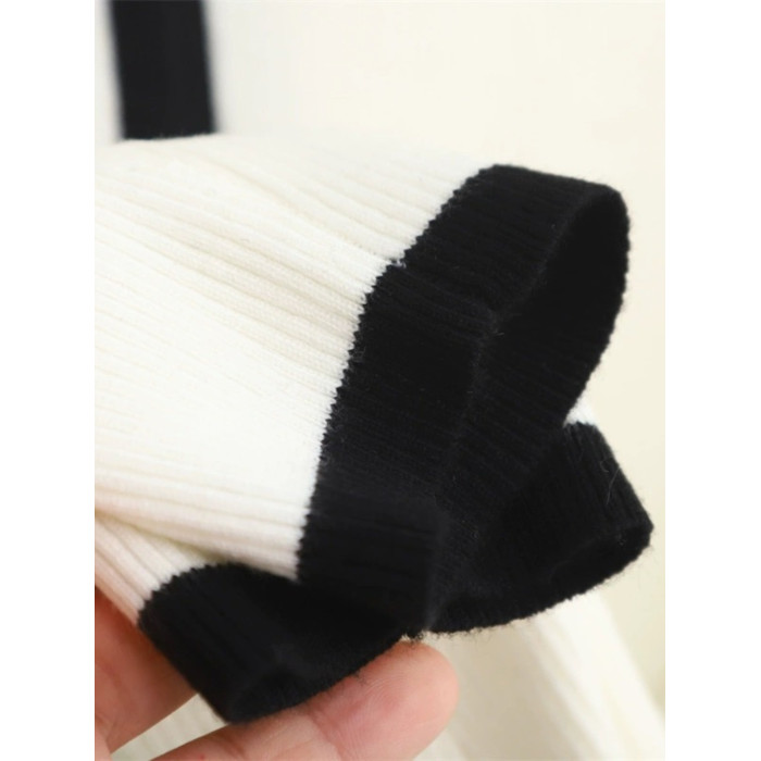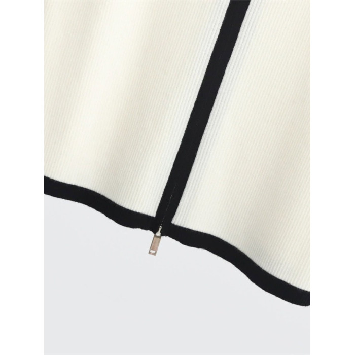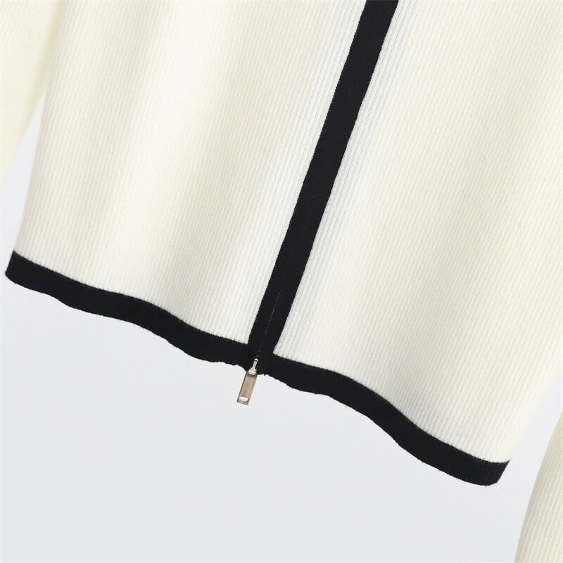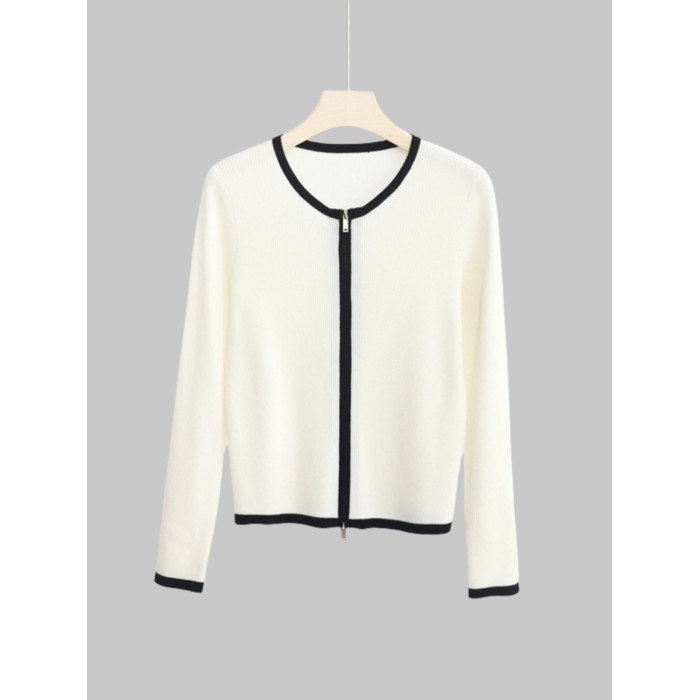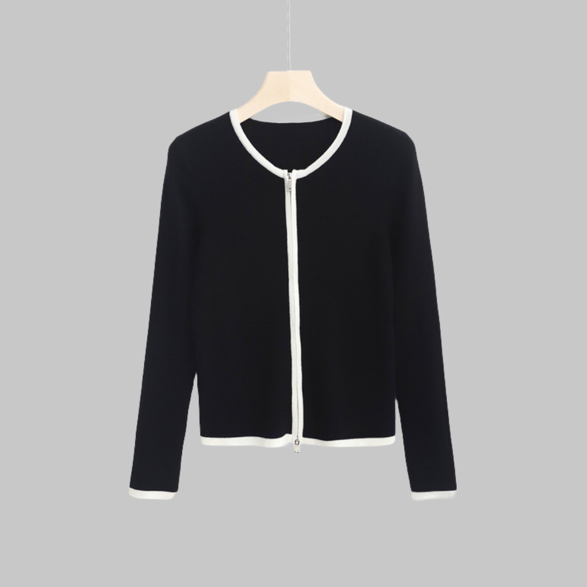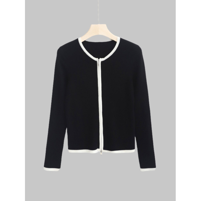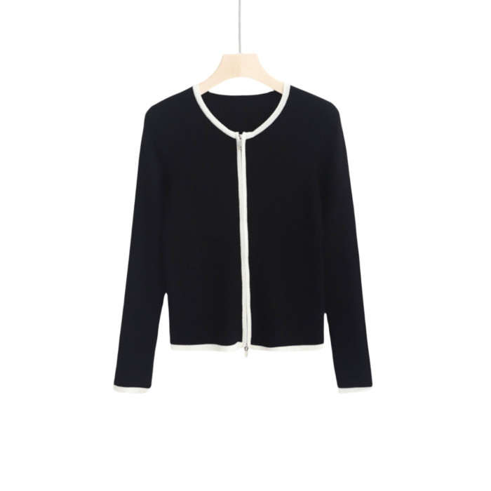 大洪官方嚴選店黑與白春季新款羊毛拉鍊開衫女內搭針織衫顯瘦上衣