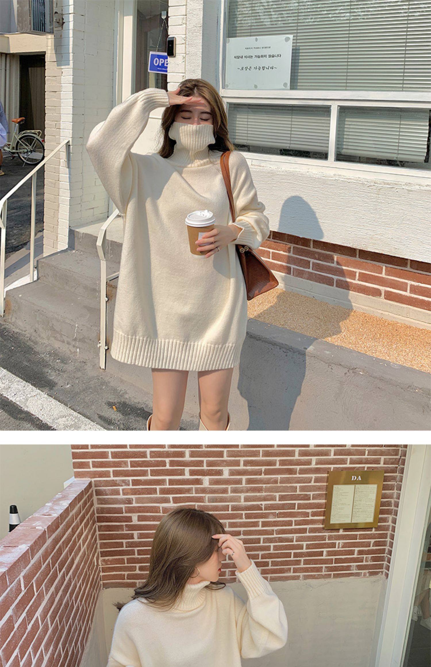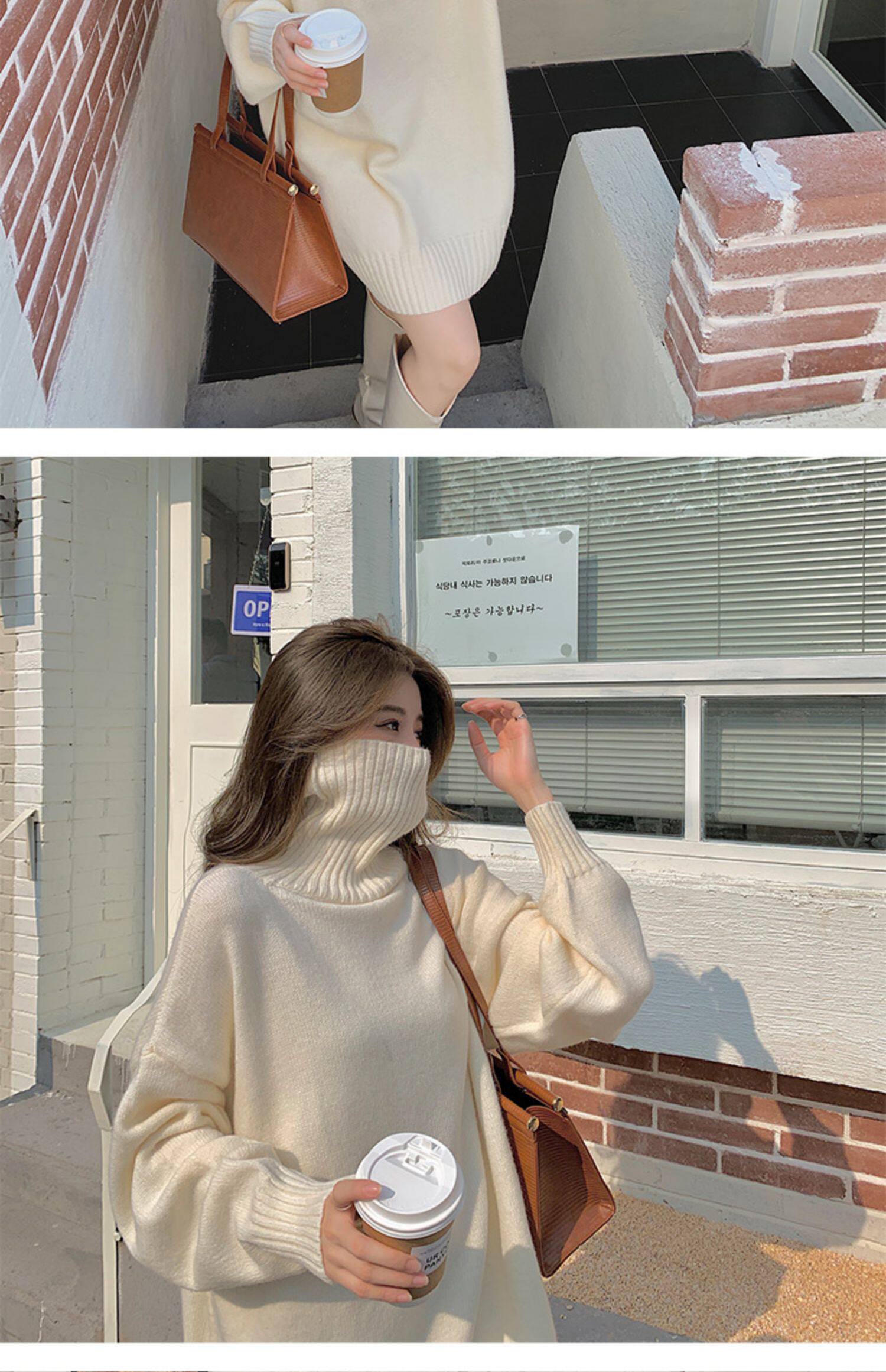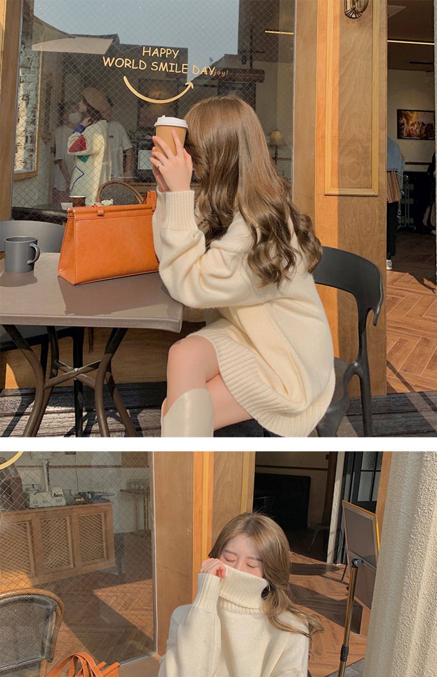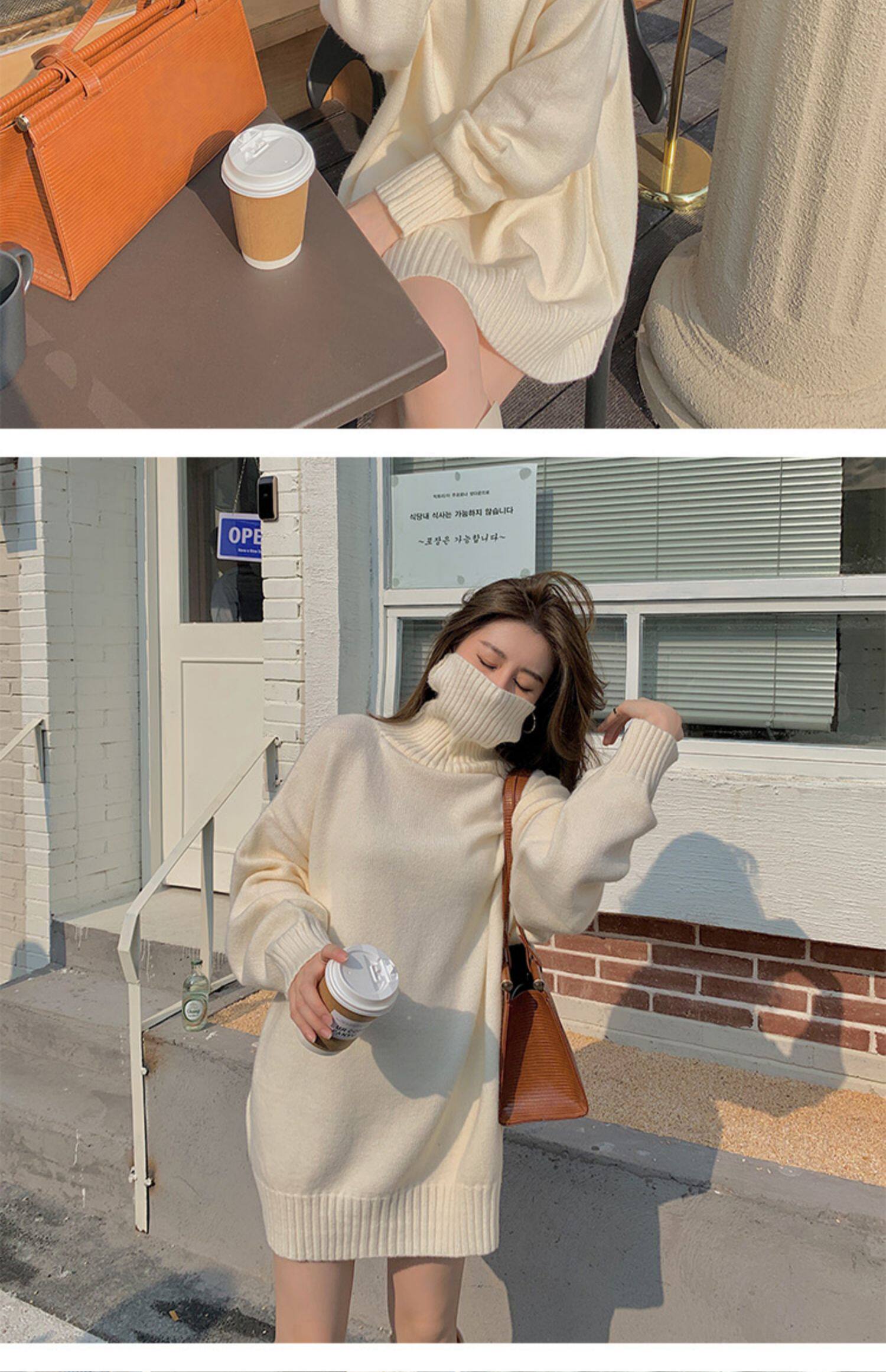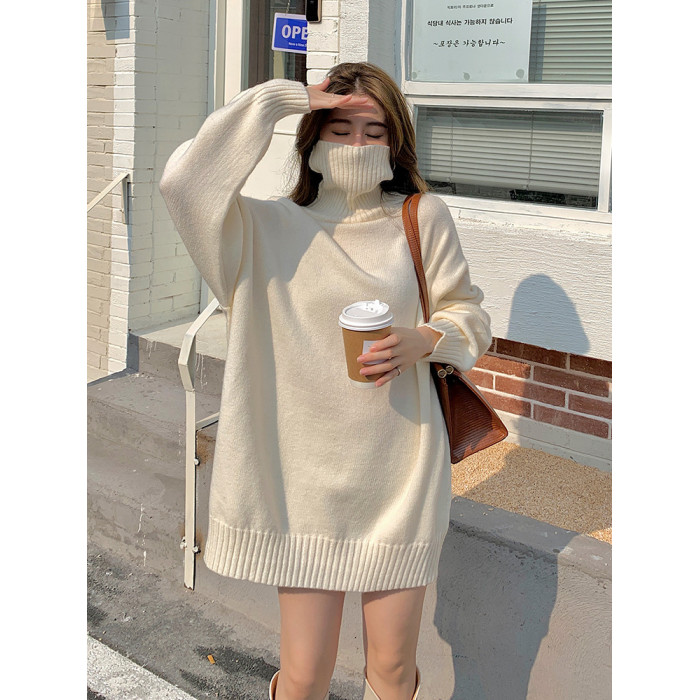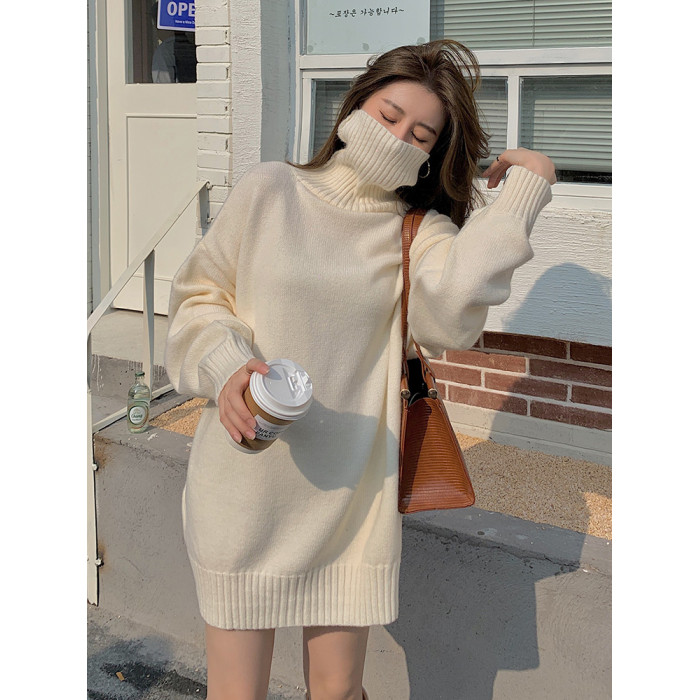 中長款高領毛衣連衣裙女白色秋冬寬松慵懶軟糯打底針織衫內搭加厚