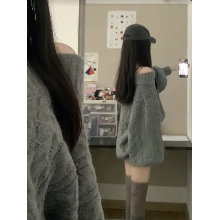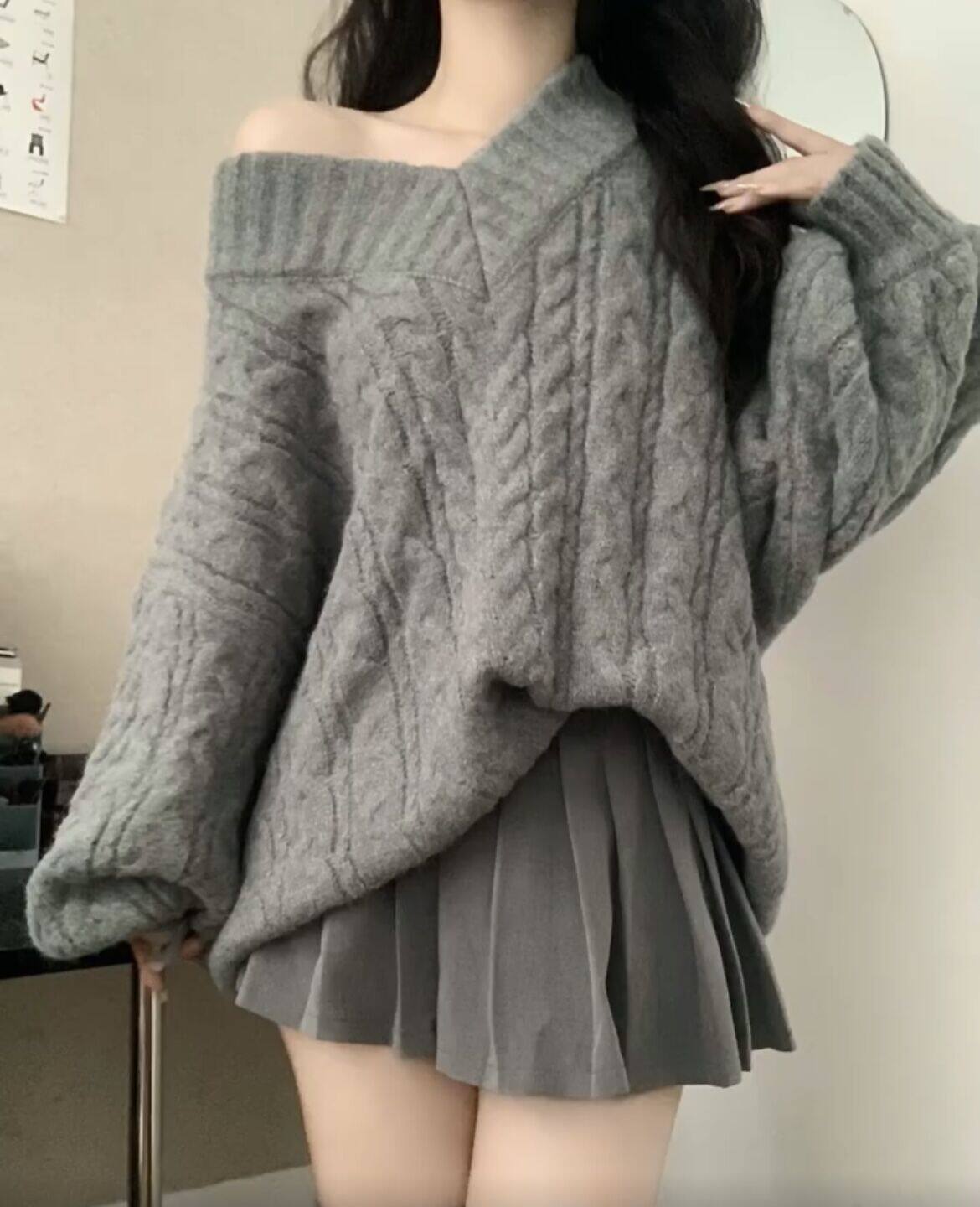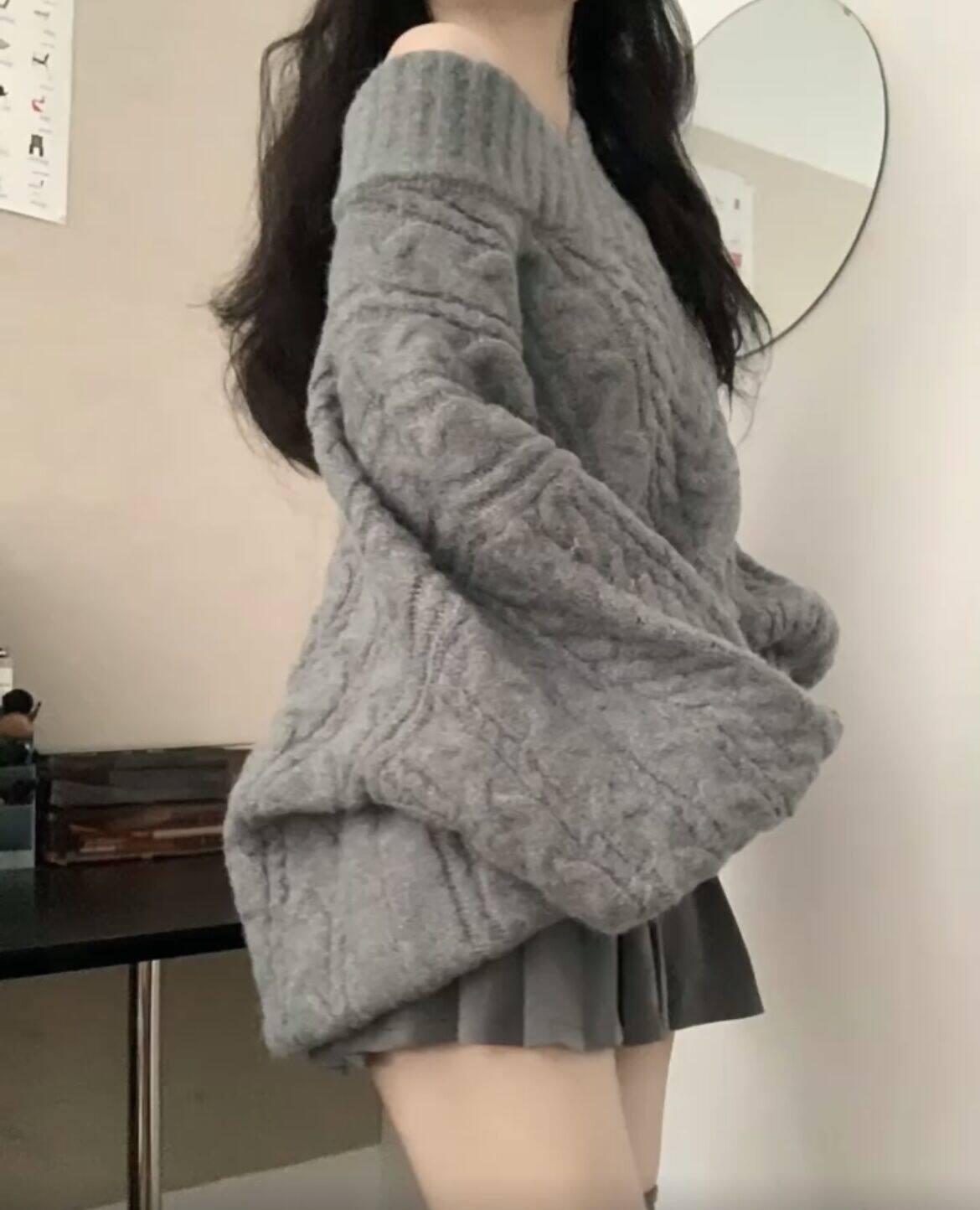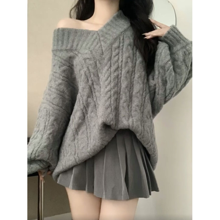 秋冬2025新款灰色麻花套頭毛衣女復古懶惰風寬松V領針織衫JK上衣