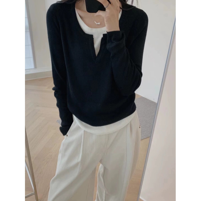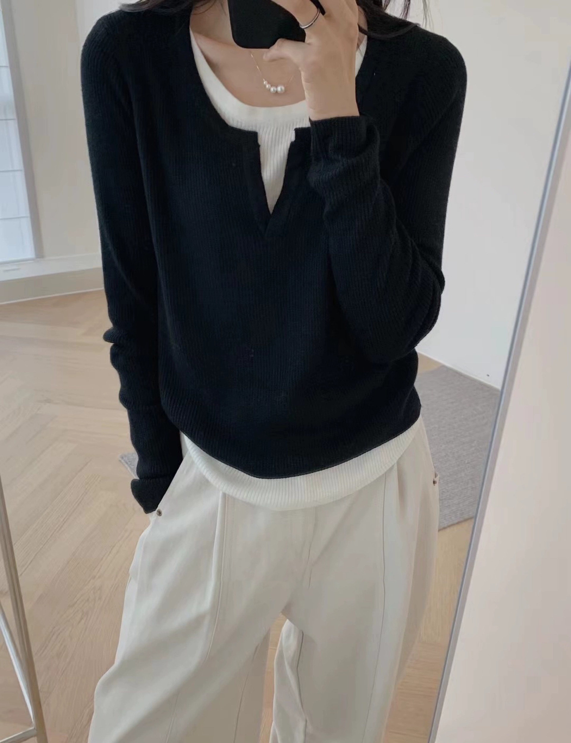 美式V領假兩件針織毛衣女早春2025撞色拼接打底衫高級感坑條上衣