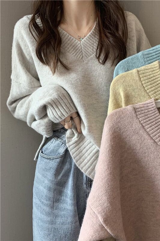 大碼胖妹妹V領毛衣女寬松外穿上衣秋冬新款百搭慵懶風打底針織衫