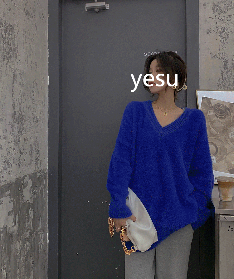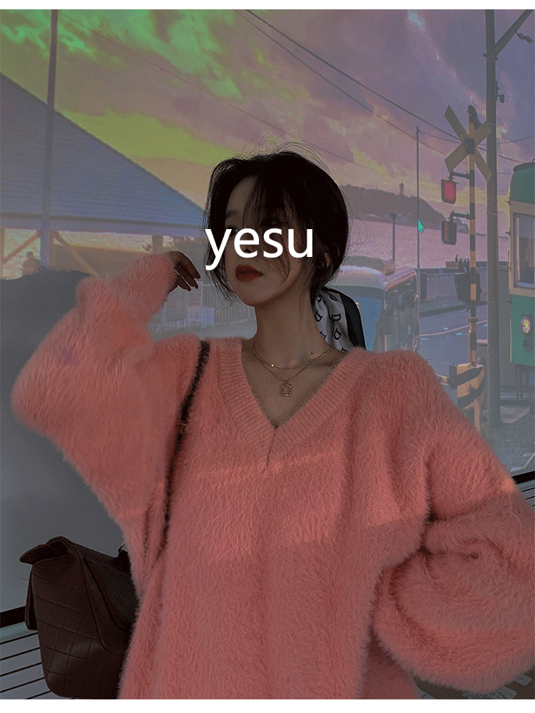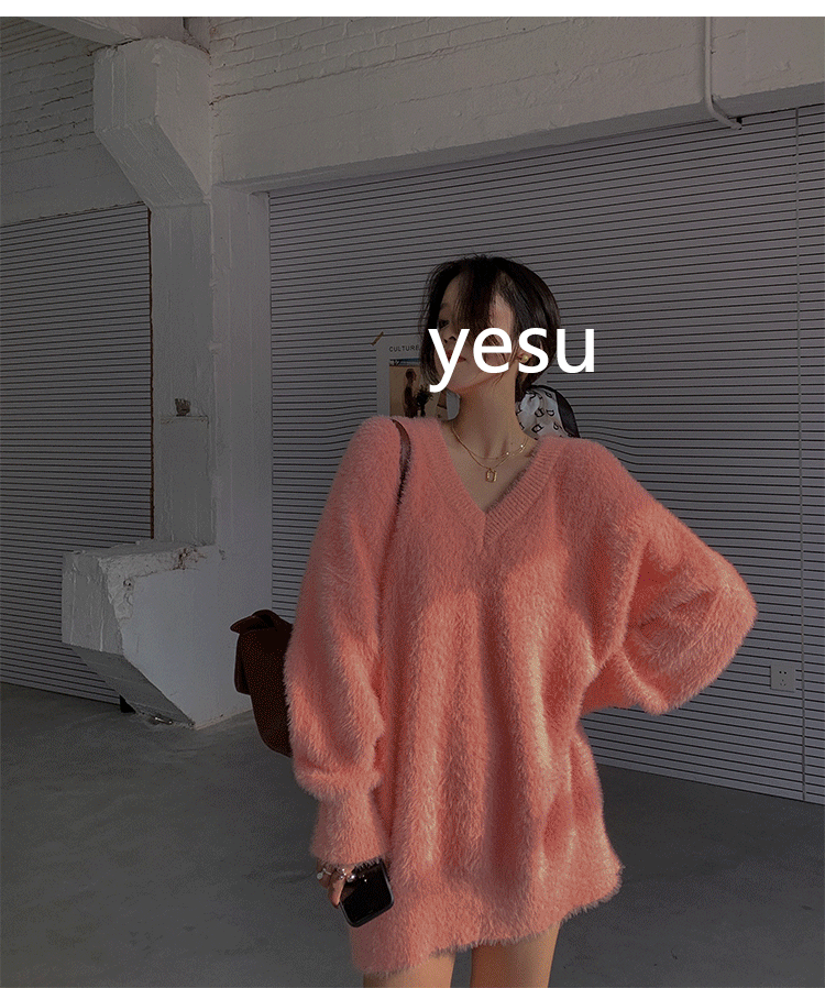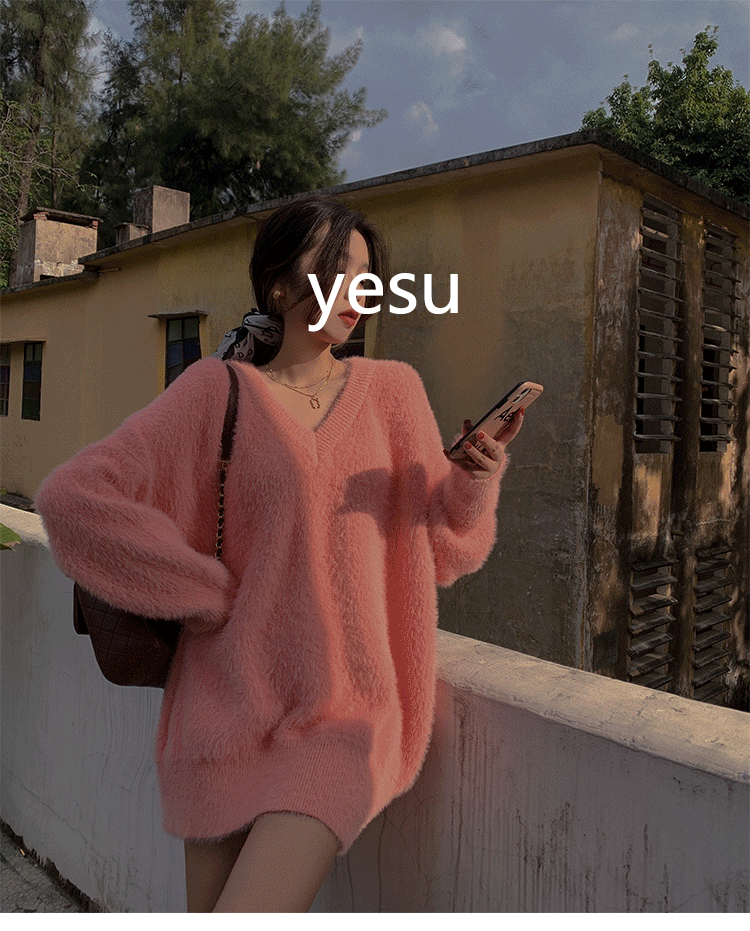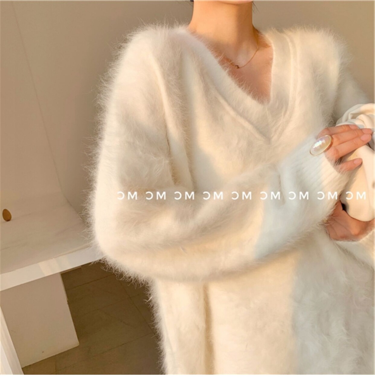 白色水貂絨v領軟糯內搭毛衣女裝2024秋冬新款外穿寬松慵懶中長款