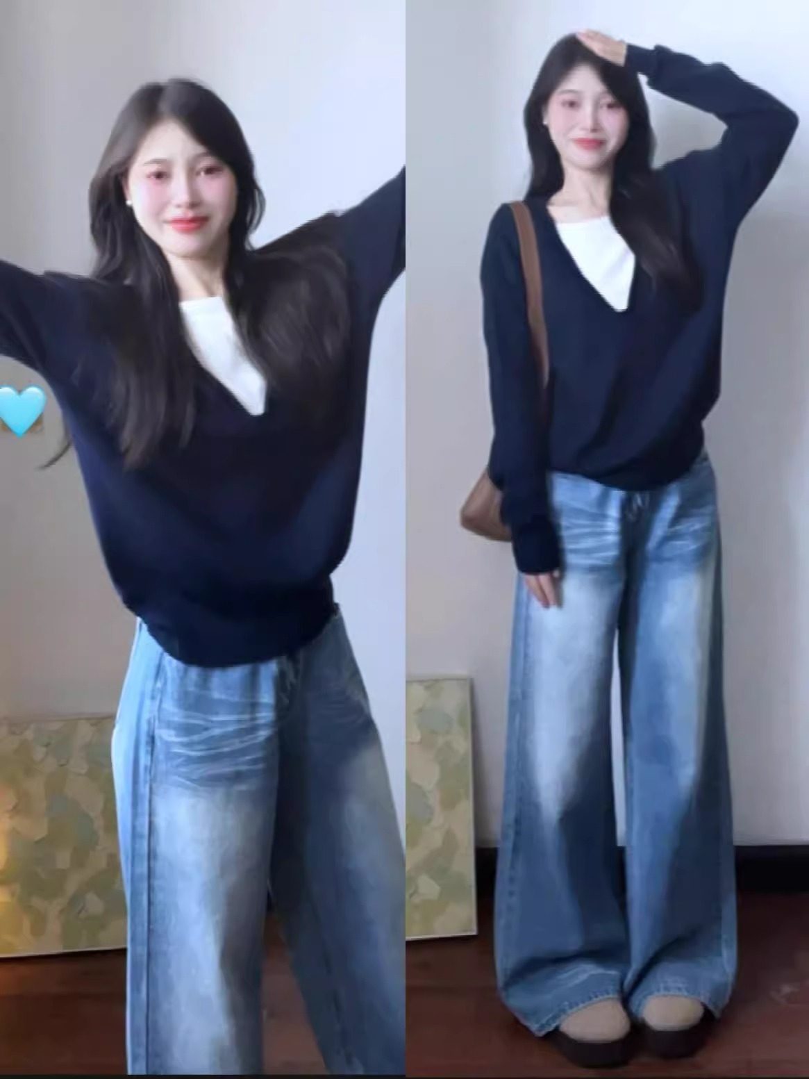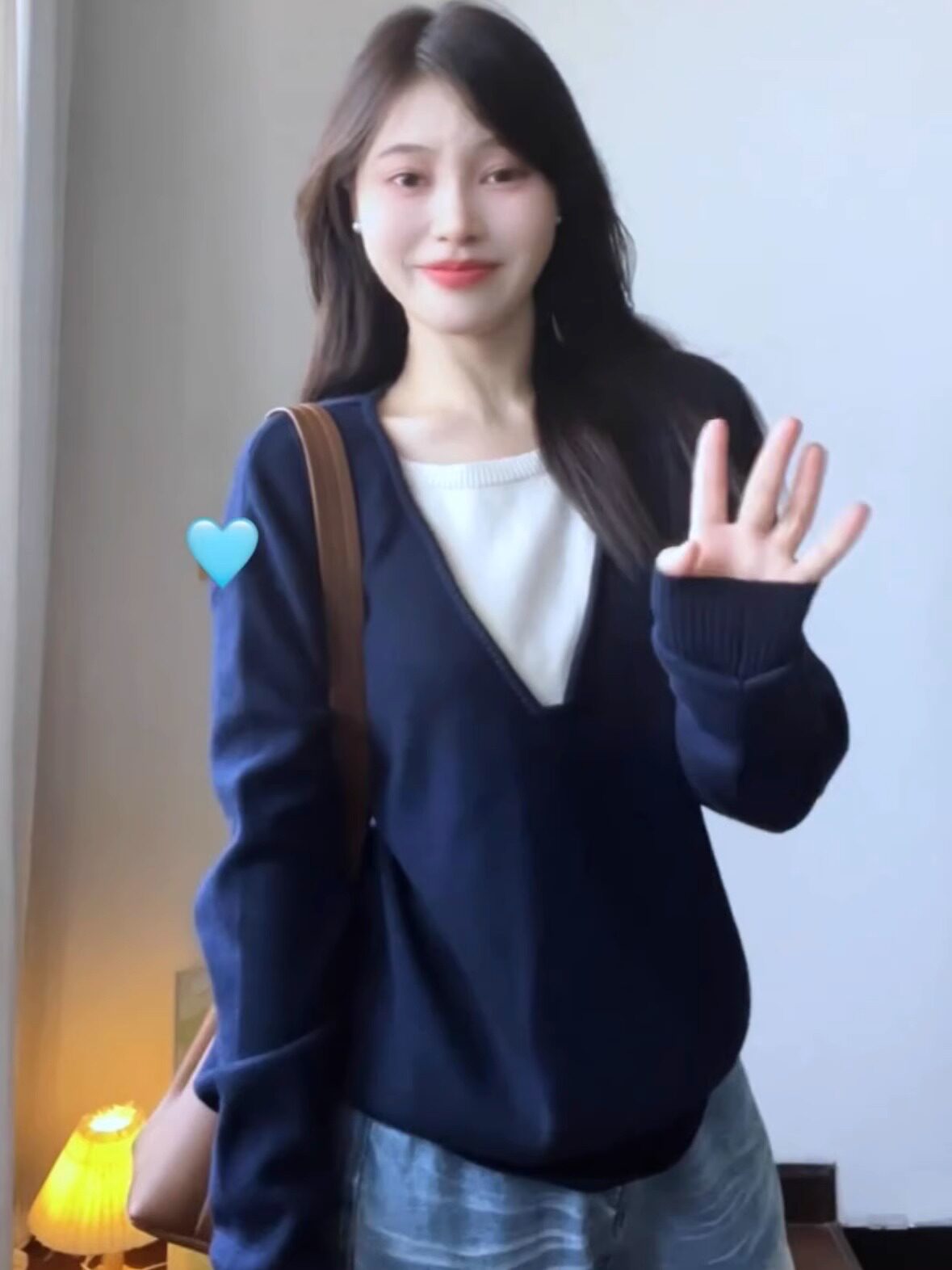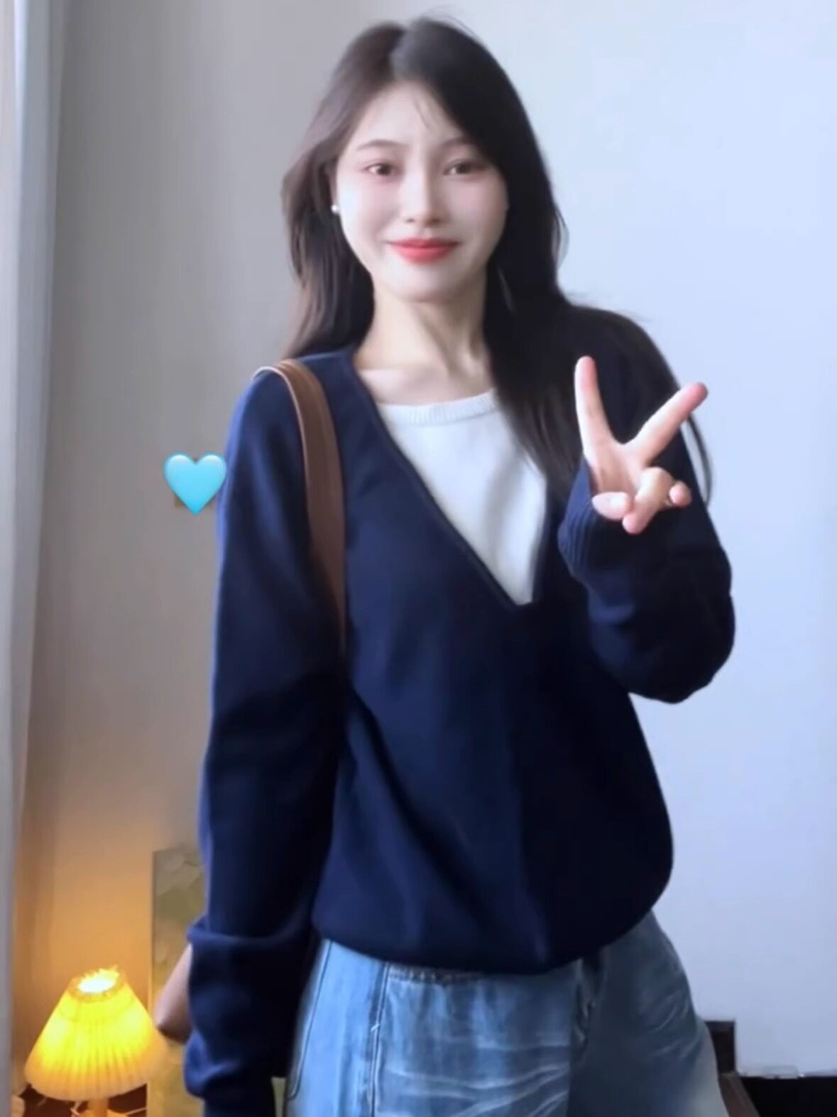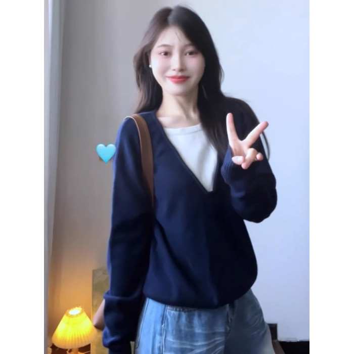 藍色假兩件針織衫上衣女2025新款早秋季設計感慵懶學院風長袖毛衣