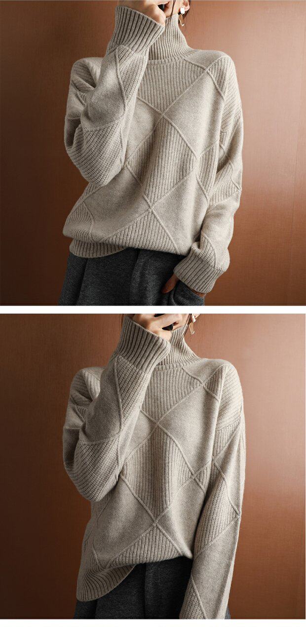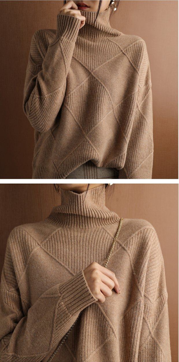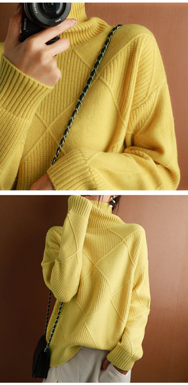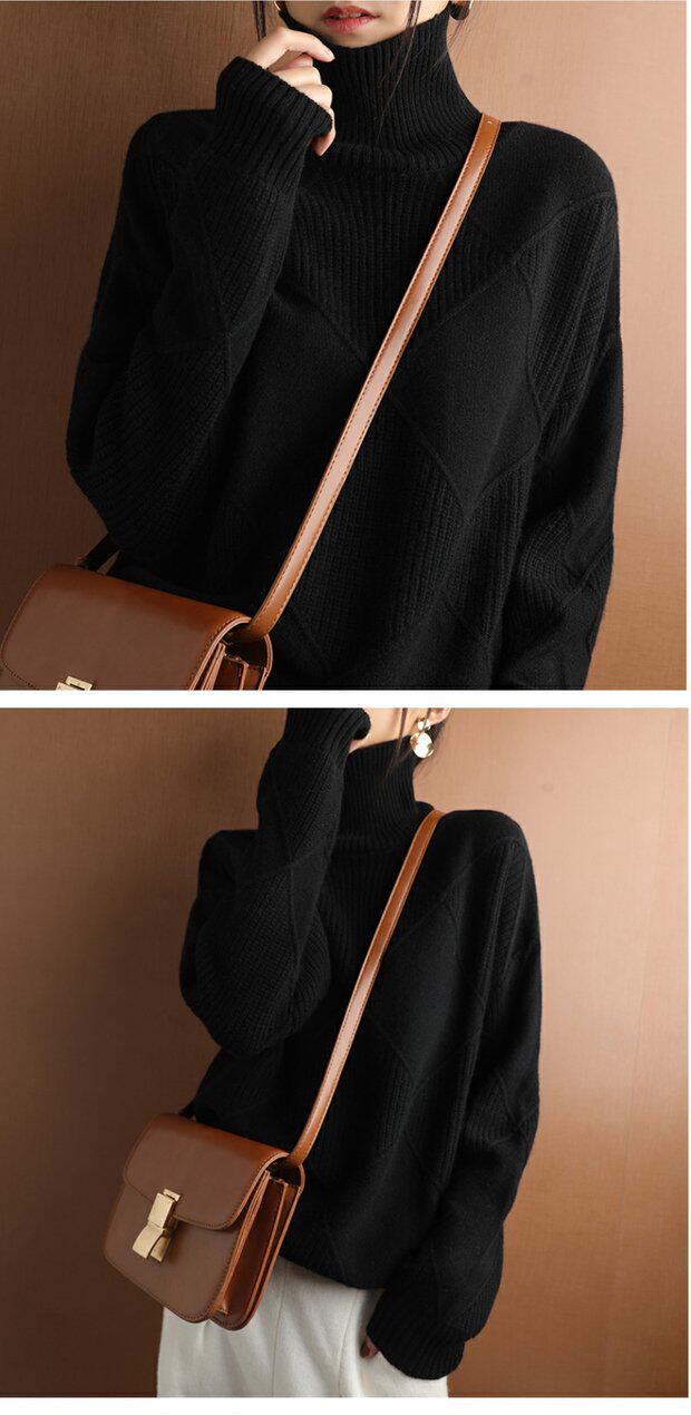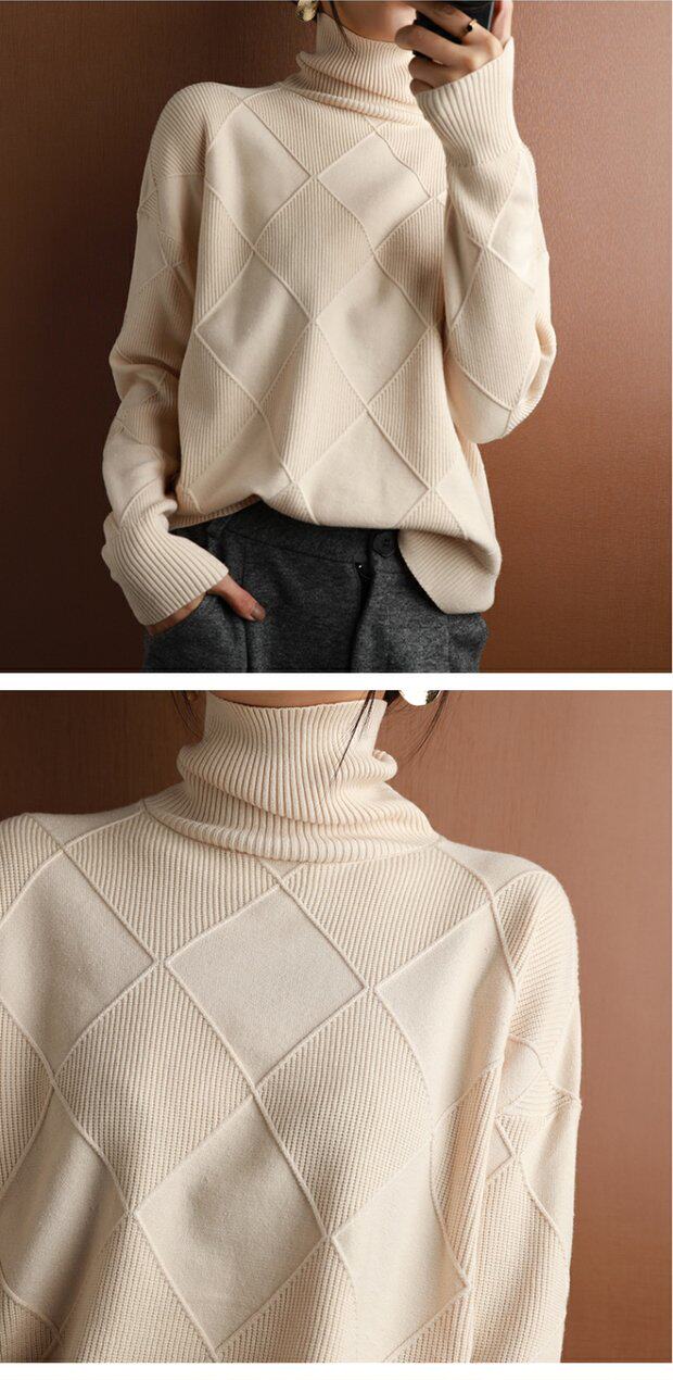 秋冬款毛衣女高領套頭菱形羊毛衫百搭純色寬松慵懶打底衫套衫加厚