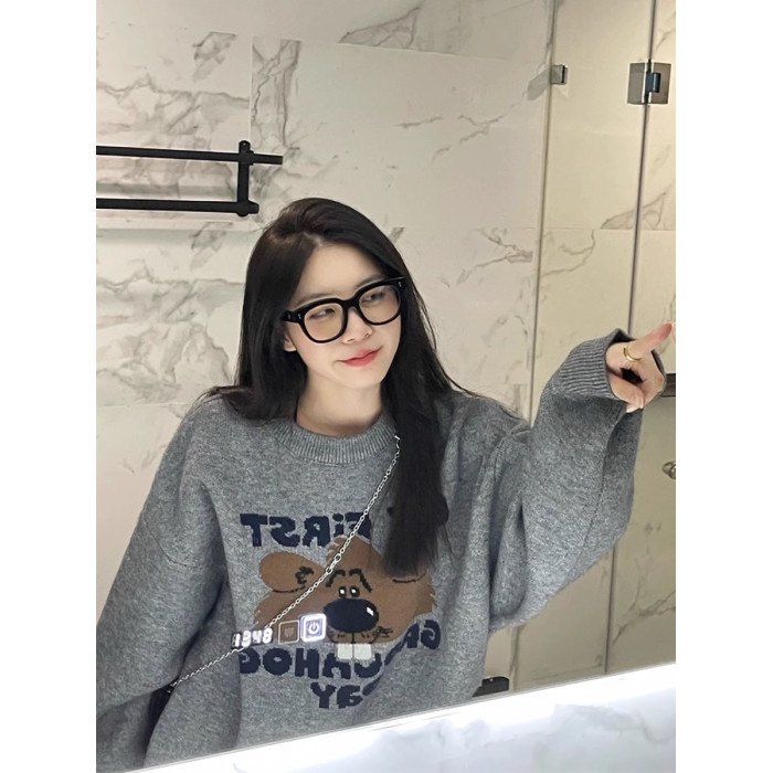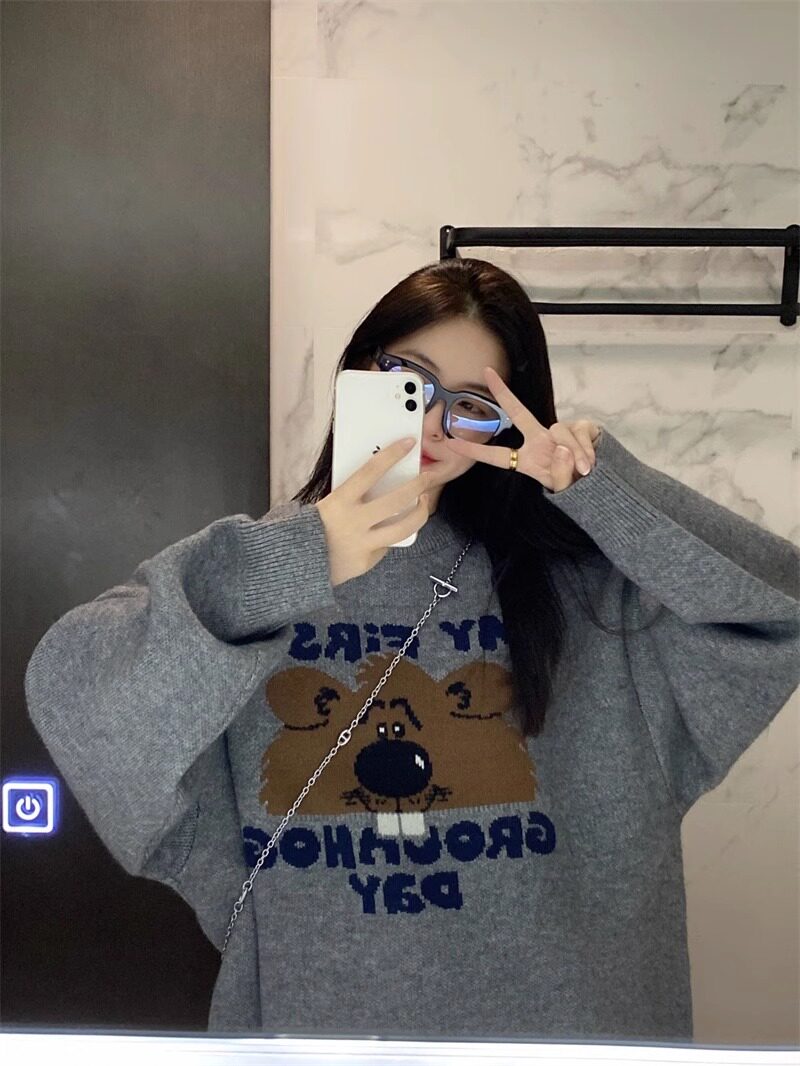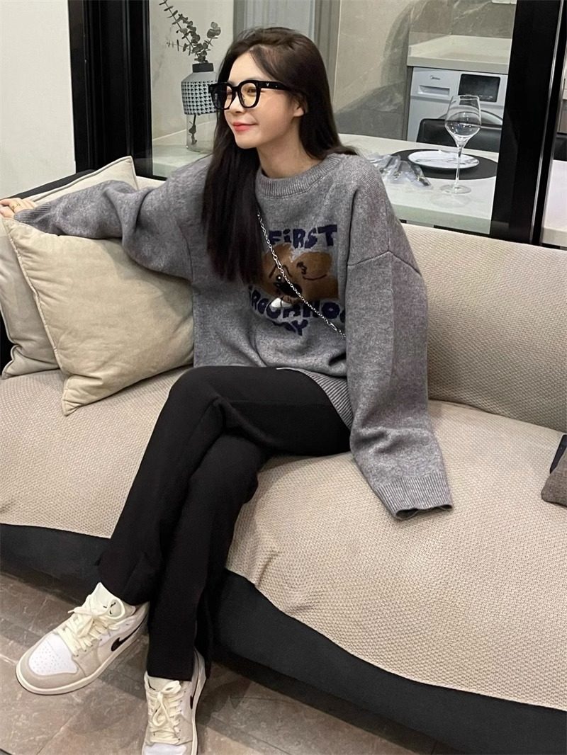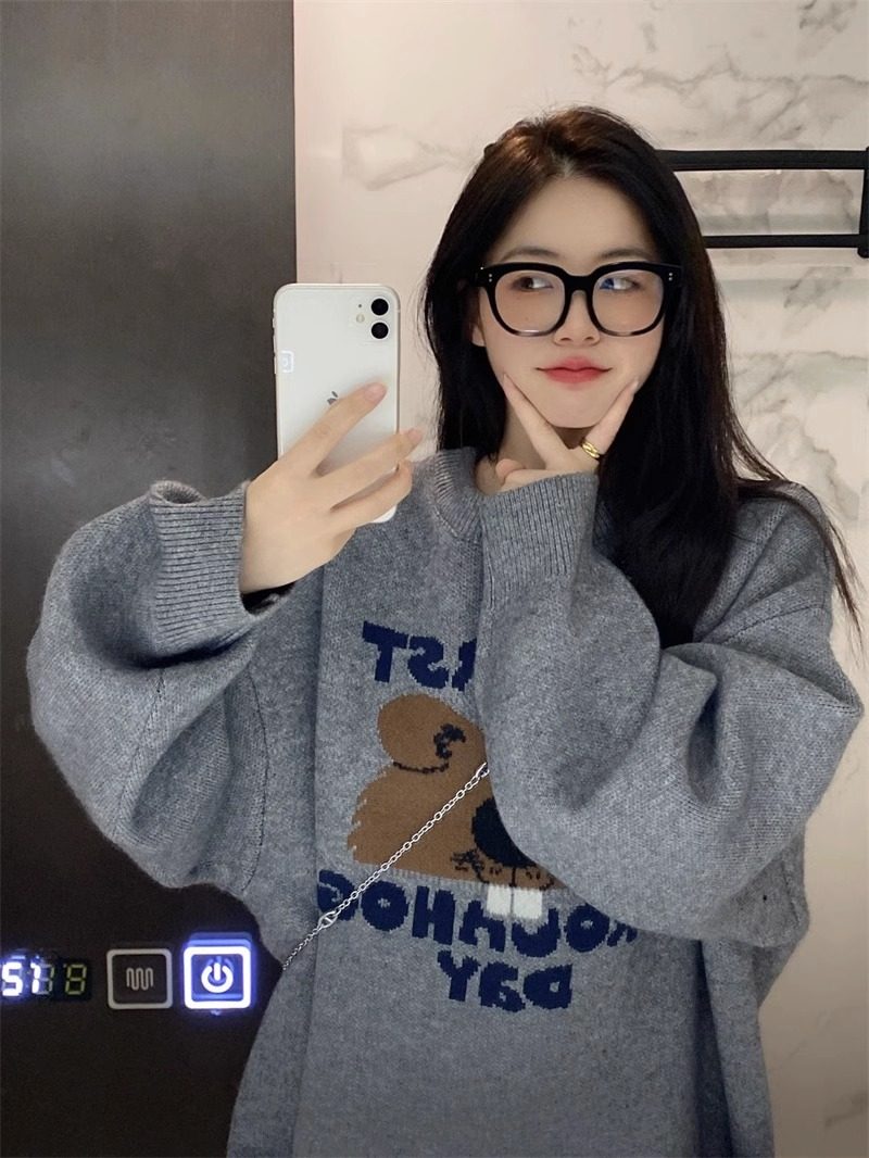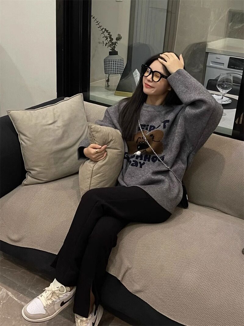 慵懶風長袖毛衣女裝秋季2025新款小熊提花寬松中長款外穿針織上衣