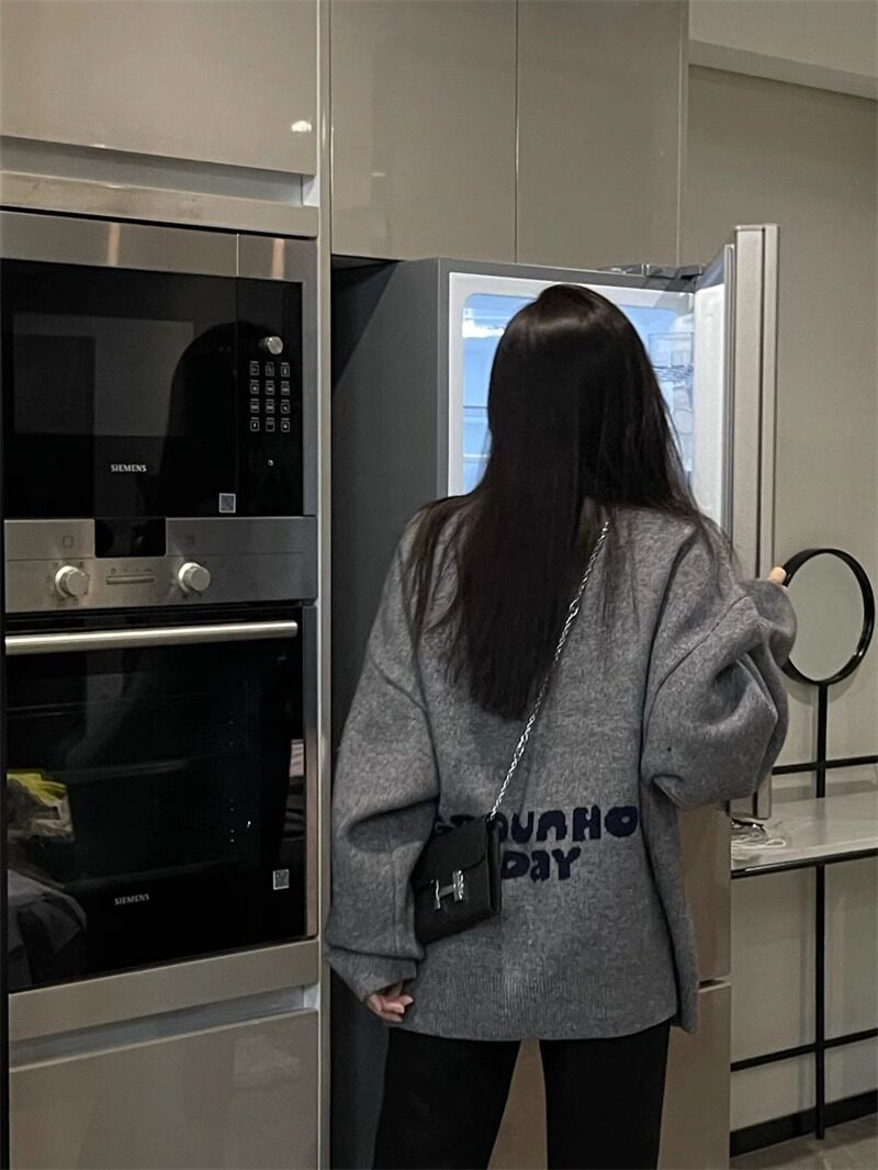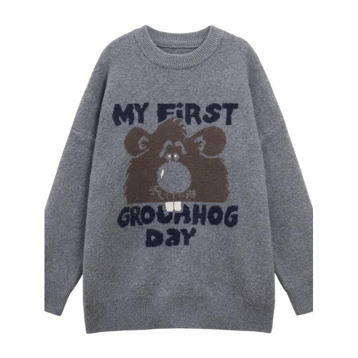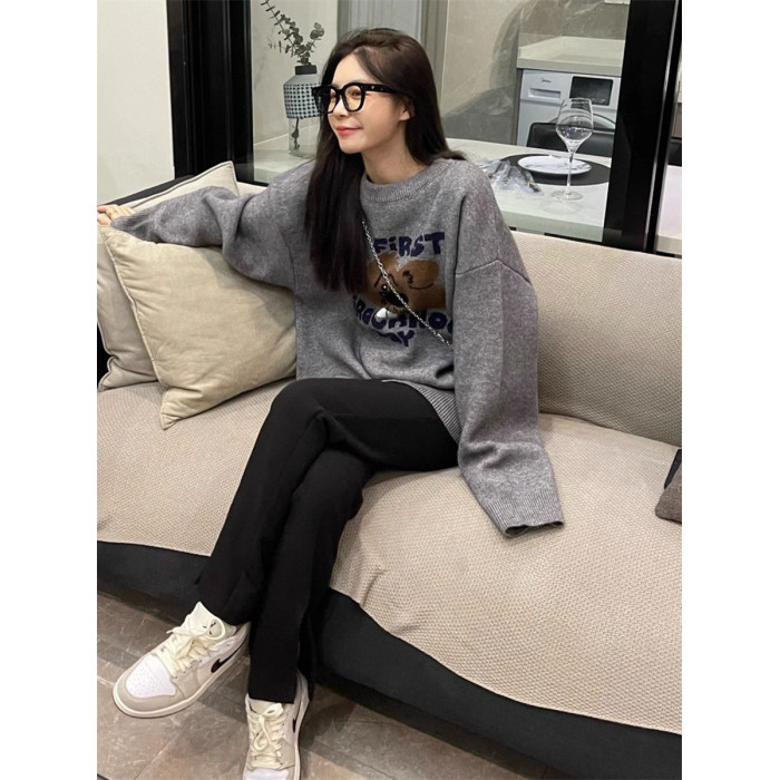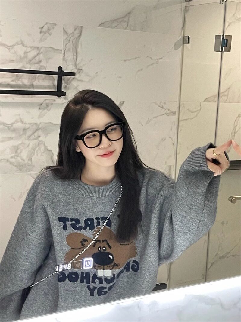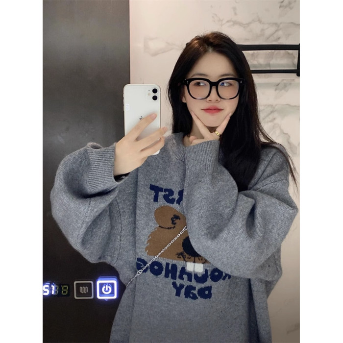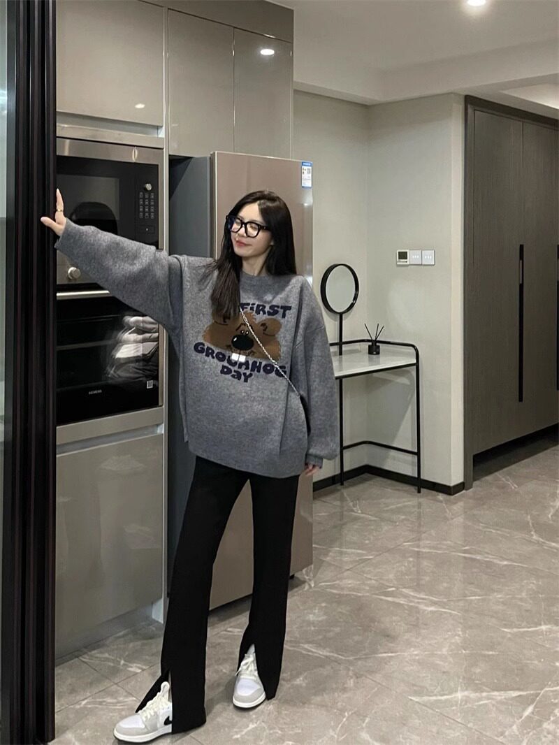 慵懶風長袖毛衣女裝秋季2025新款小熊提花寬松中長款外穿針織上衣
