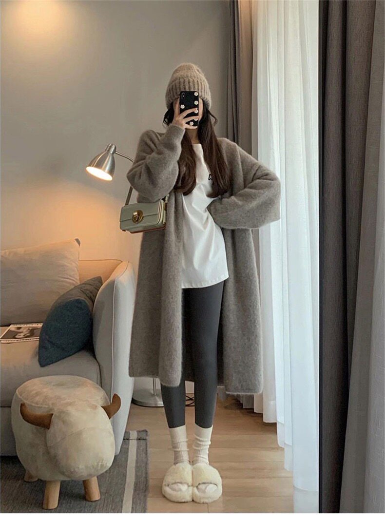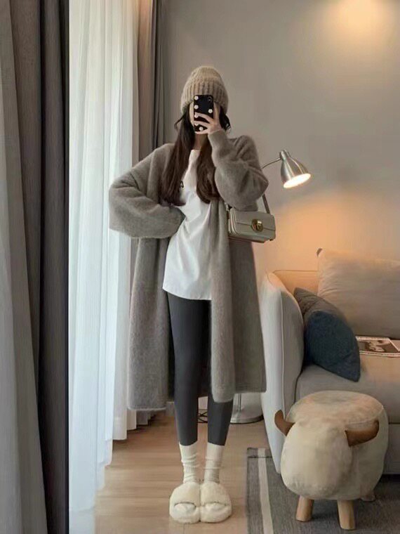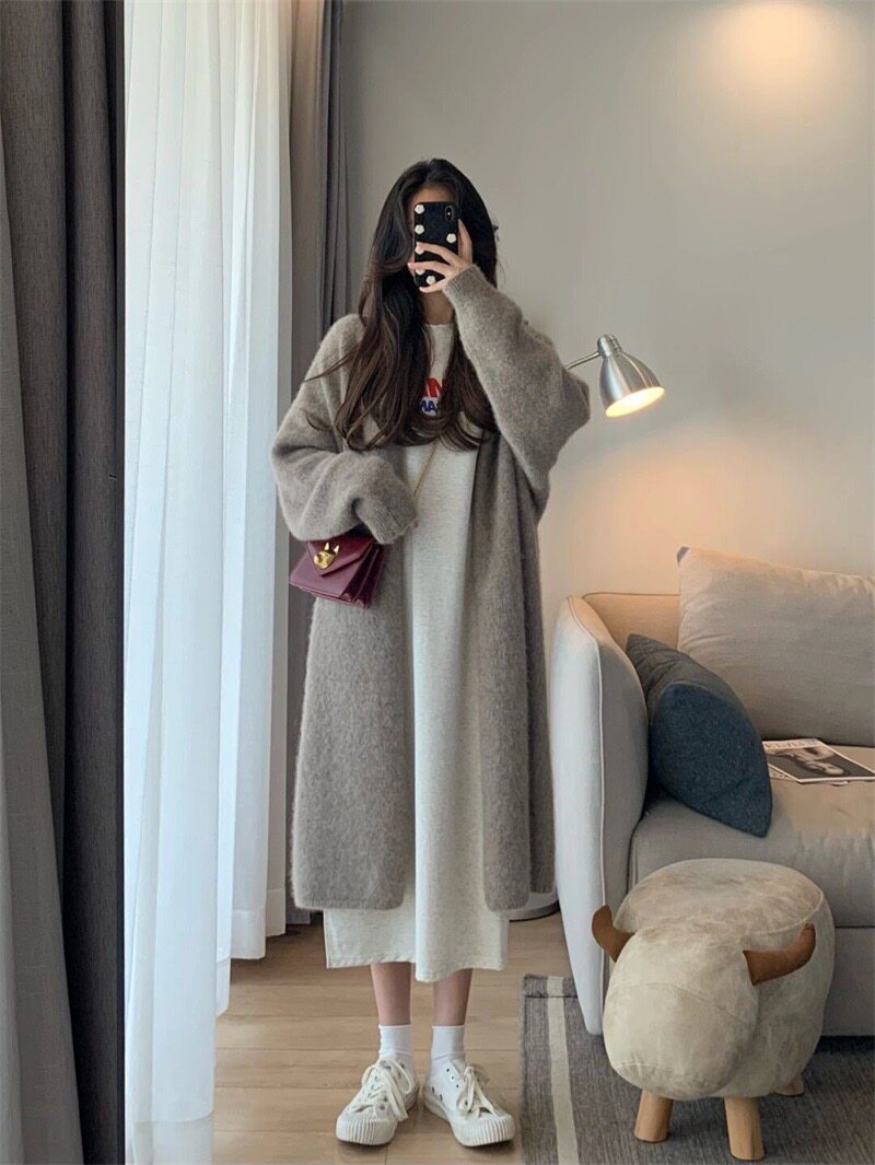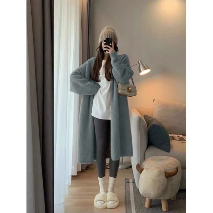 2024秋冬新款毛衣女寬松慵懶風針織加厚早秋開衫中長款過膝長外套