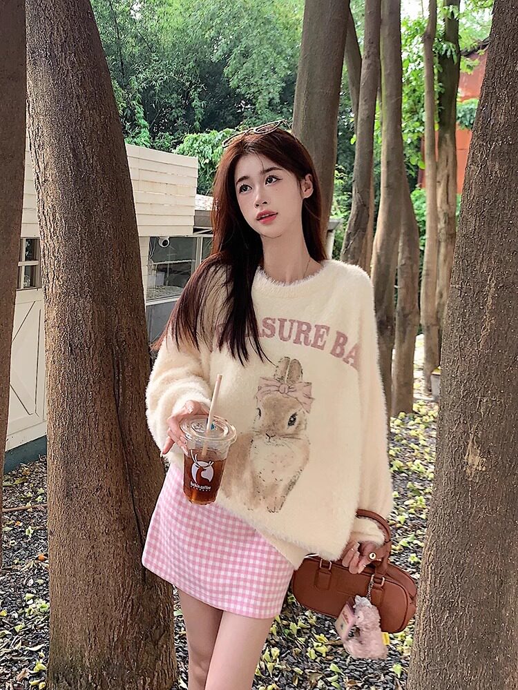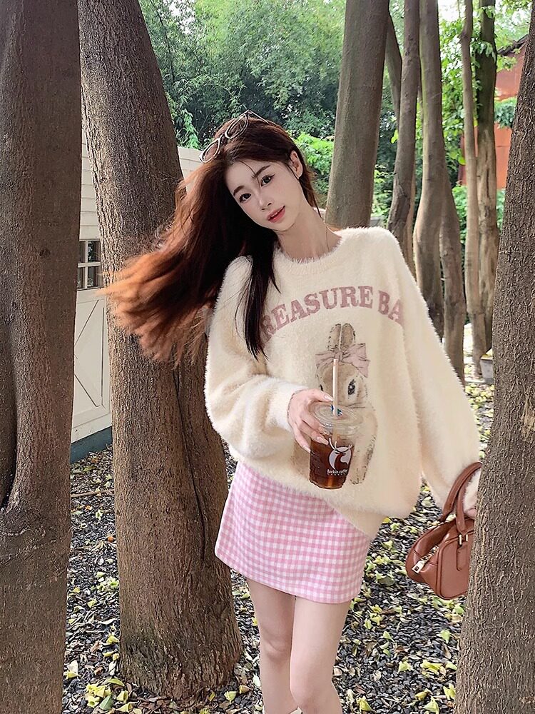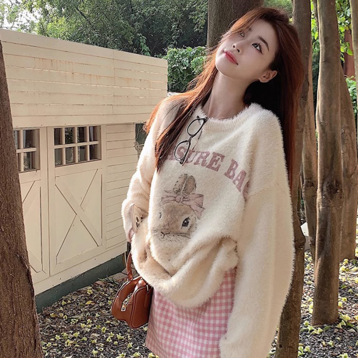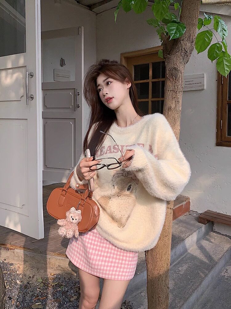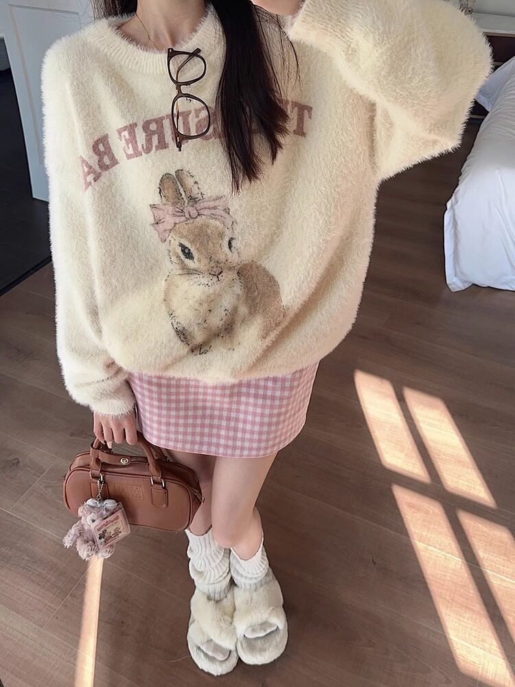 奶fufu杏色水貂絨毛衣女軟糯寬松可愛兔子針織衫套頭甜美上衣秋冬