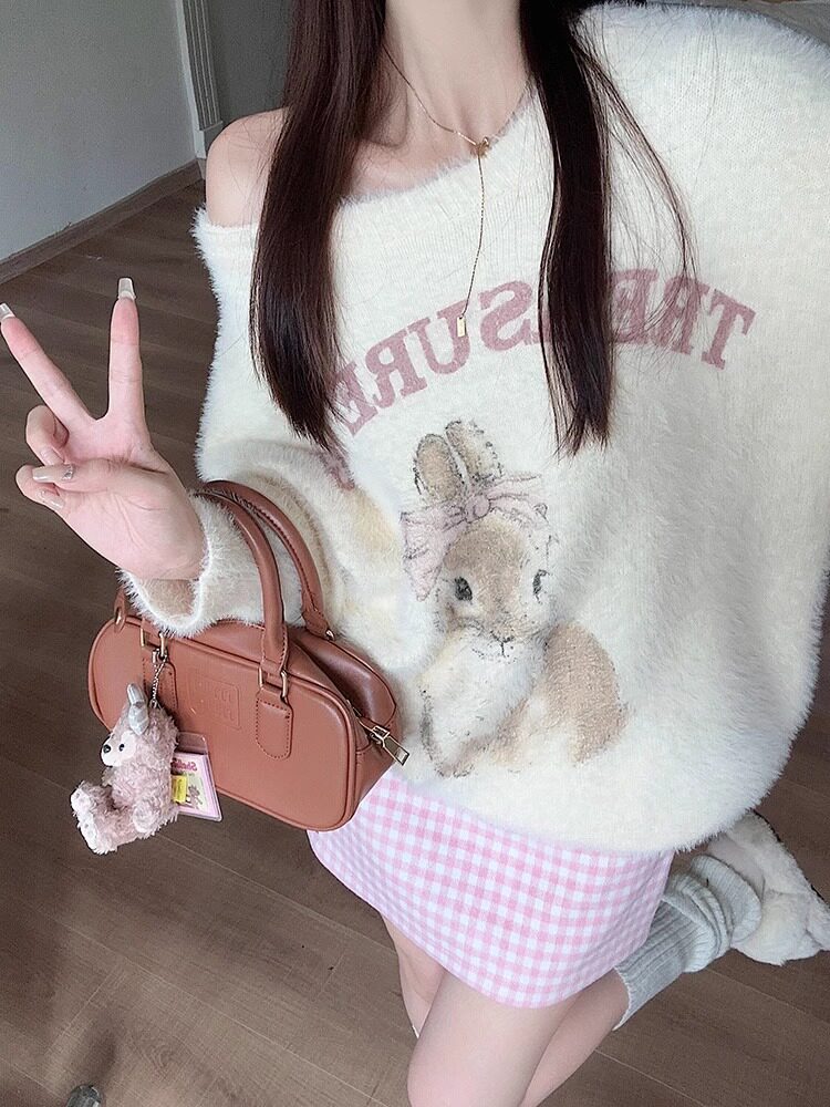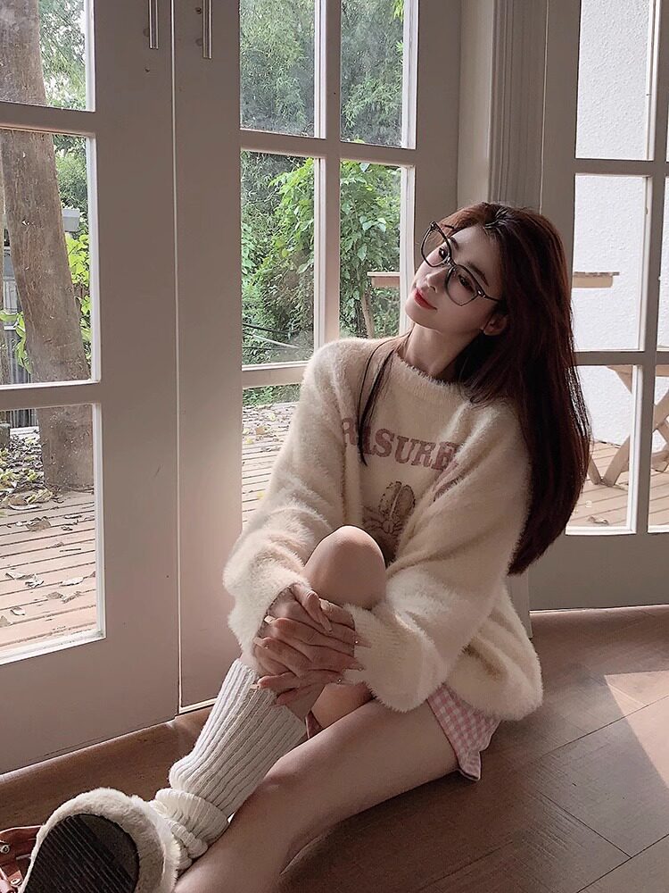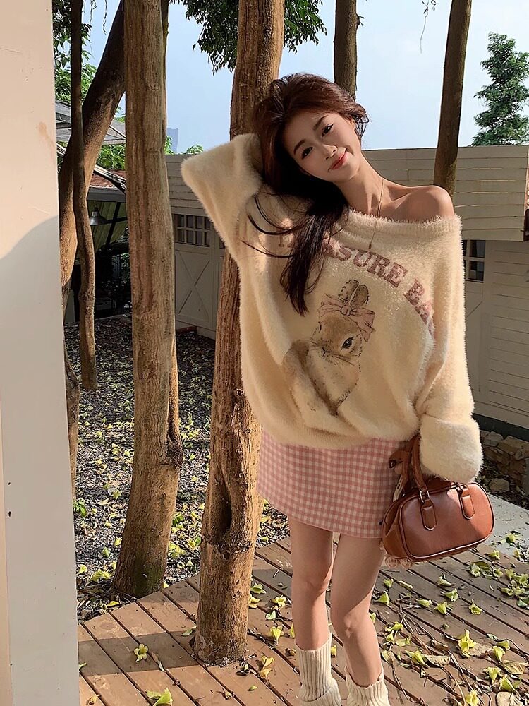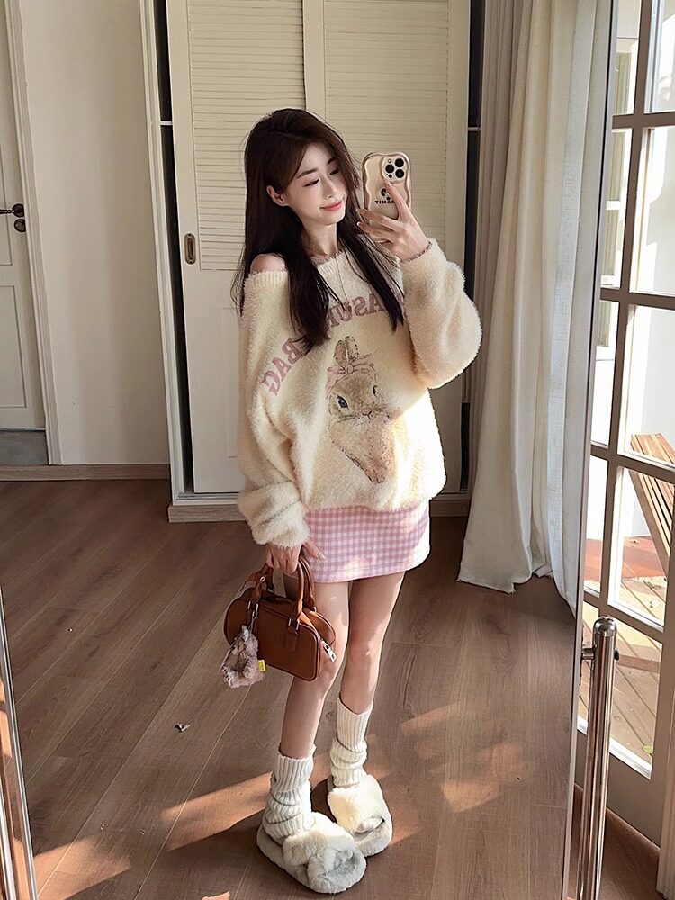 奶fufu杏色水貂絨毛衣女軟糯寬松可愛兔子針織衫套頭甜美上衣秋冬
