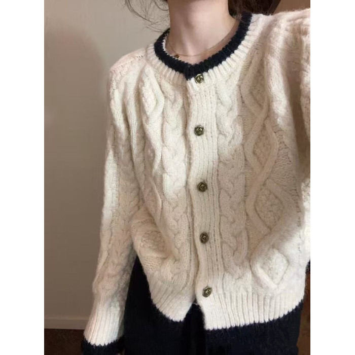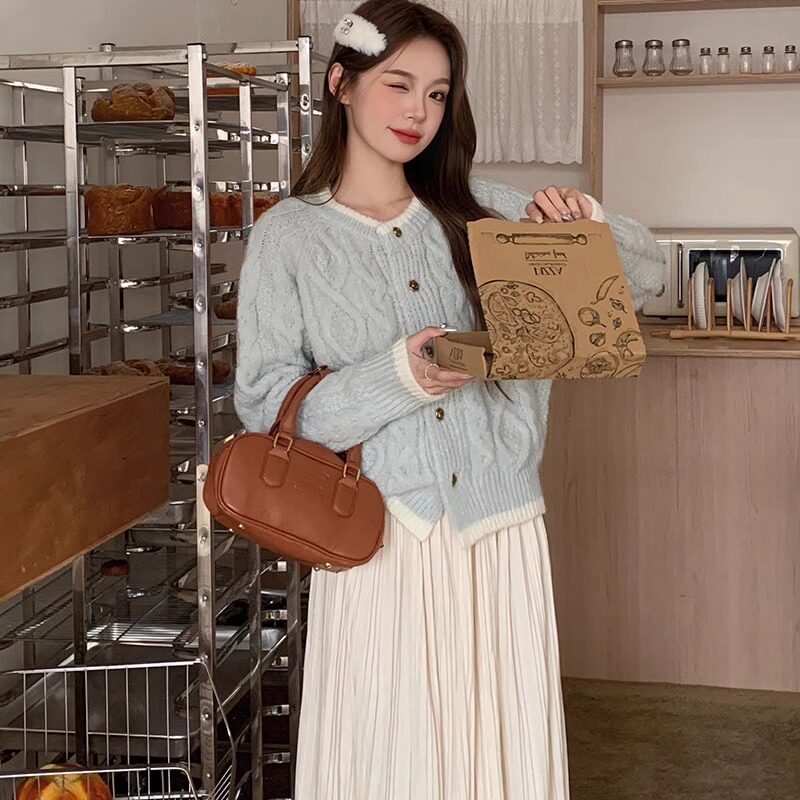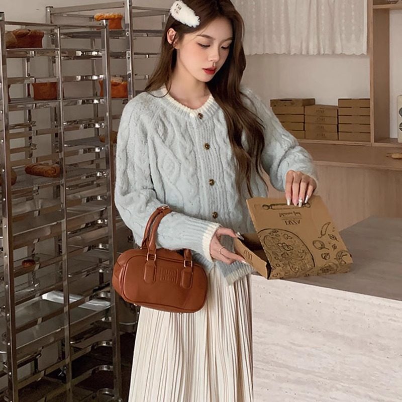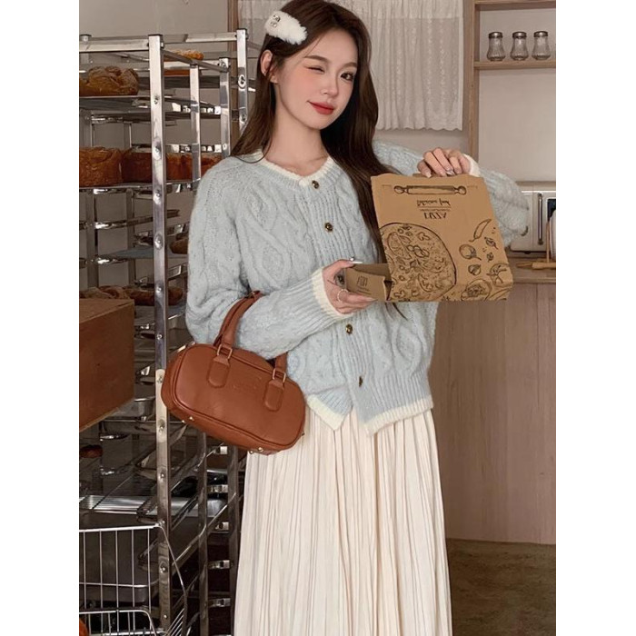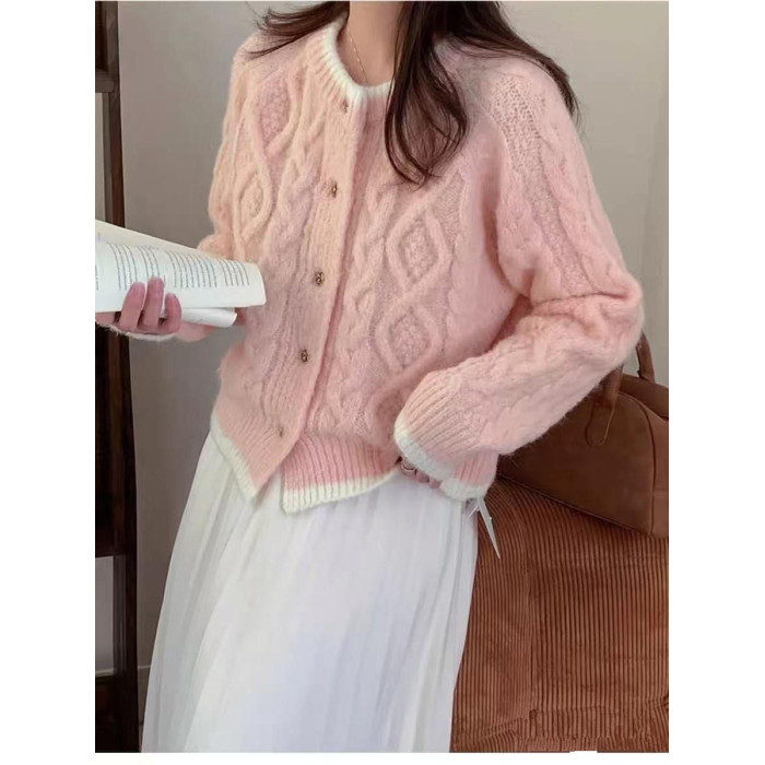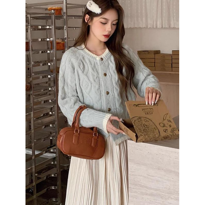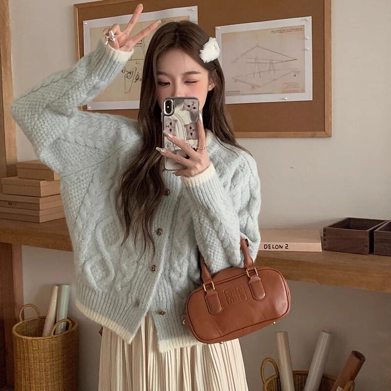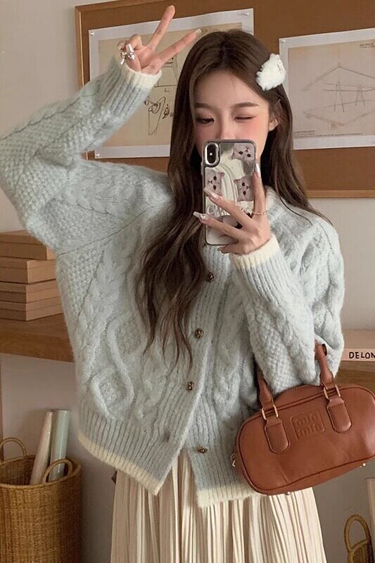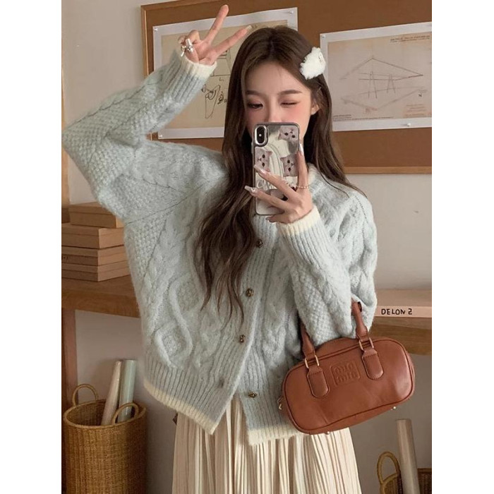 奶藍色浣熊絨麻花圓領毛衣外套女秋冬慵懶小個子加厚短款針織開衫