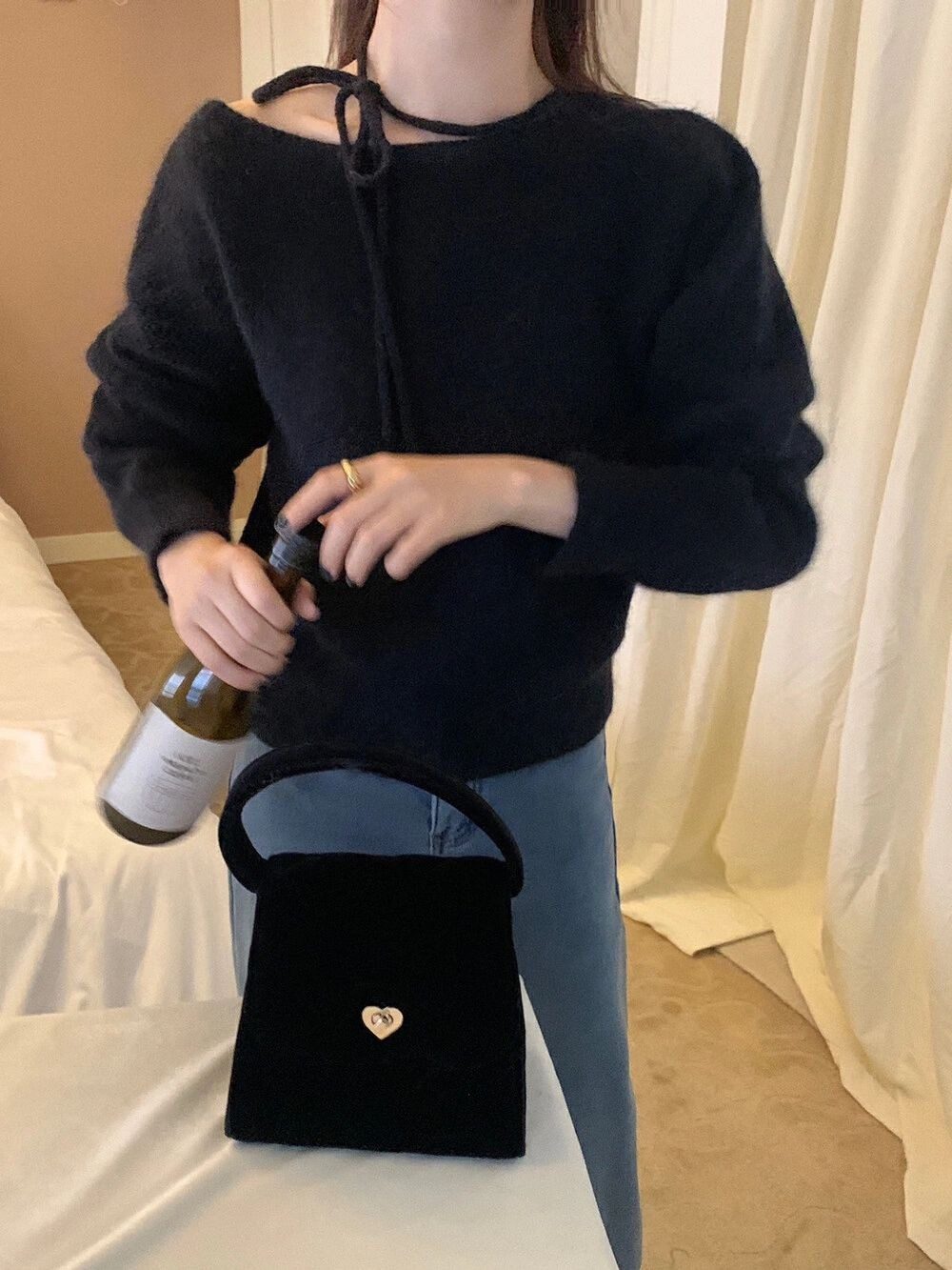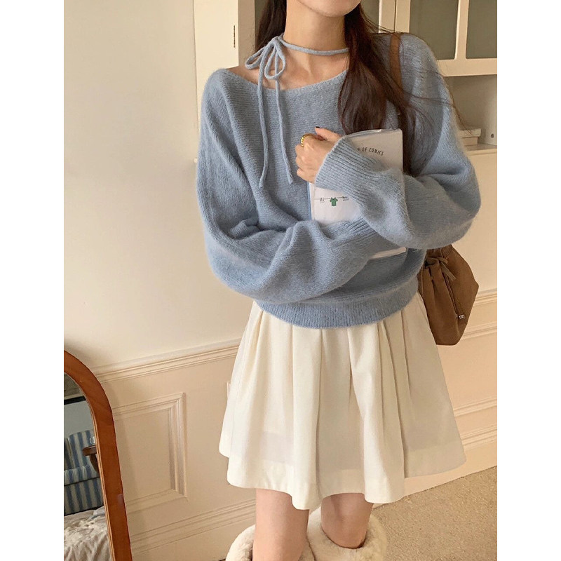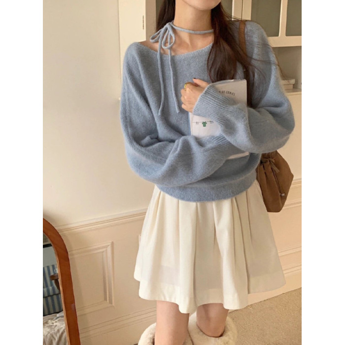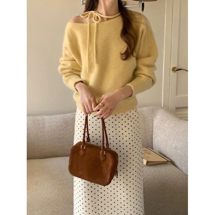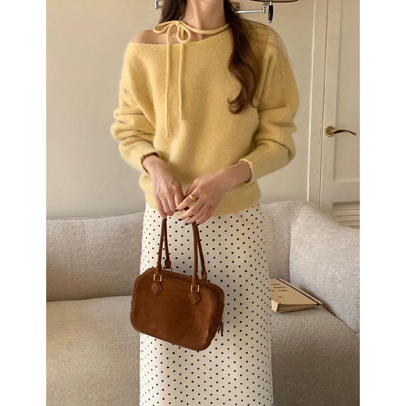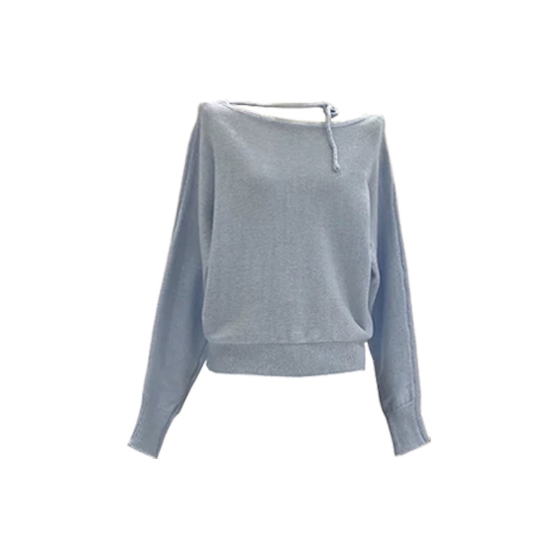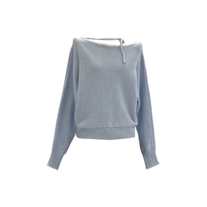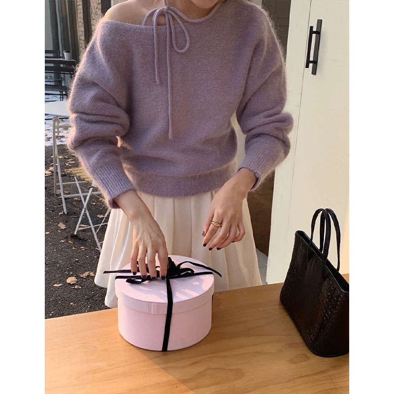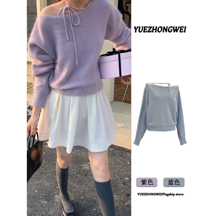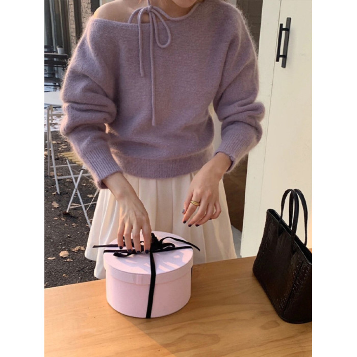 紫色不規則斜肩系帶毛衣2025早秋季新款女裝慵懶風露肩針織衫上衣