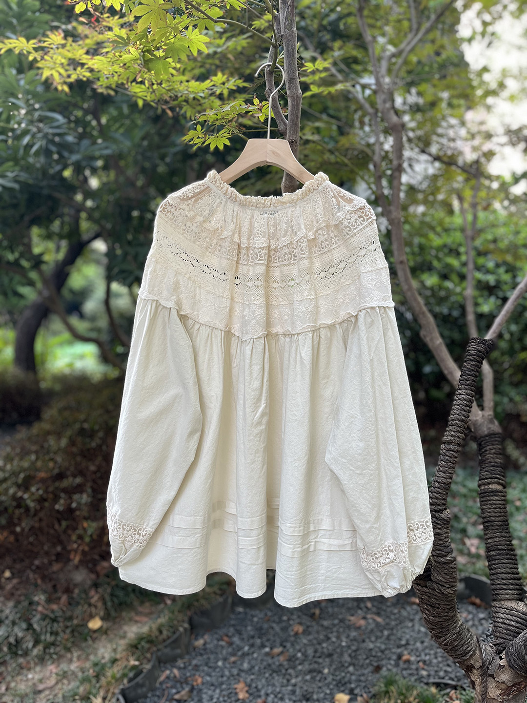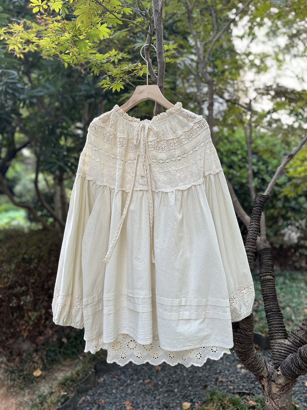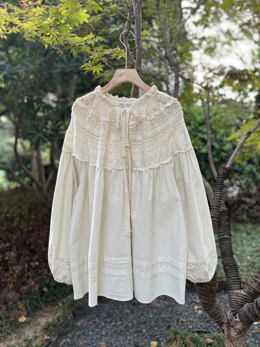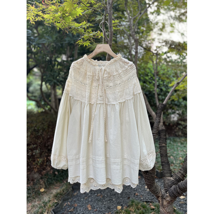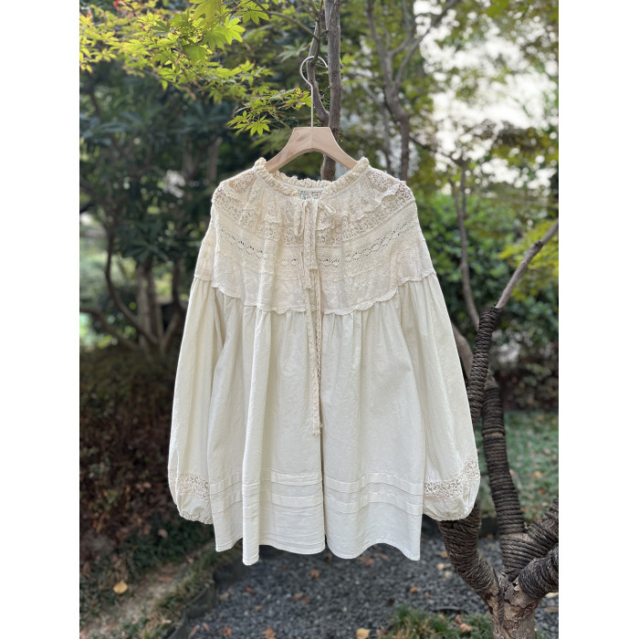 森系蕾絲花邊領口系帶拼接刺綉襯衫寬松大版甜美減齡套頭長袖上衣