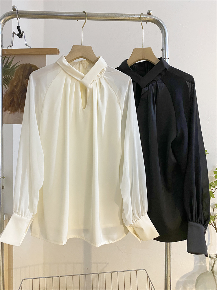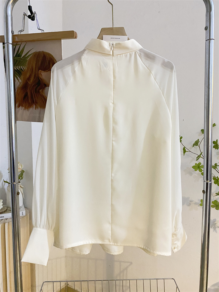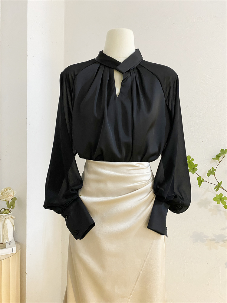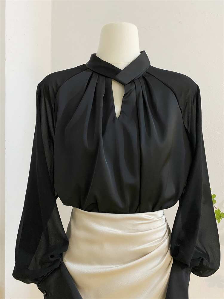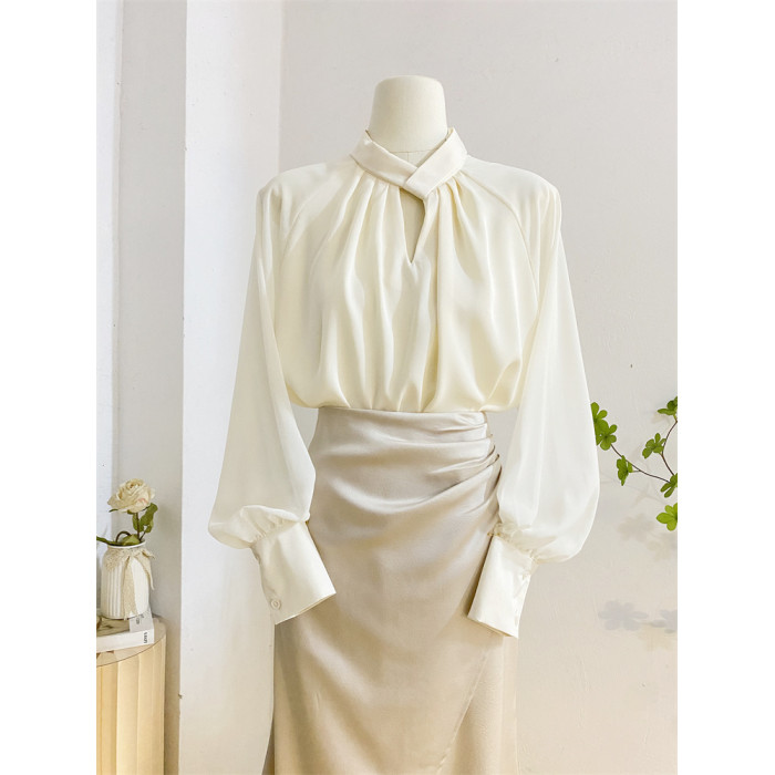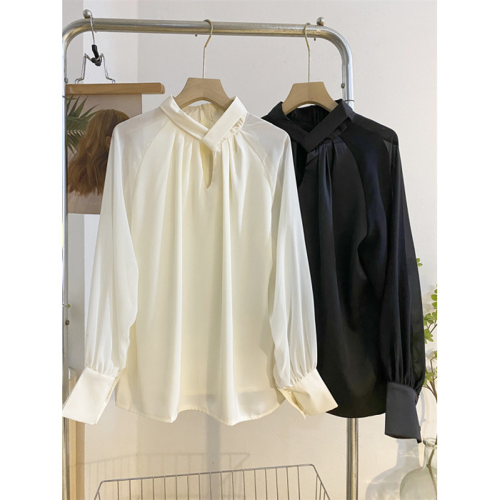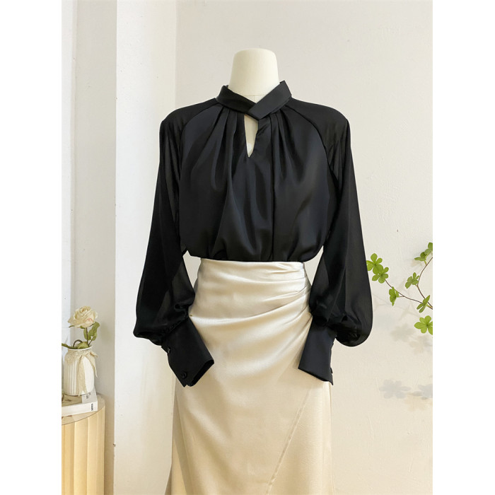 法式溫柔氣質立領緞面襯衫女春季褶皺設計感拼接燈籠長袖小衫上衣
