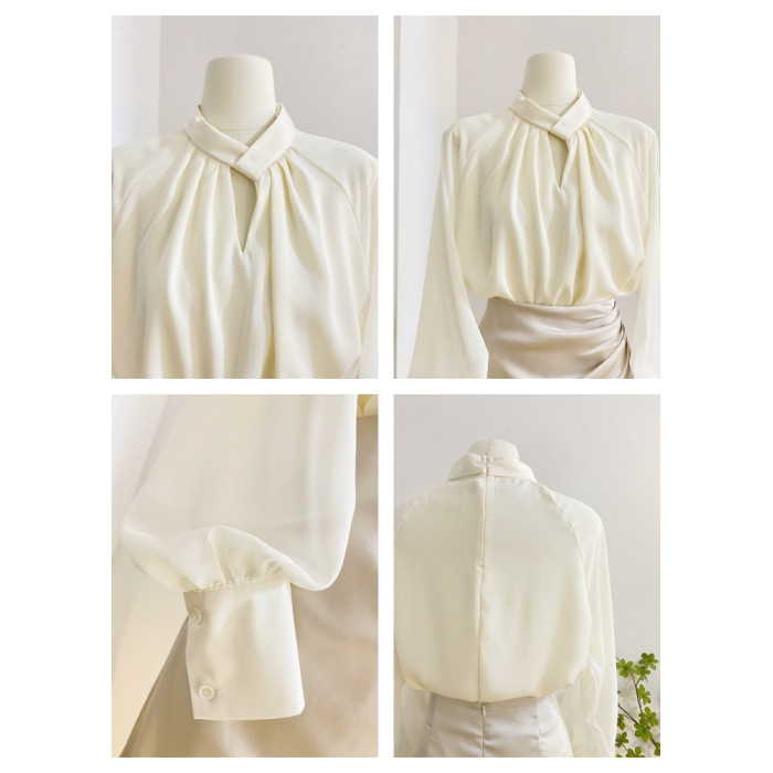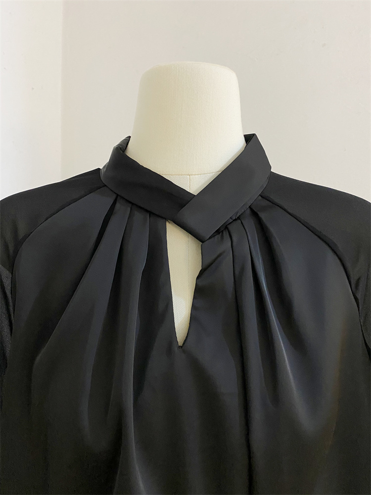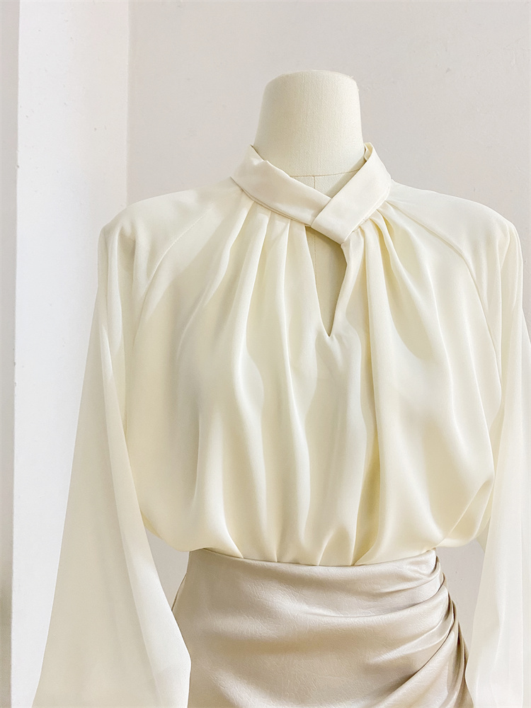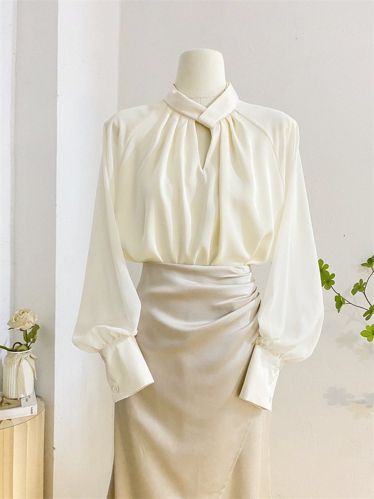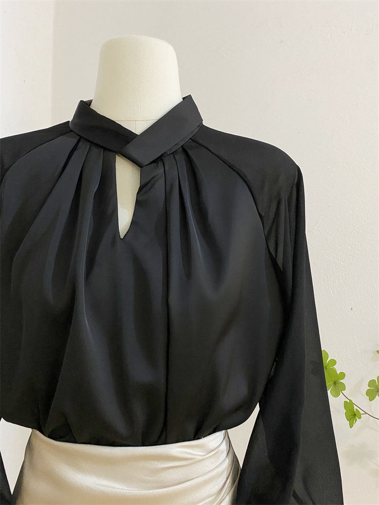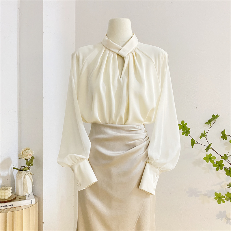 法式溫柔氣質立領緞面襯衫女春季褶皺設計感拼接燈籠長袖小衫上衣