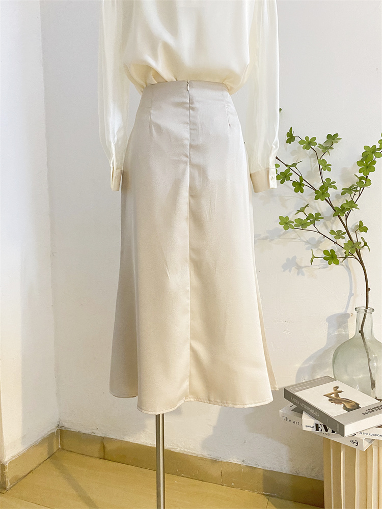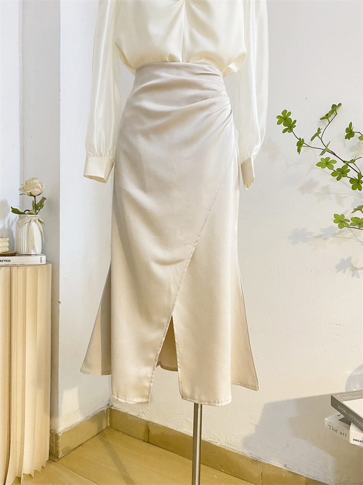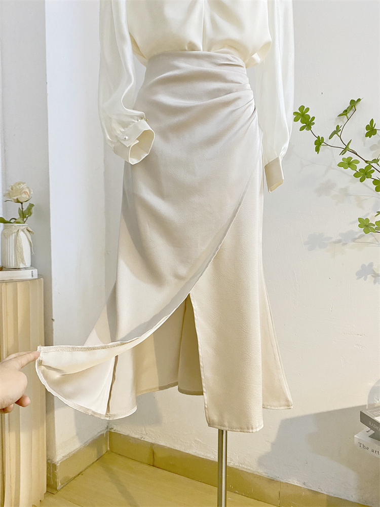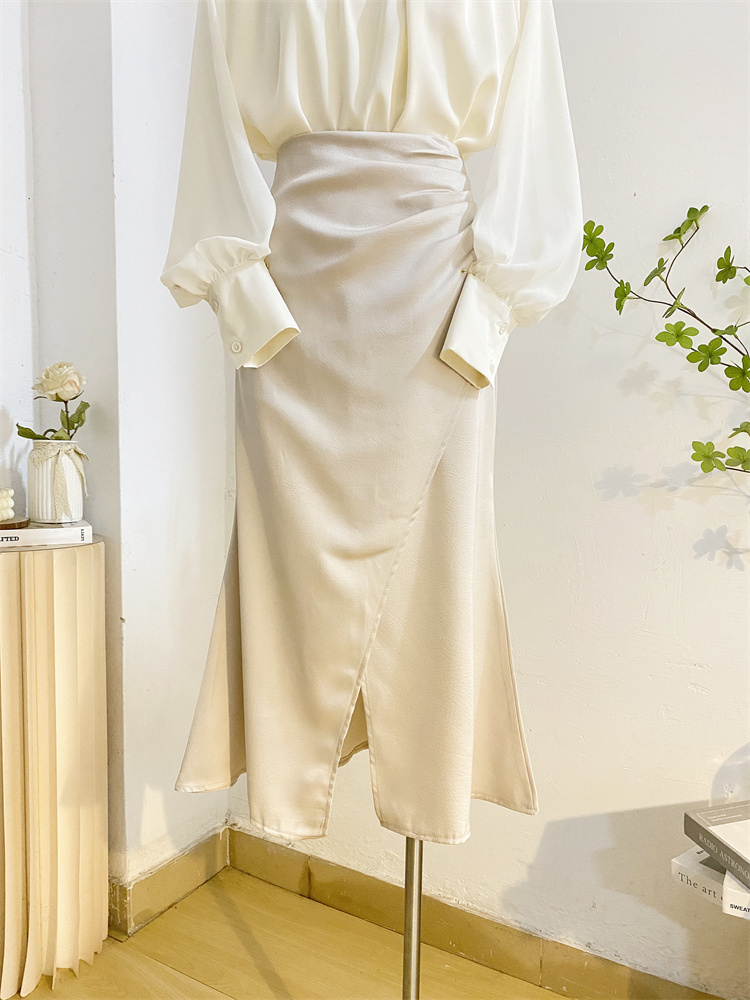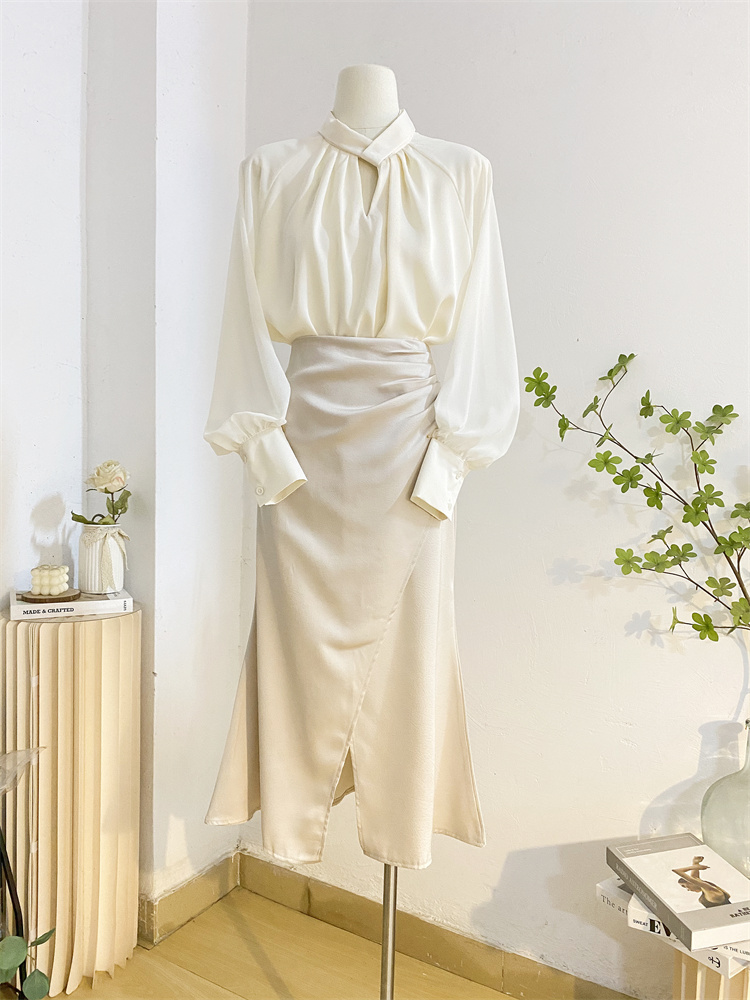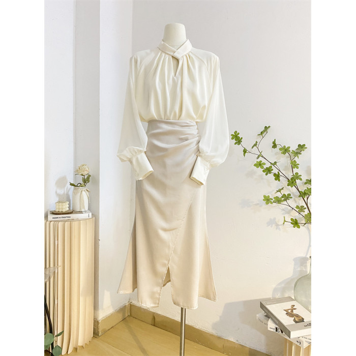 法式溫柔氣質立領緞面襯衫女春季褶皺設計感拼接燈籠長袖小衫上衣
