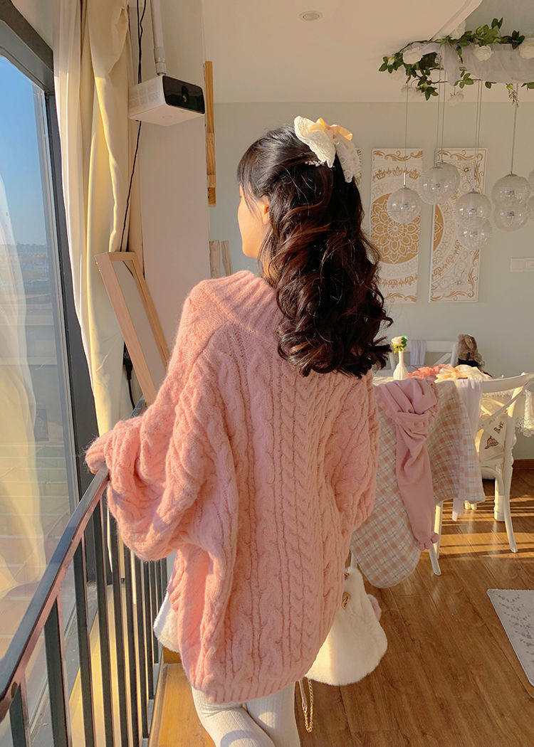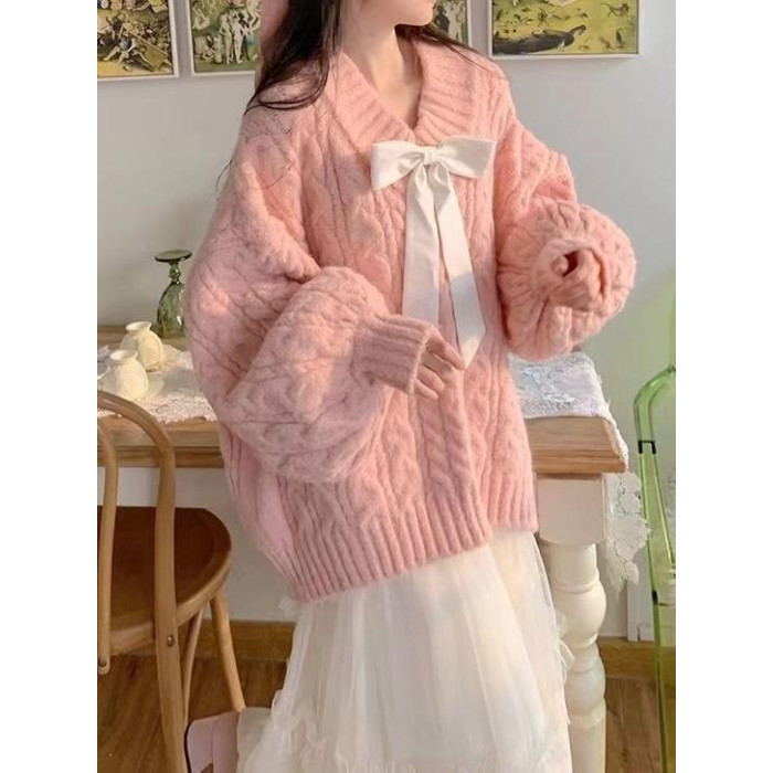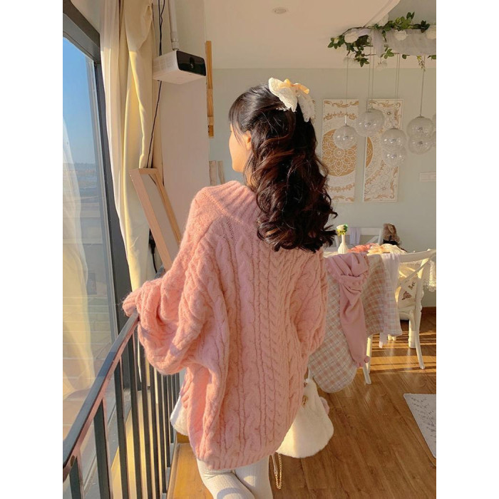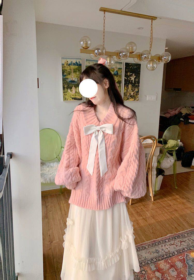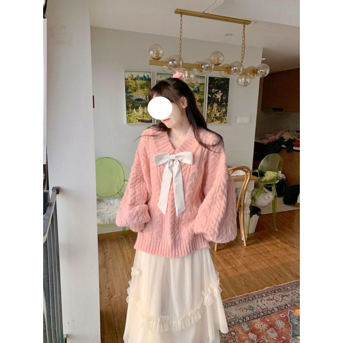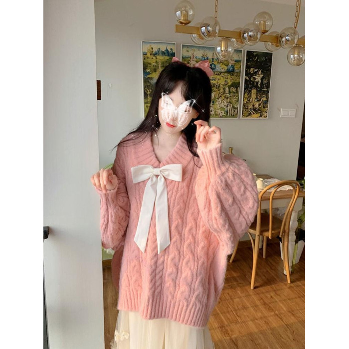 秋冬軟糯溫柔慵懶風粉色內搭針織V領毛衣寬松2024新款加厚上衣女