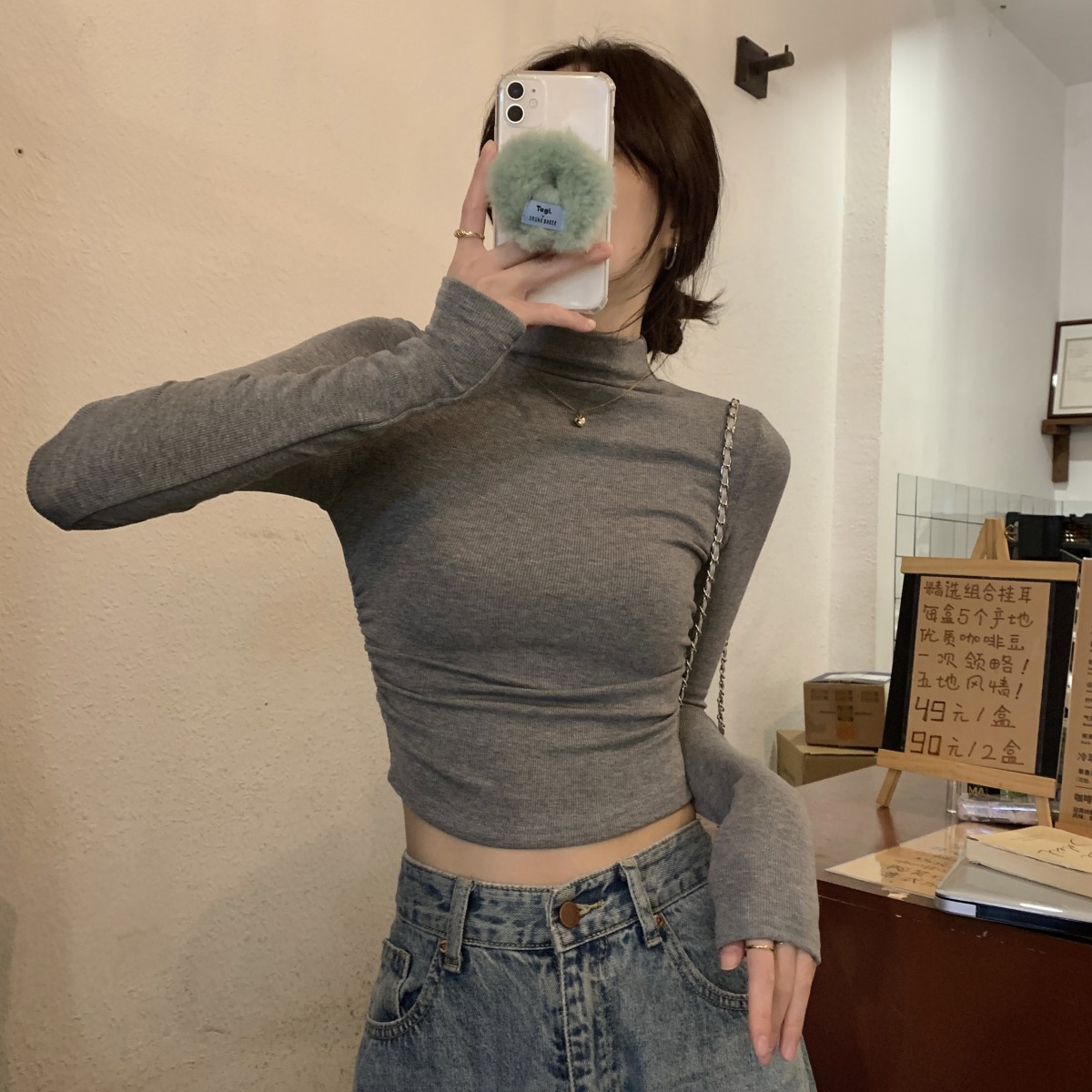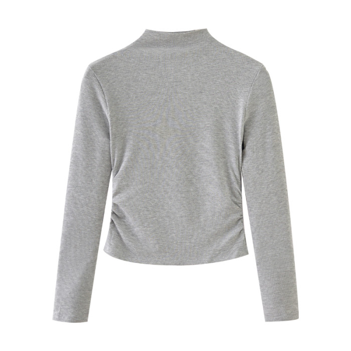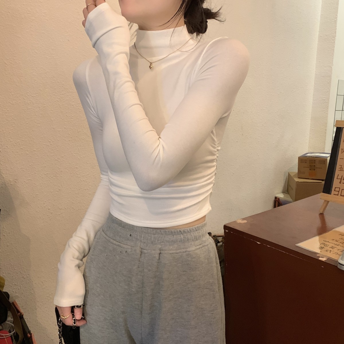 辣妹半高領長袖t恤女小個子2025春季新款韓版修身褶皺打底衫女ins