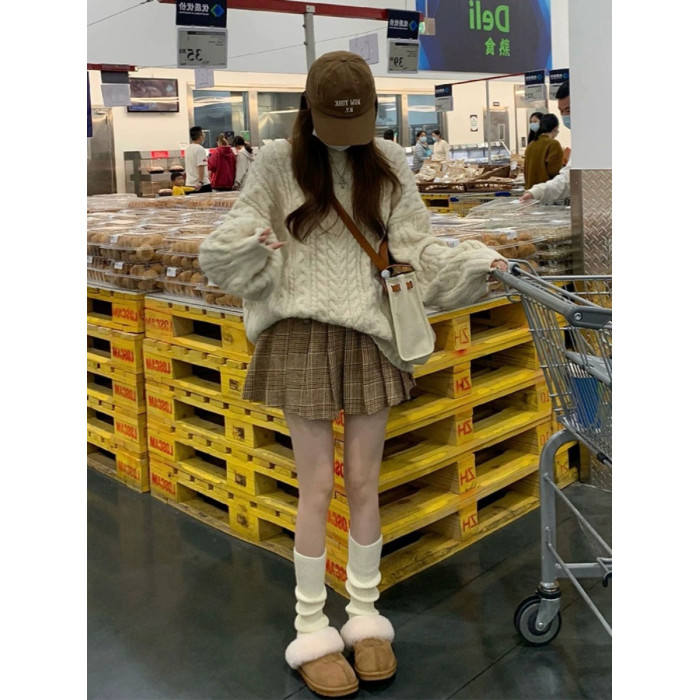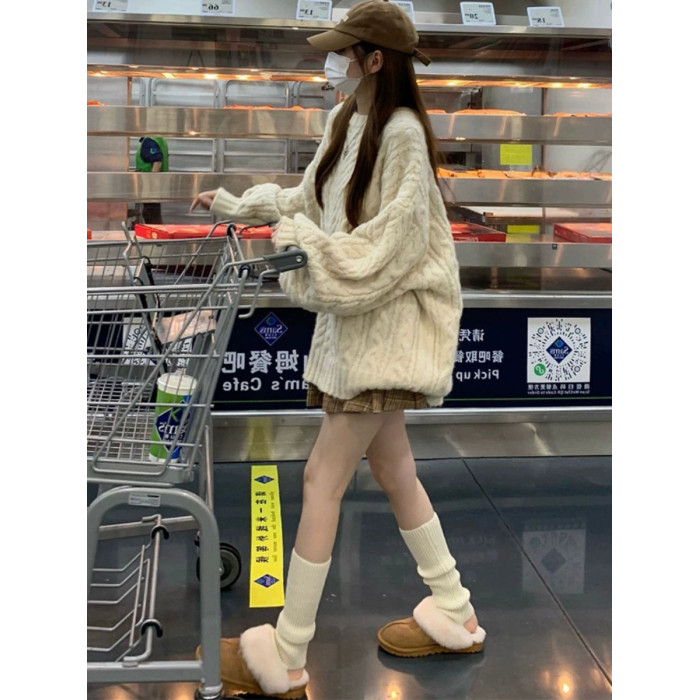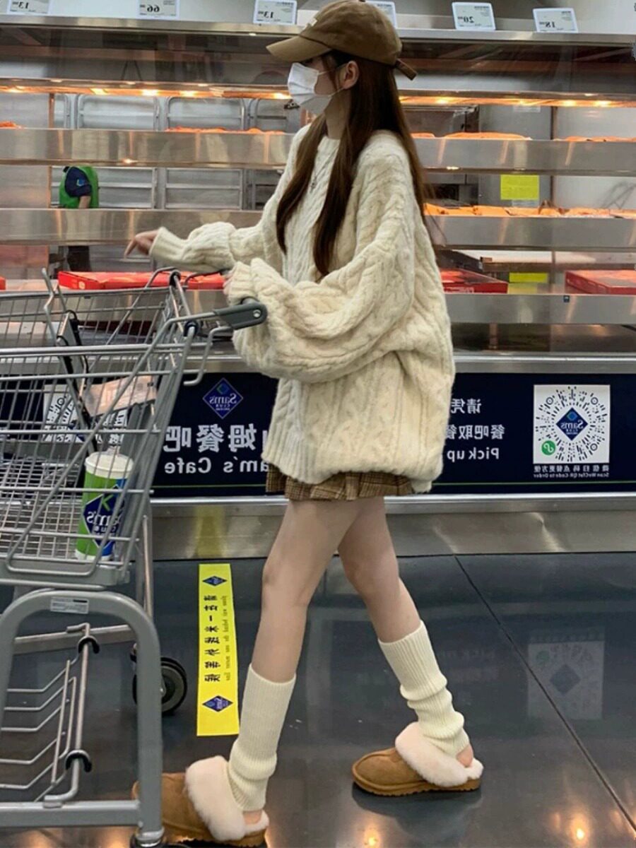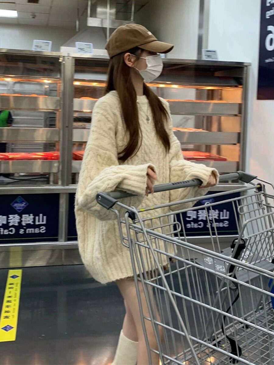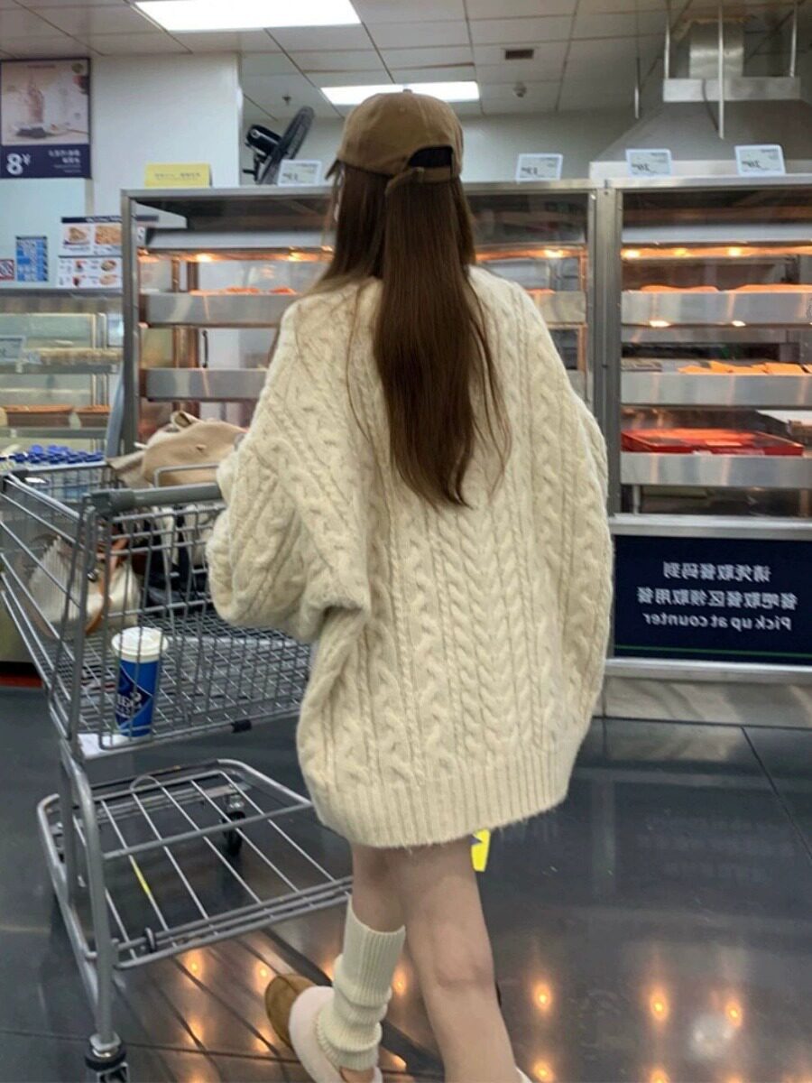 圓領套頭麻花毛衣女寬松慵懶風高級感中長款軟糯加厚針織外套上衣
