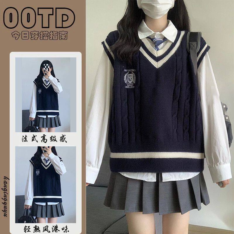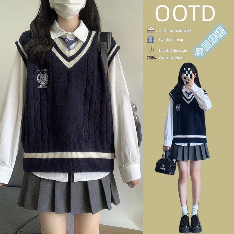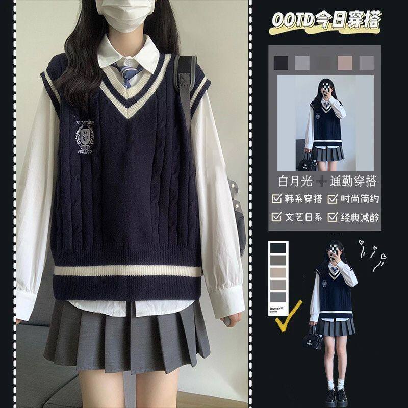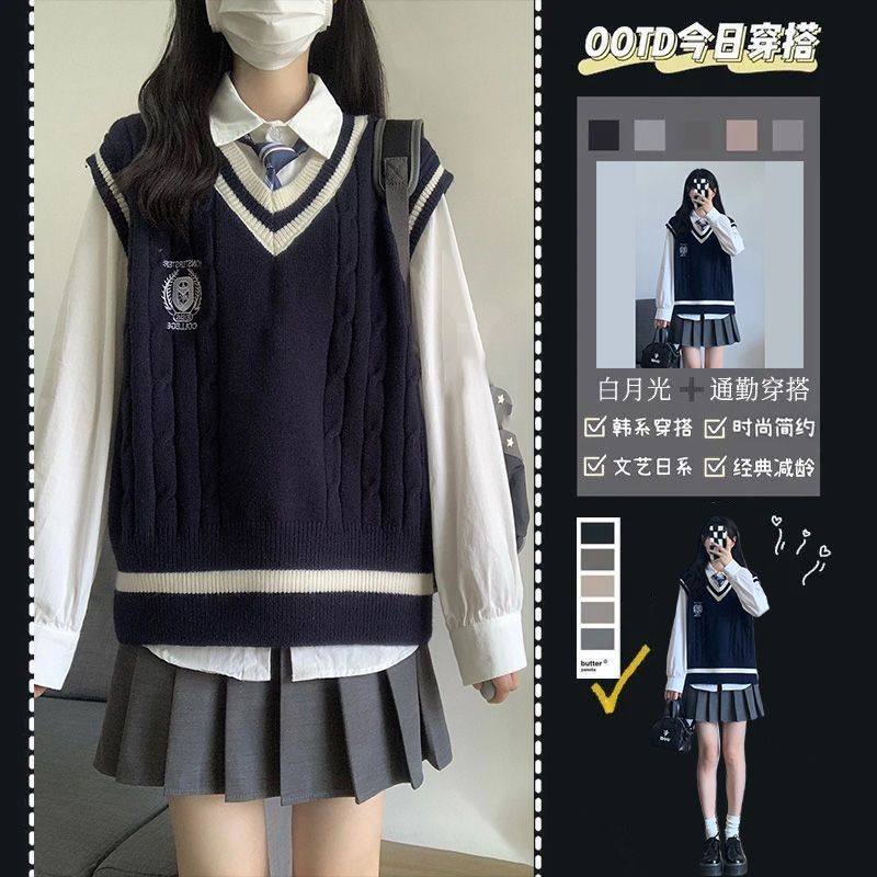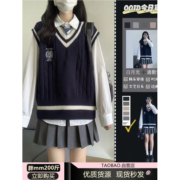胖MM200斤特大碼套裝春秋學院風條紋針織毛衣馬甲搭配襯衣百褶裙