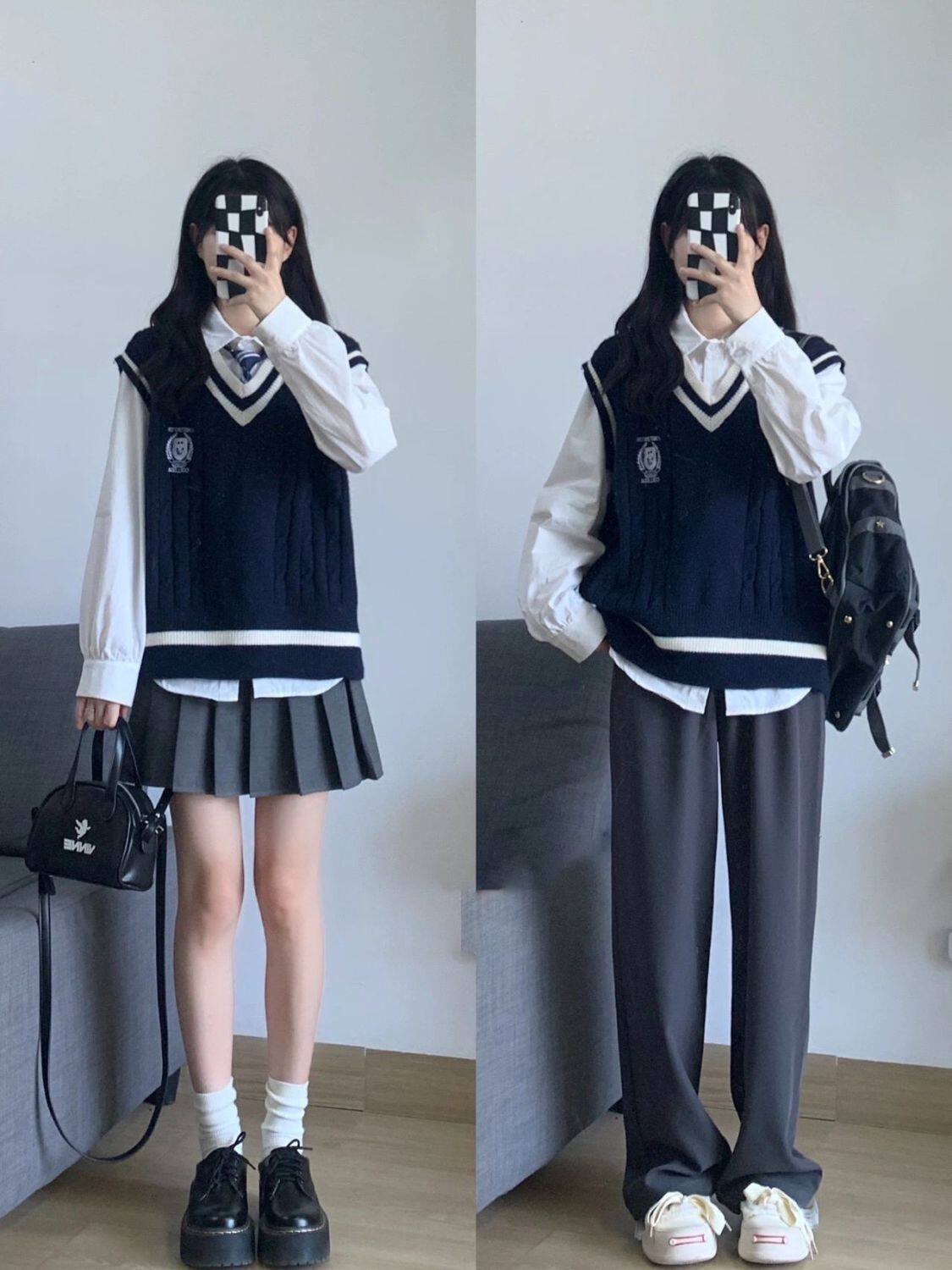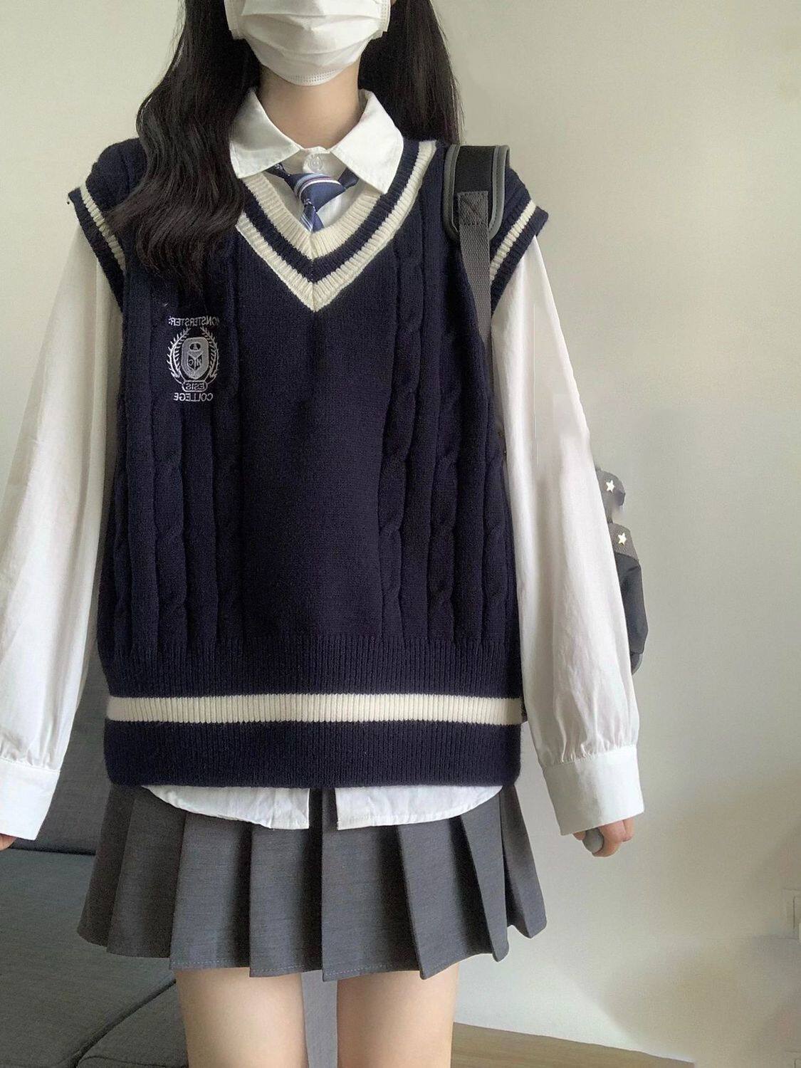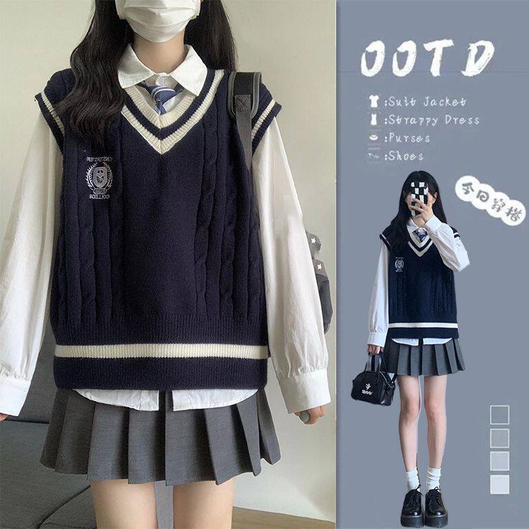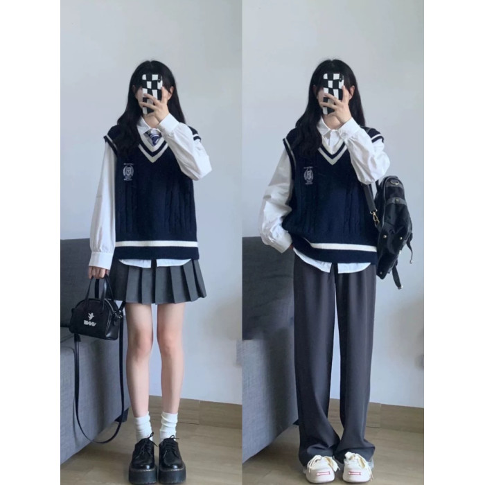 胖MM200斤特大碼套裝春秋學院風條紋針織毛衣馬甲搭配襯衣百褶裙