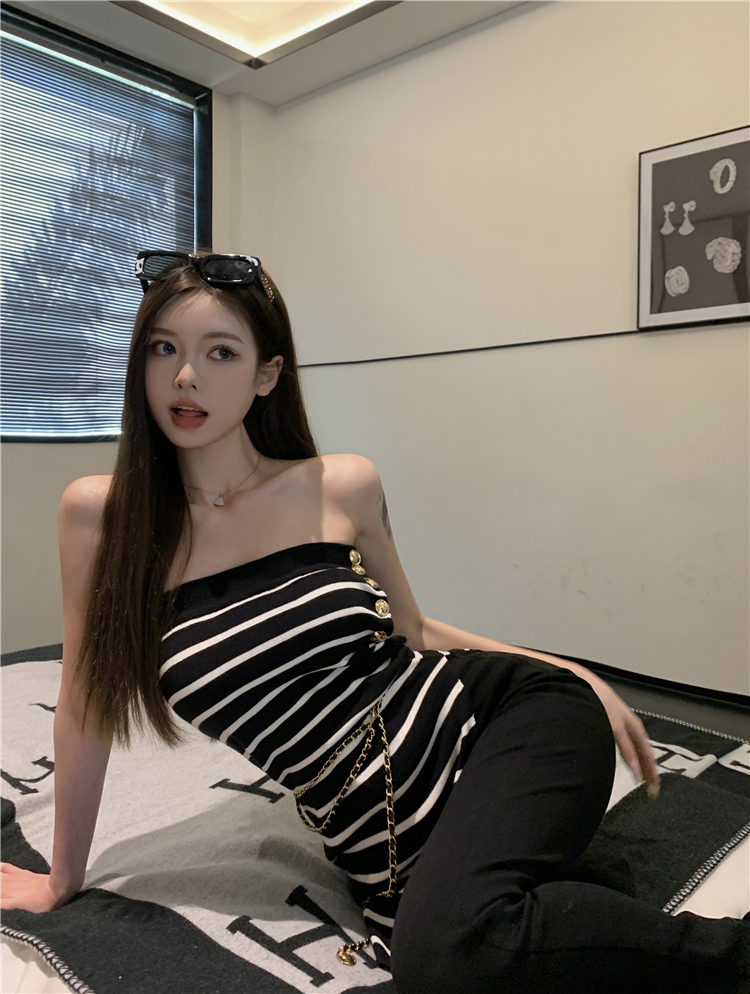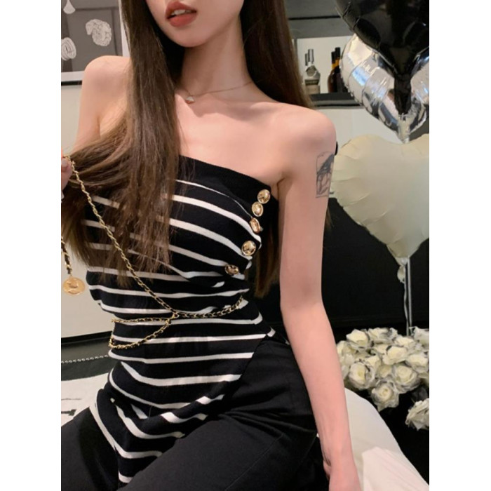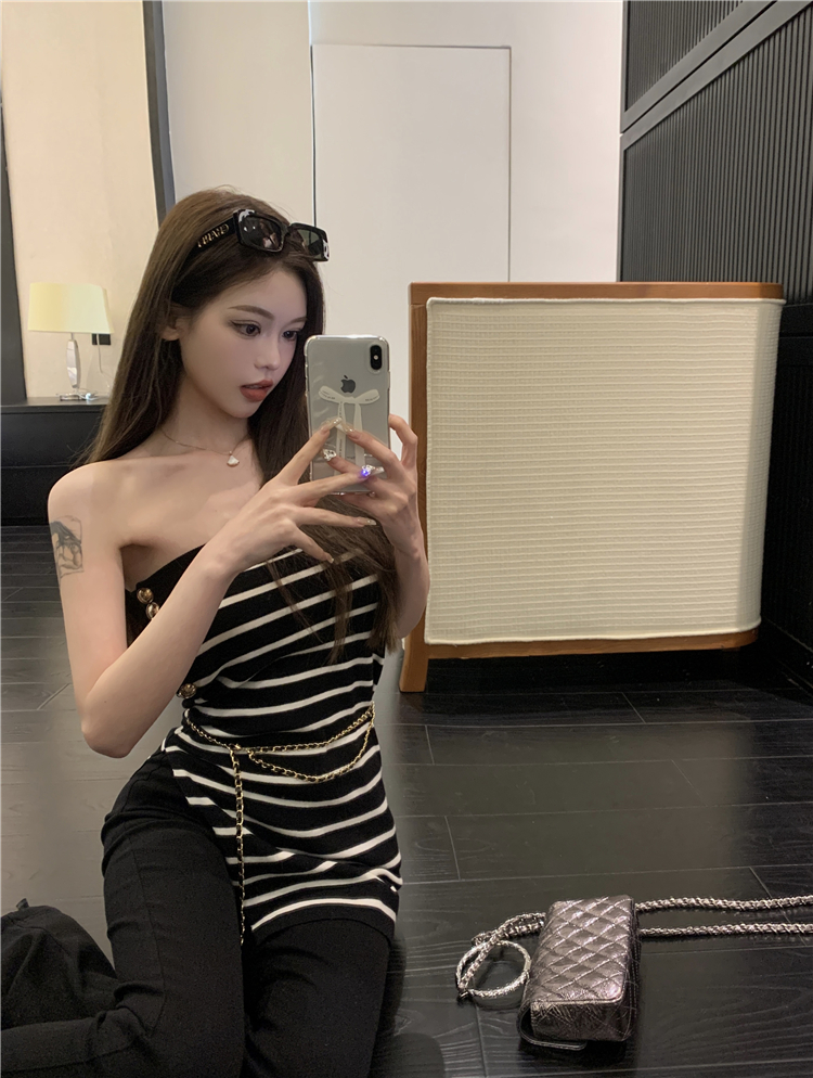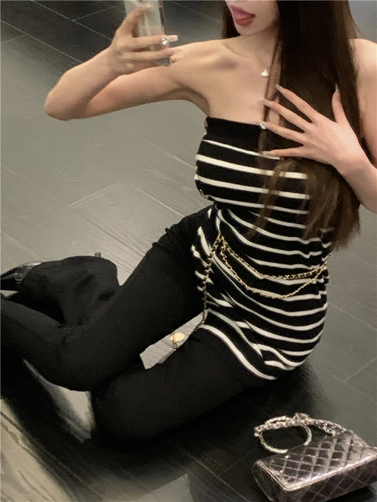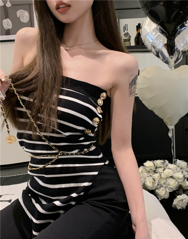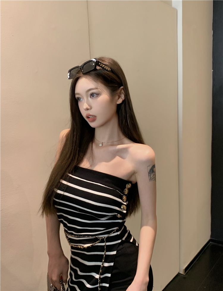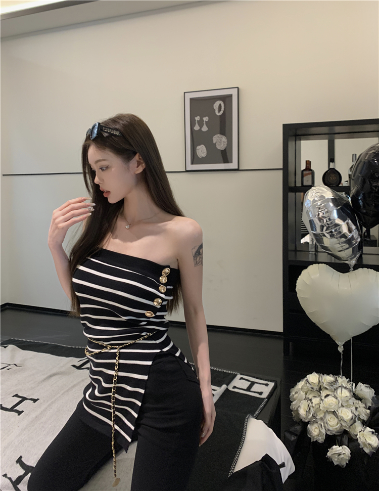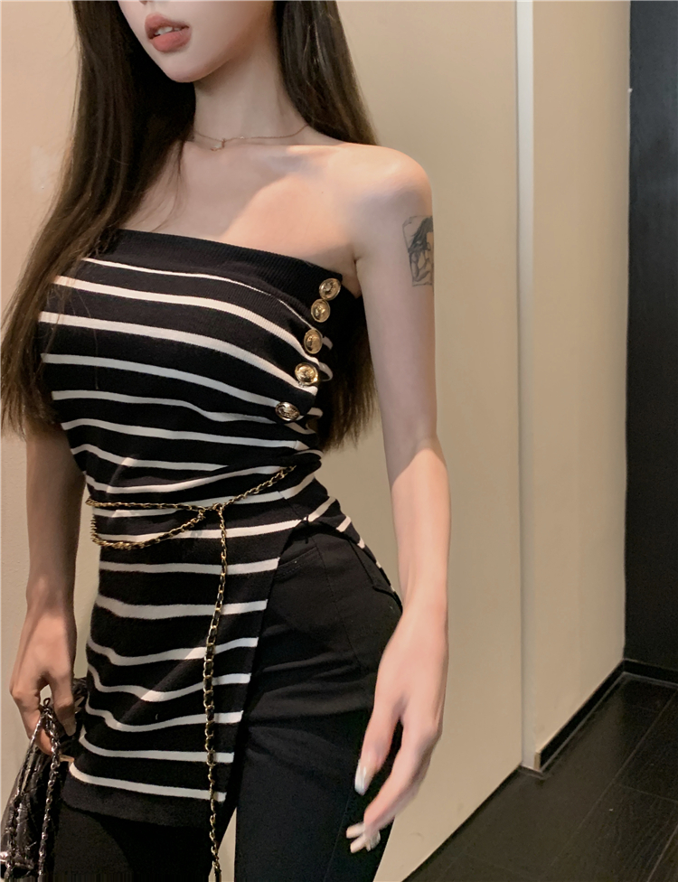 法式氣質茶藝甜辣妹條紋抹胸背心女內搭一字肩不規則開叉無袖上衣