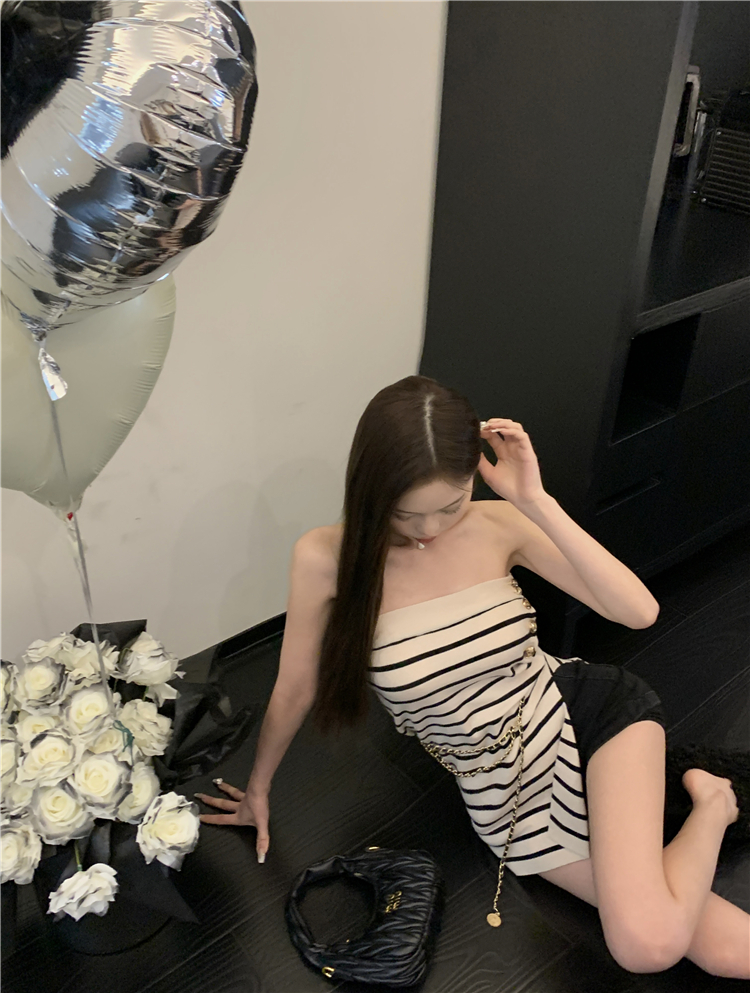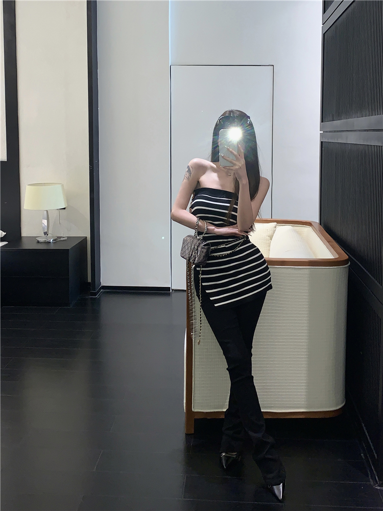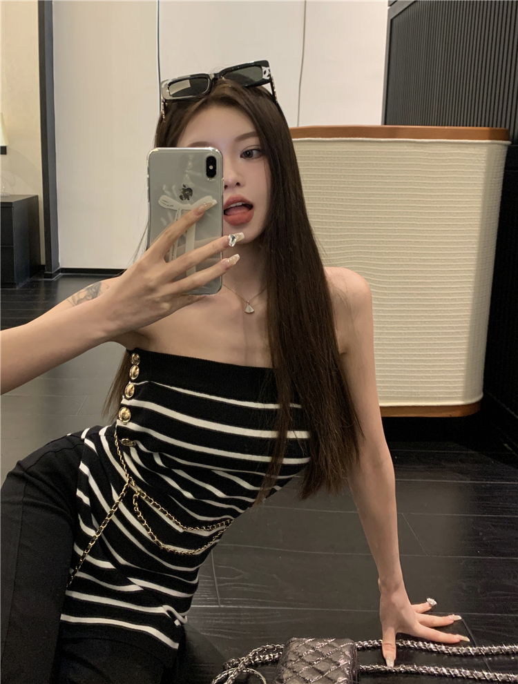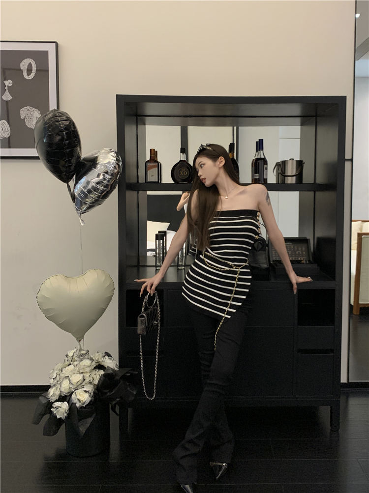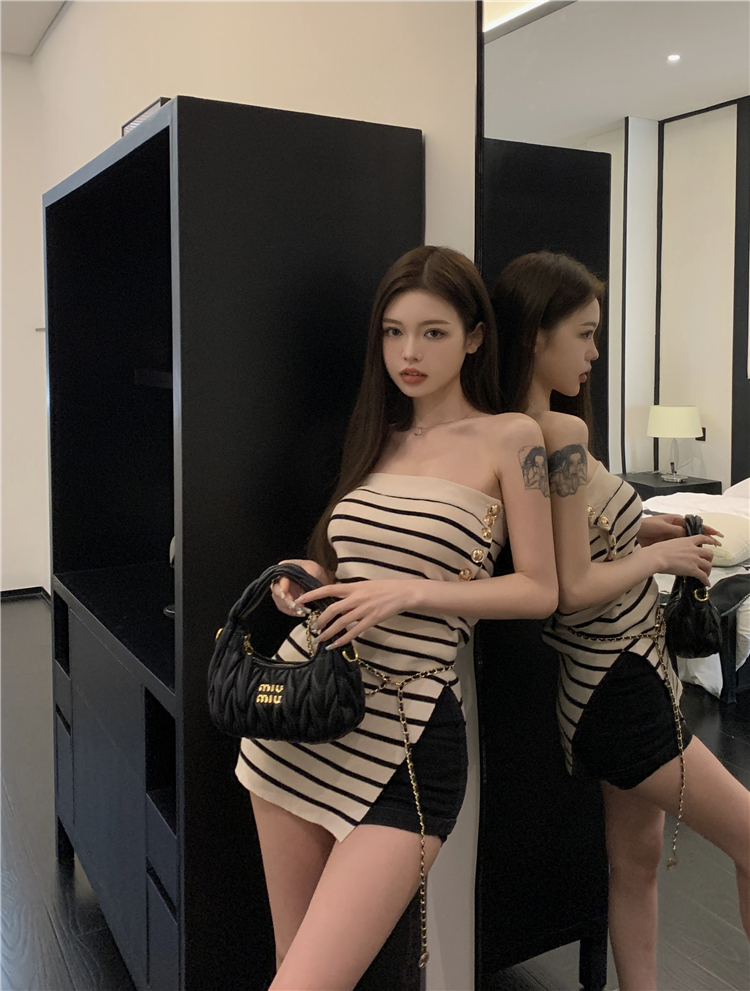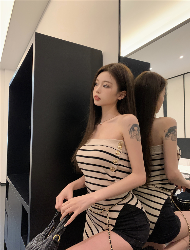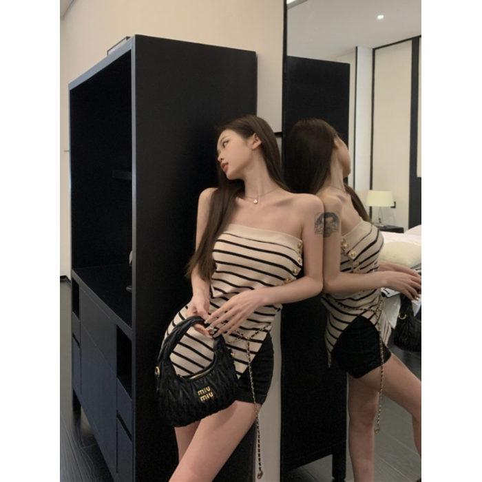 法式氣質茶藝甜辣妹條紋抹胸背心女內搭一字肩不規則開叉無袖上衣