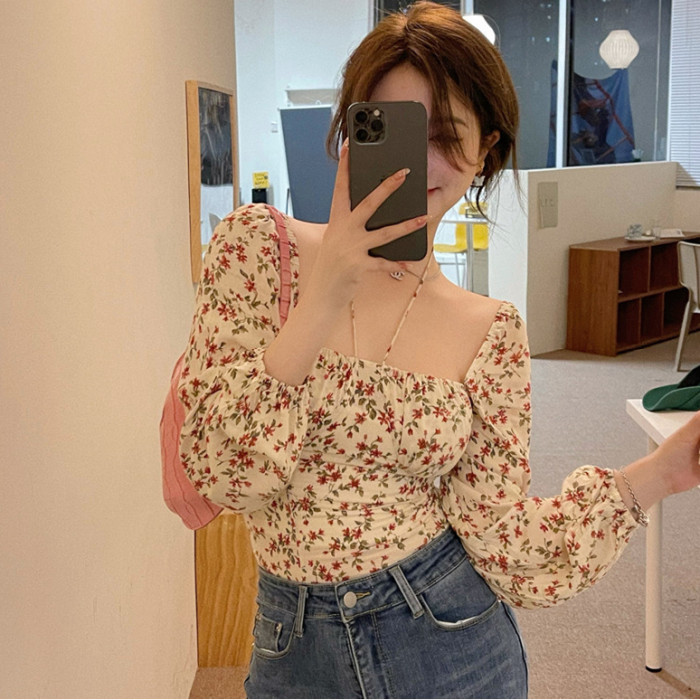 法式碎花方領上衣襯衫女設計感小衆泡泡袖修身抽褶春款露鎖骨小衫