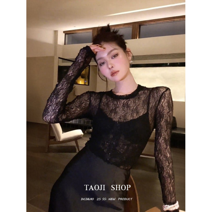 法式復古蕾絲性感長袖T恤女春夏新款設計感小衆時尚氣質顯瘦上衣