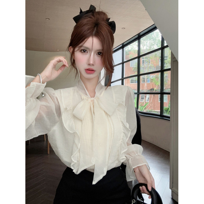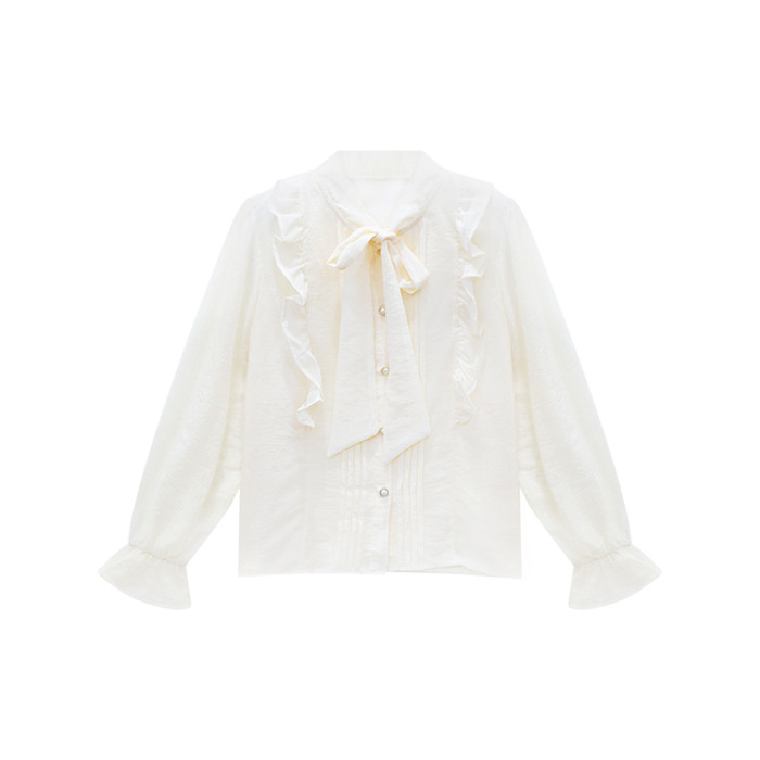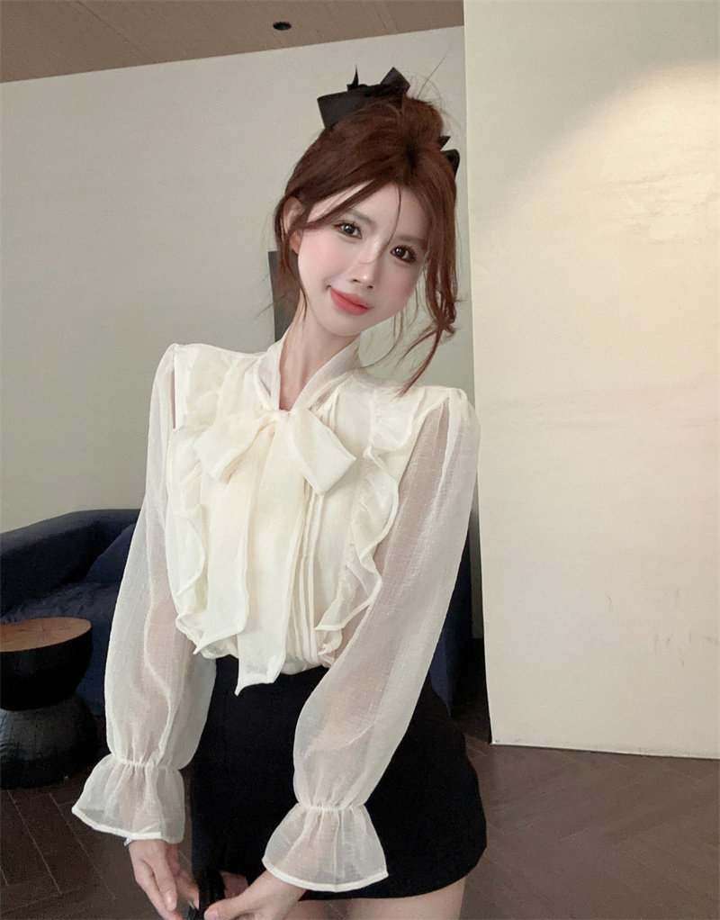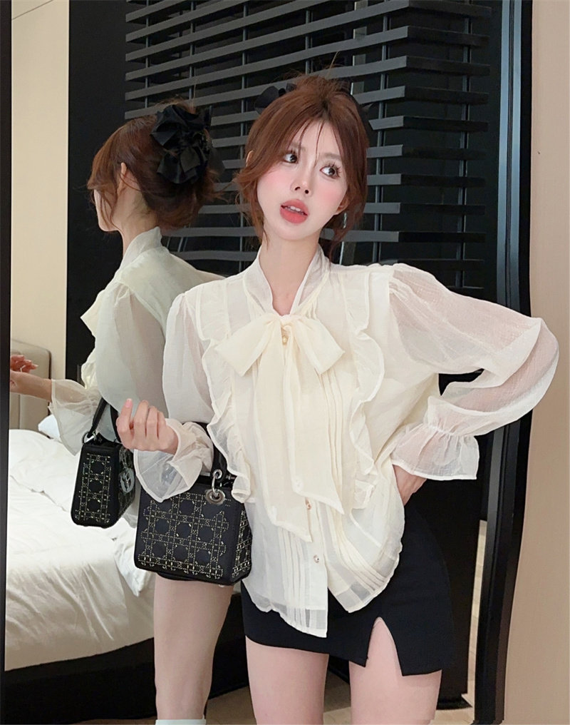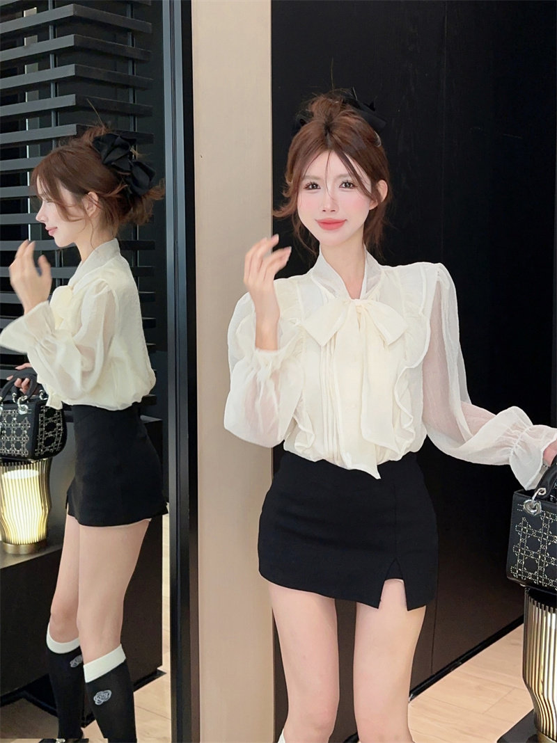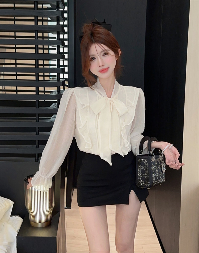 雪紡衫法式修身荷葉邊長袖襯衫別致獨特上衣女士秋季新款漂亮小衫