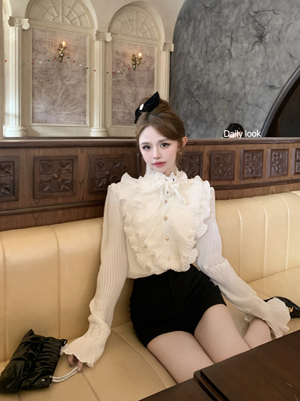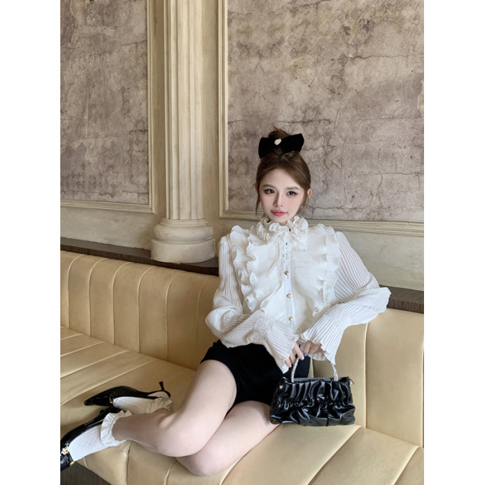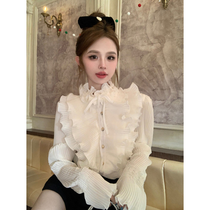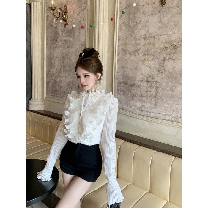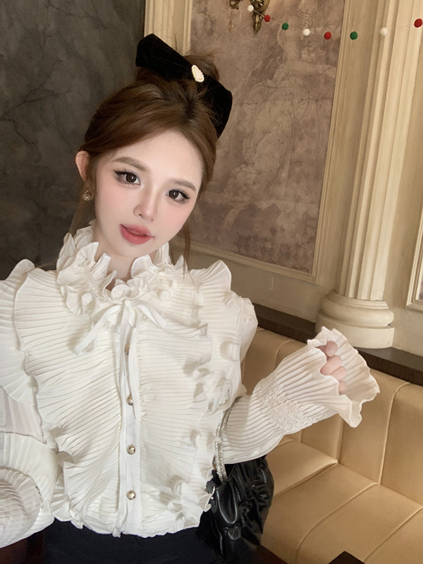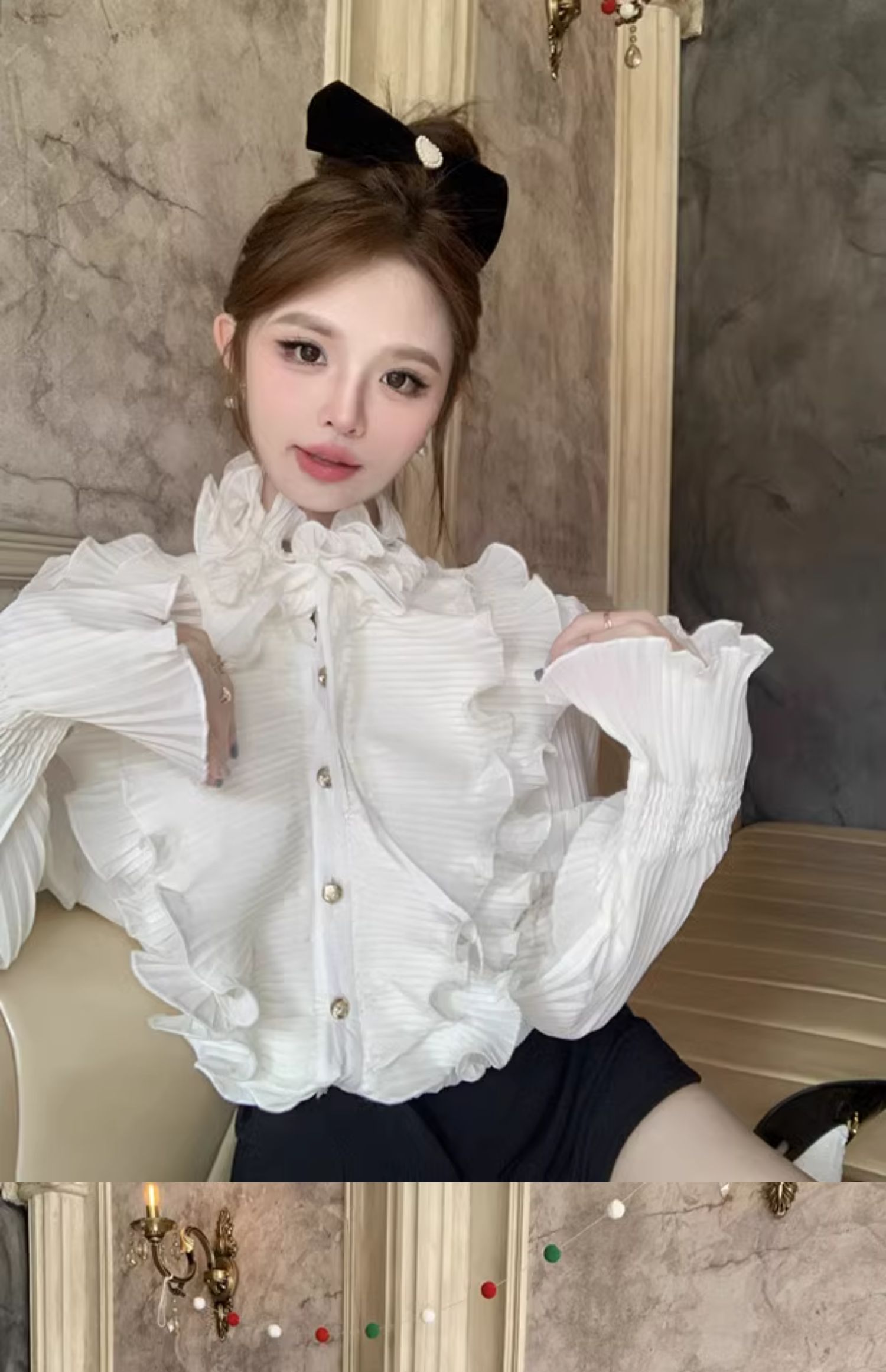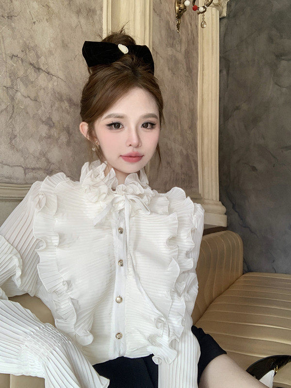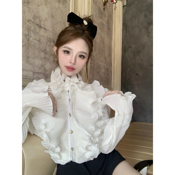 小香風荷葉邊襯衫女秋冬純欲法式喇叭袖百褶上衣半高領打底衫內搭