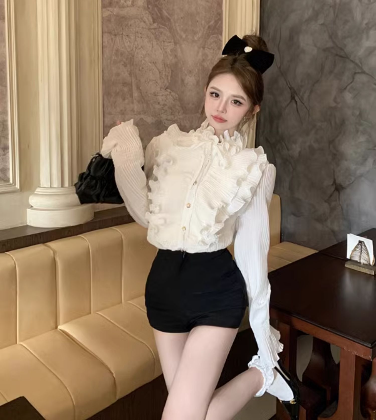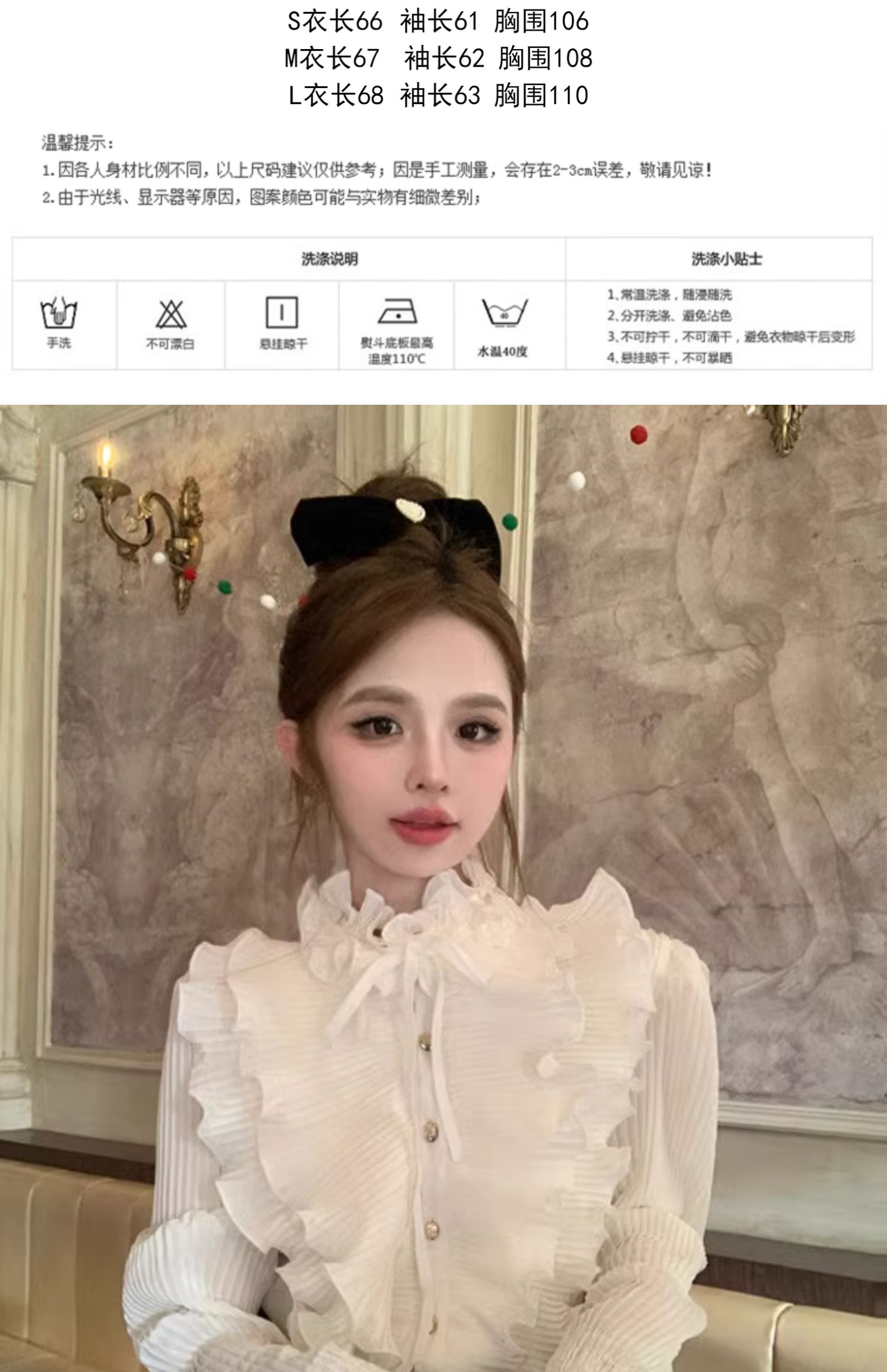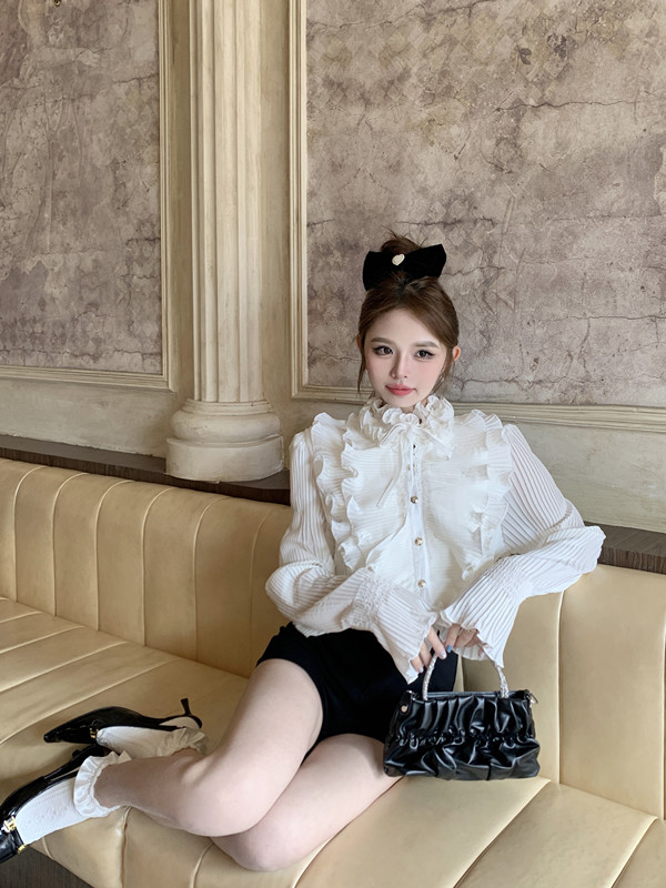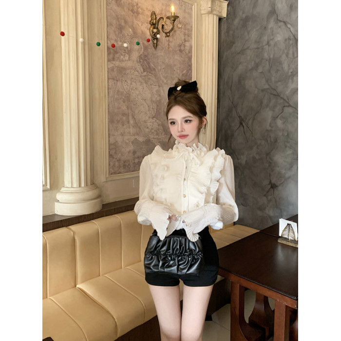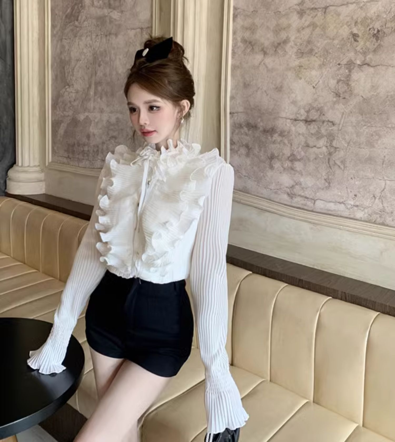 小香風荷葉邊襯衫女秋冬純欲法式喇叭袖百褶上衣半高領打底衫內搭