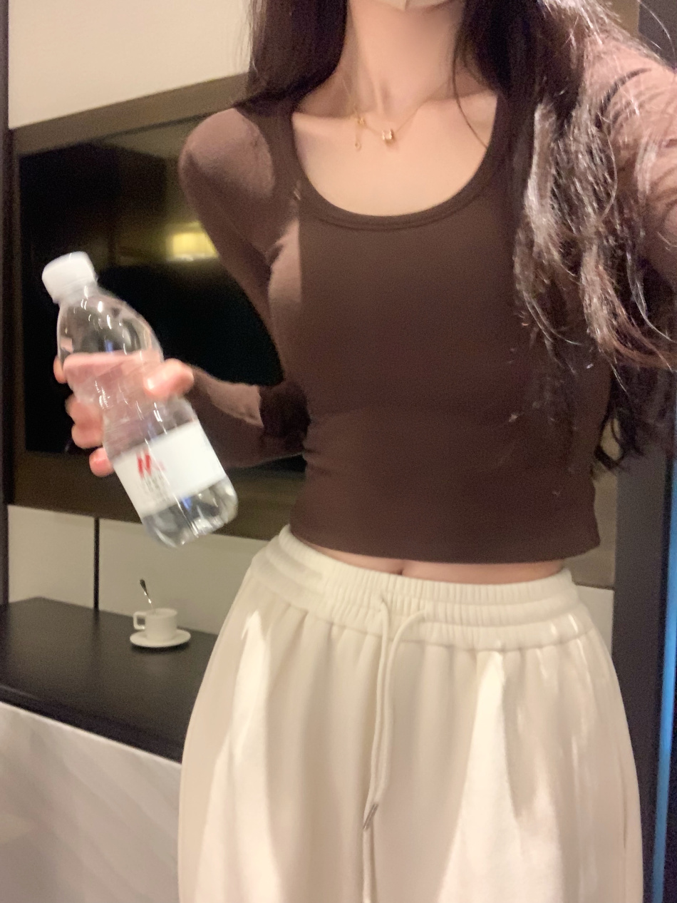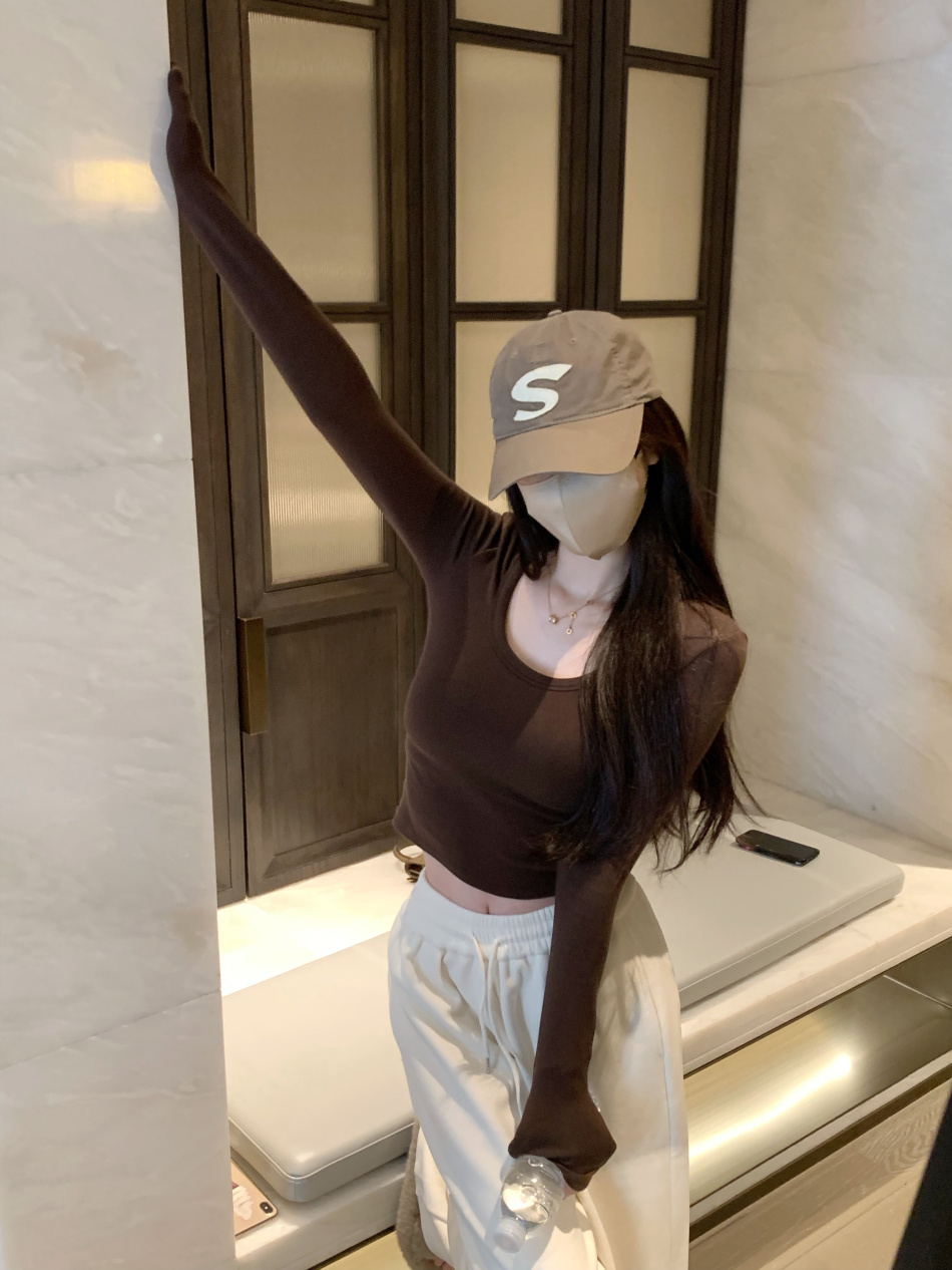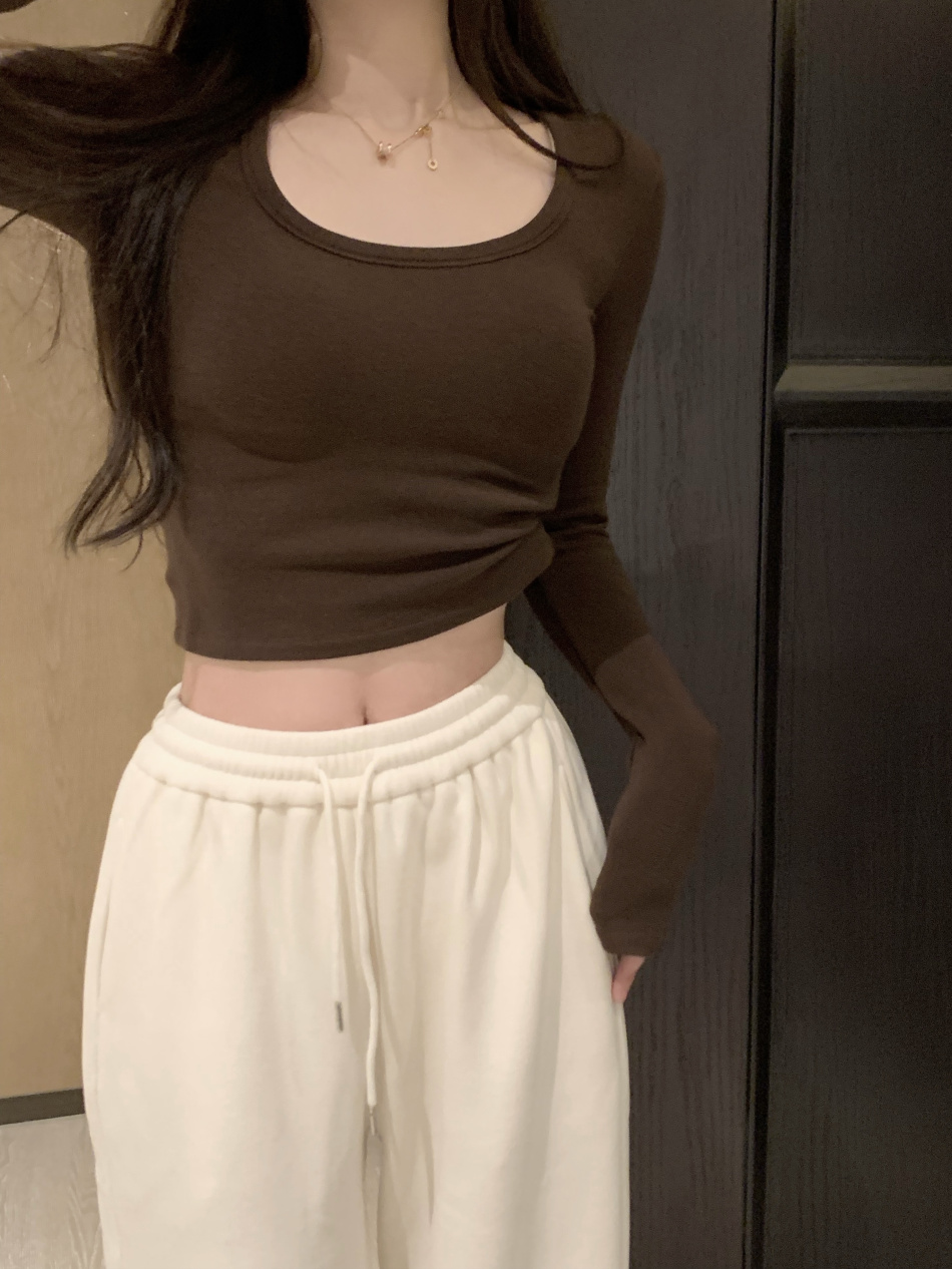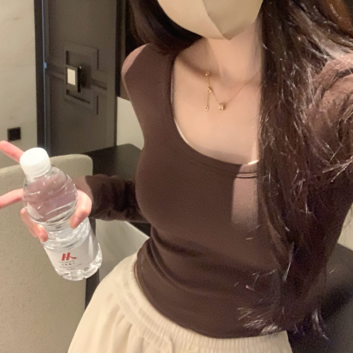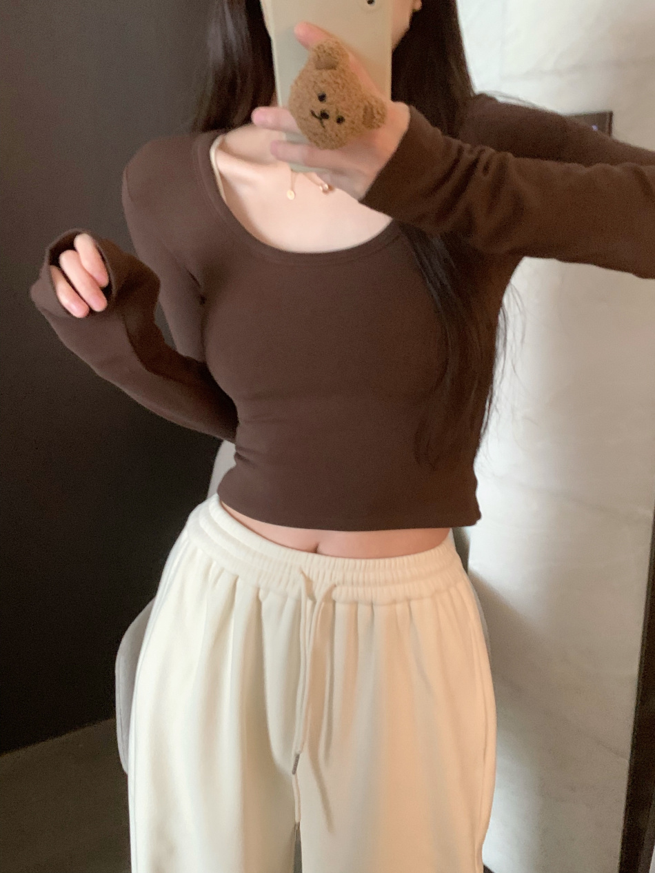 辣妹u領磨毛咖色打底衫女秋冬新款韓版修身性感薄絨長袖t恤女短款