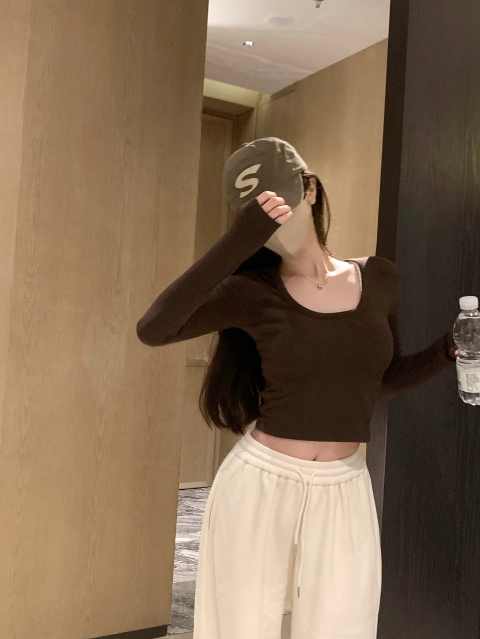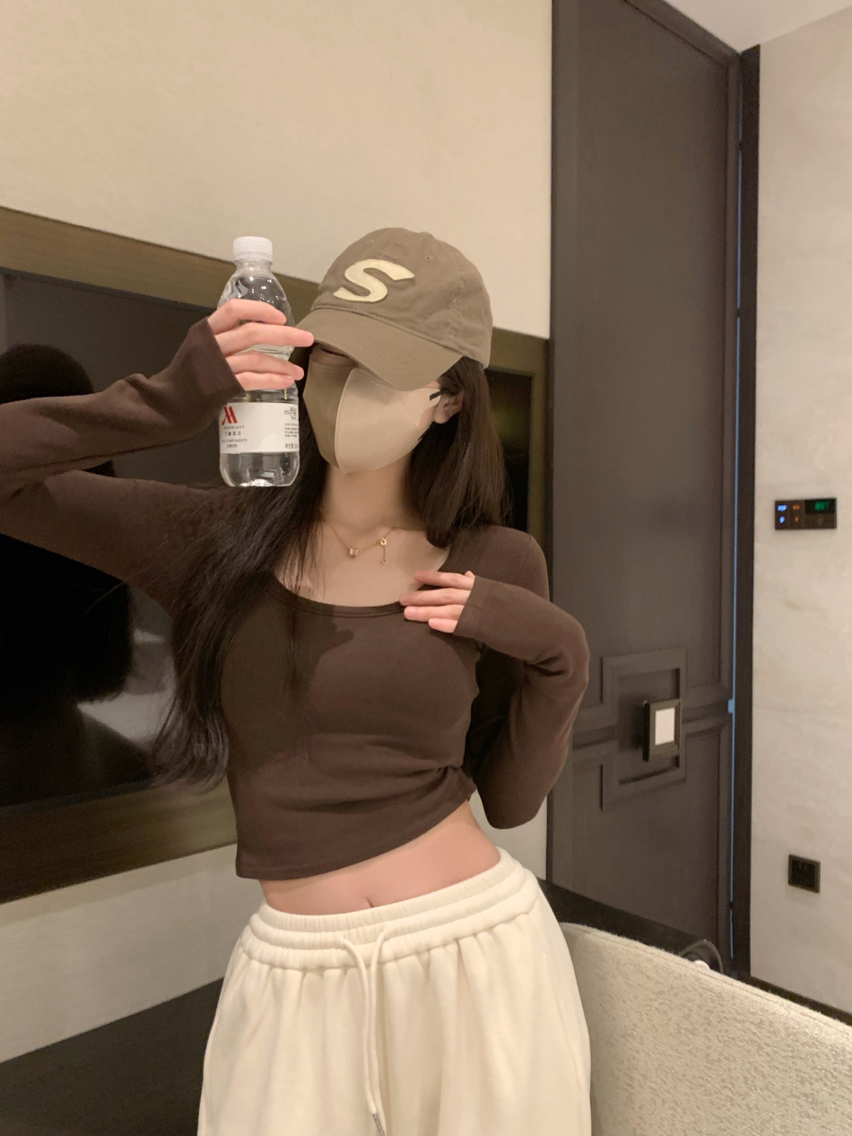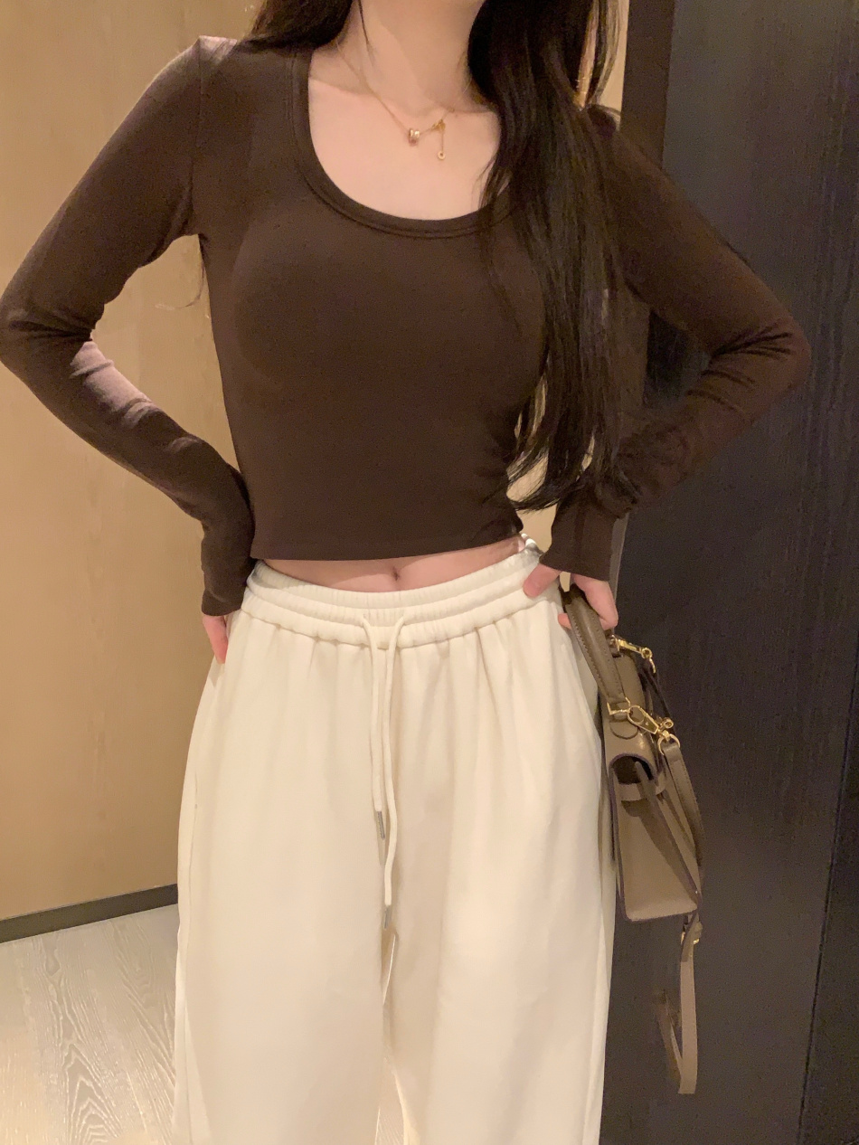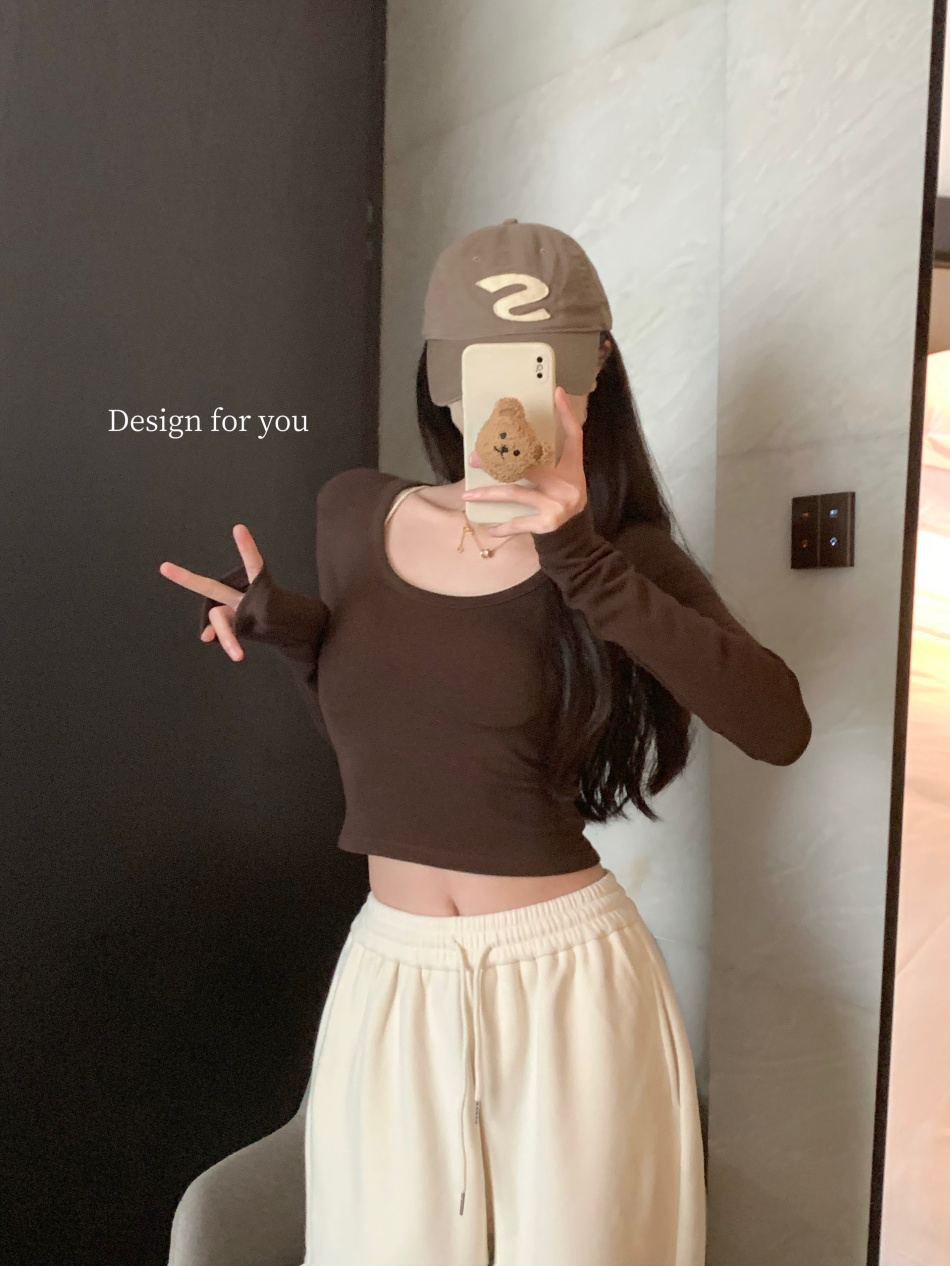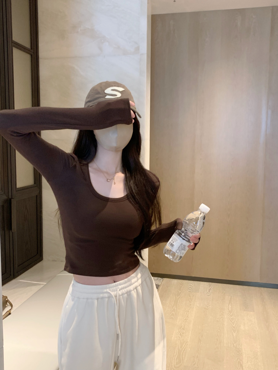辣妹u領磨毛咖色打底衫女秋冬新款韓版修身性感薄絨長袖t恤女短款