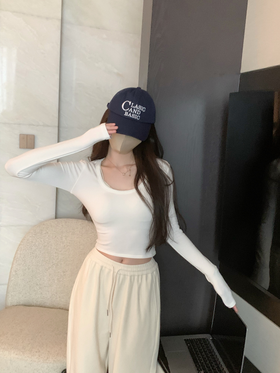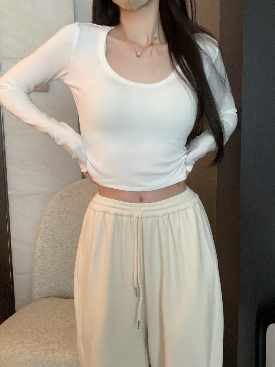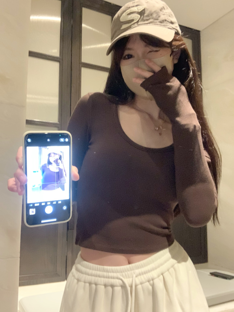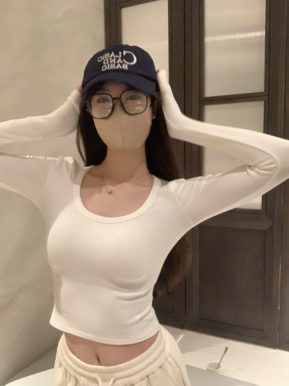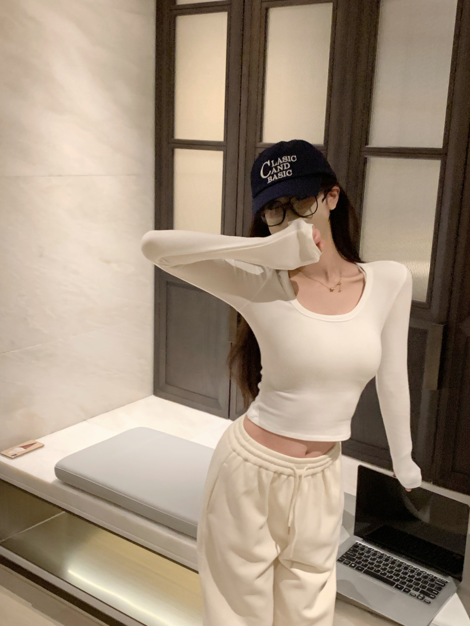 辣妹u領磨毛咖色打底衫女秋冬新款韓版修身性感薄絨長袖t恤女短款
