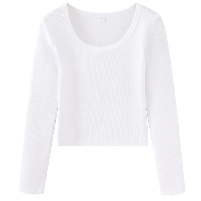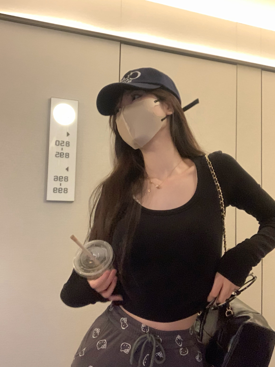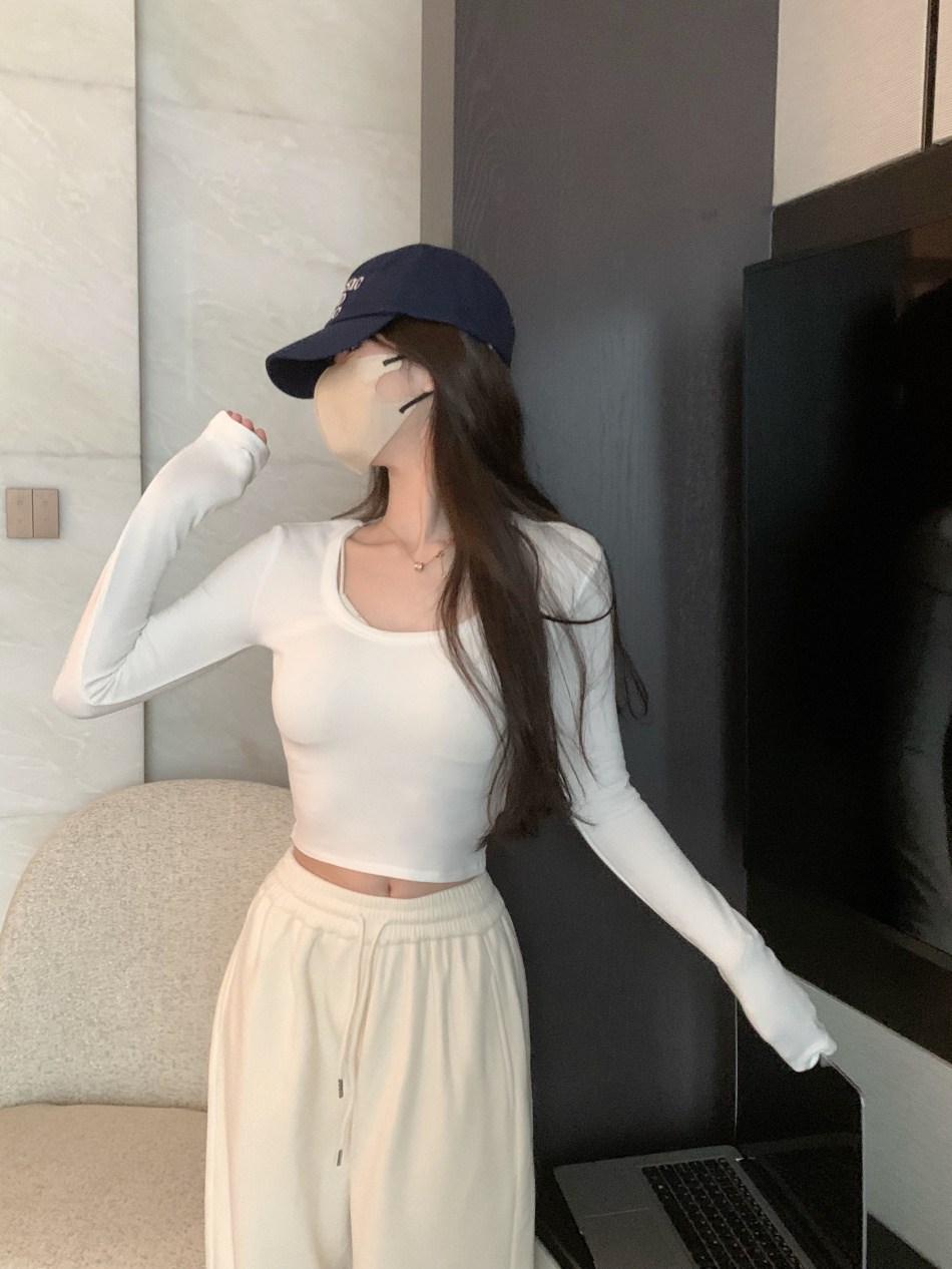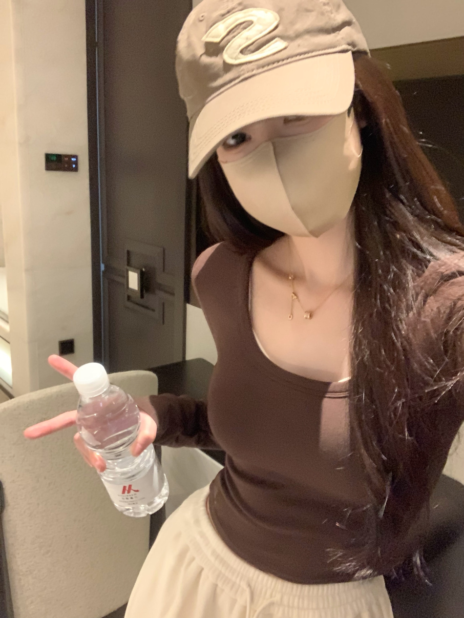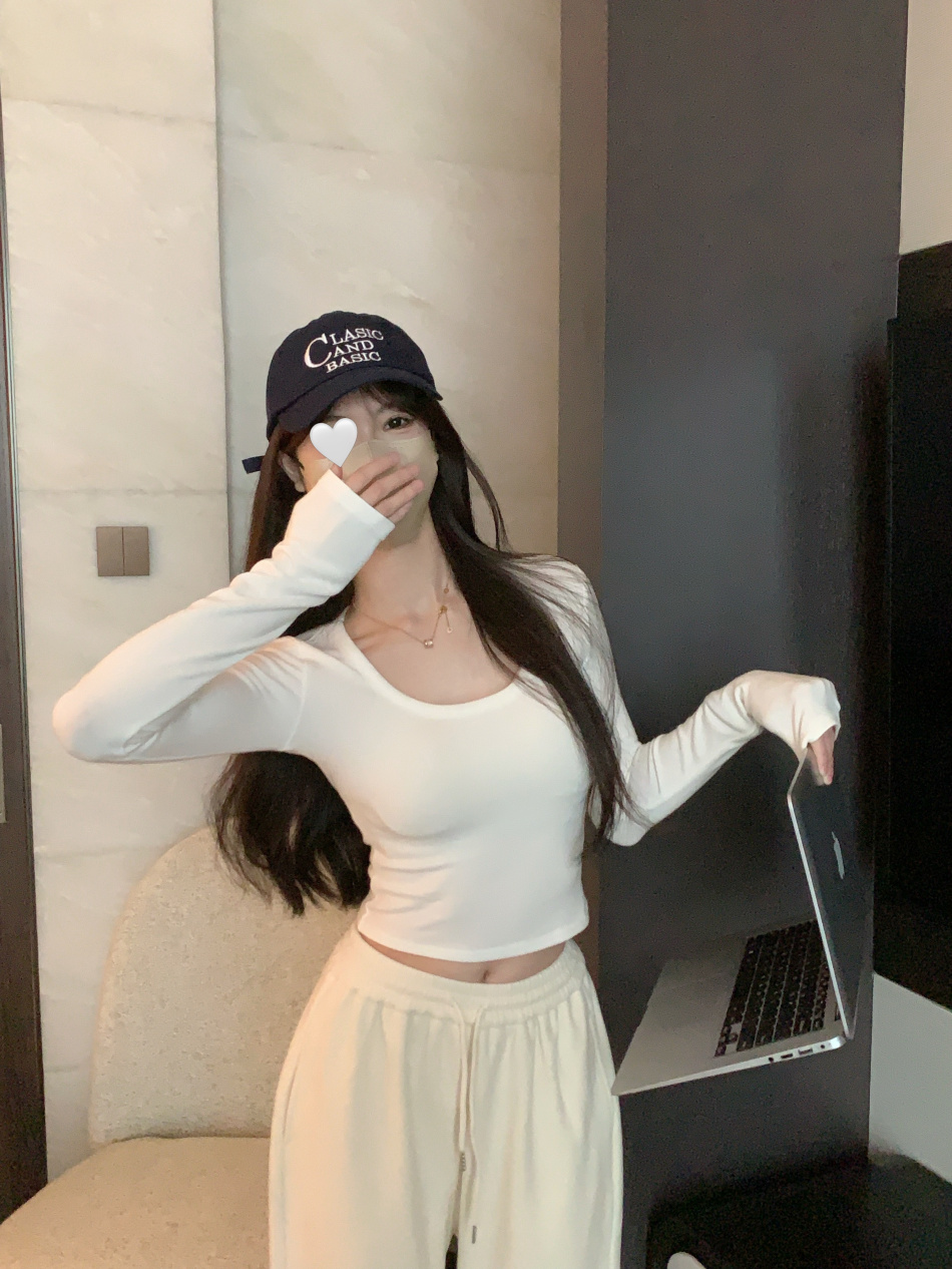 辣妹u領磨毛咖色打底衫女秋冬新款韓版修身性感薄絨長袖t恤女短款