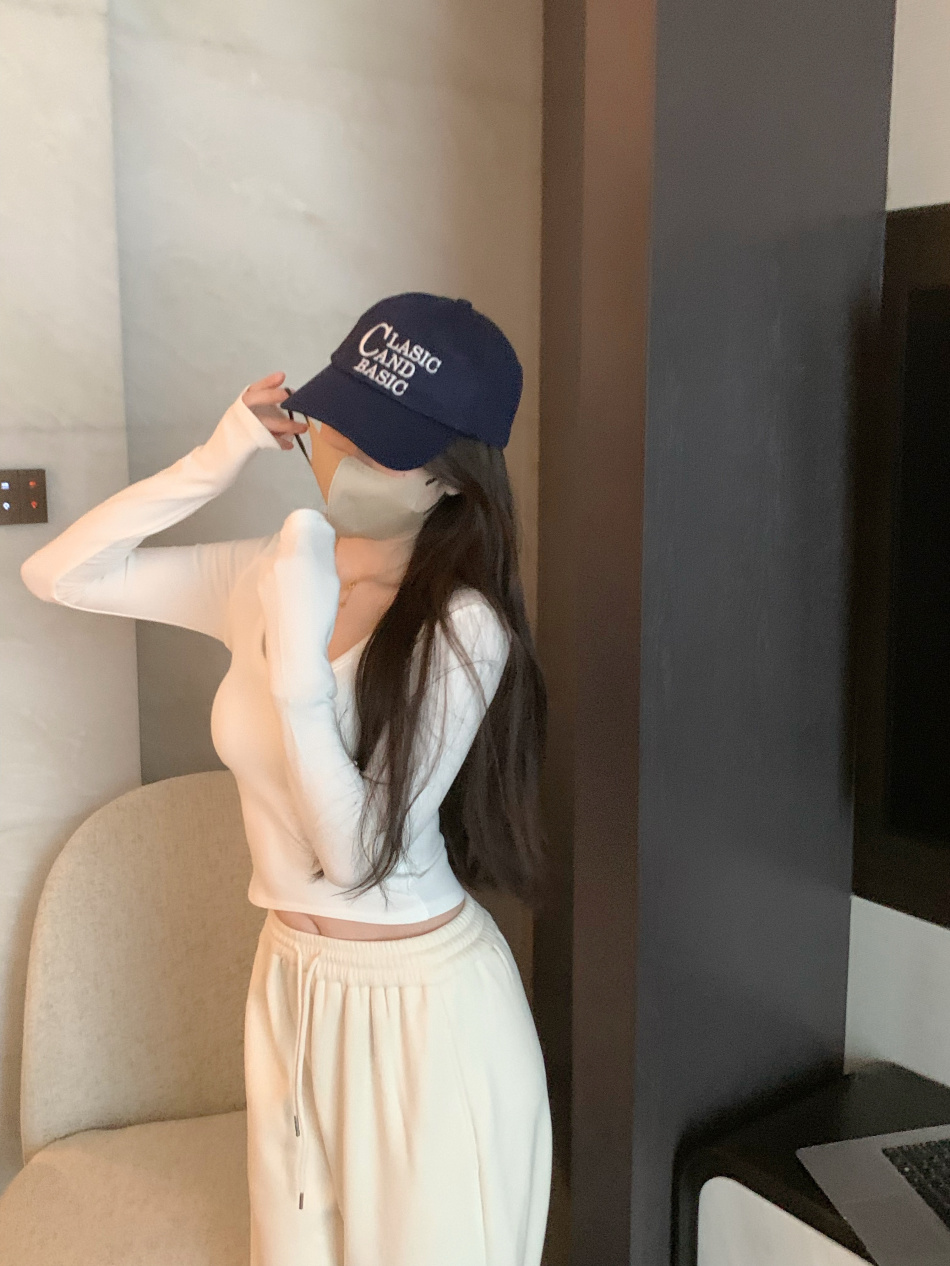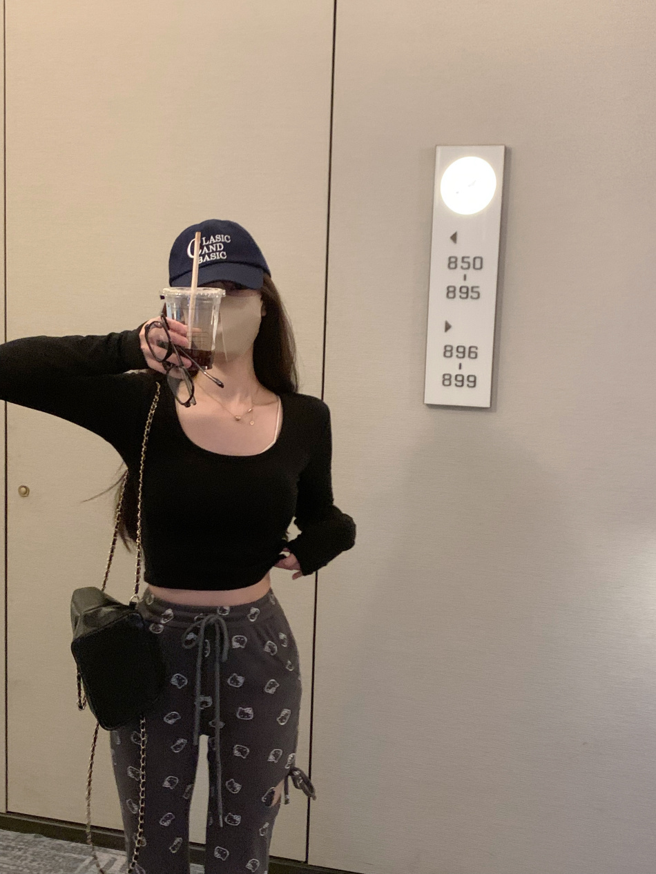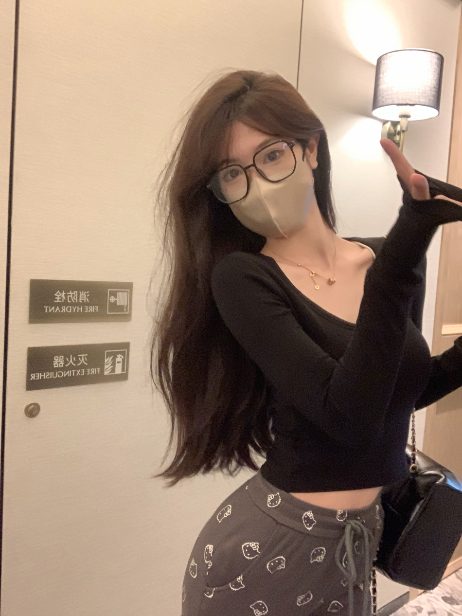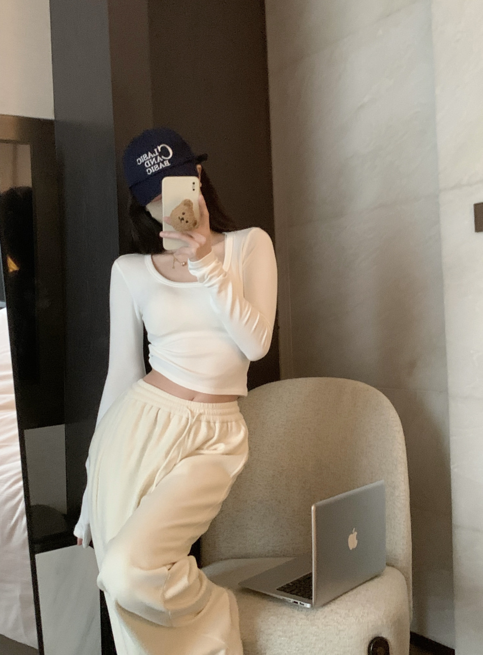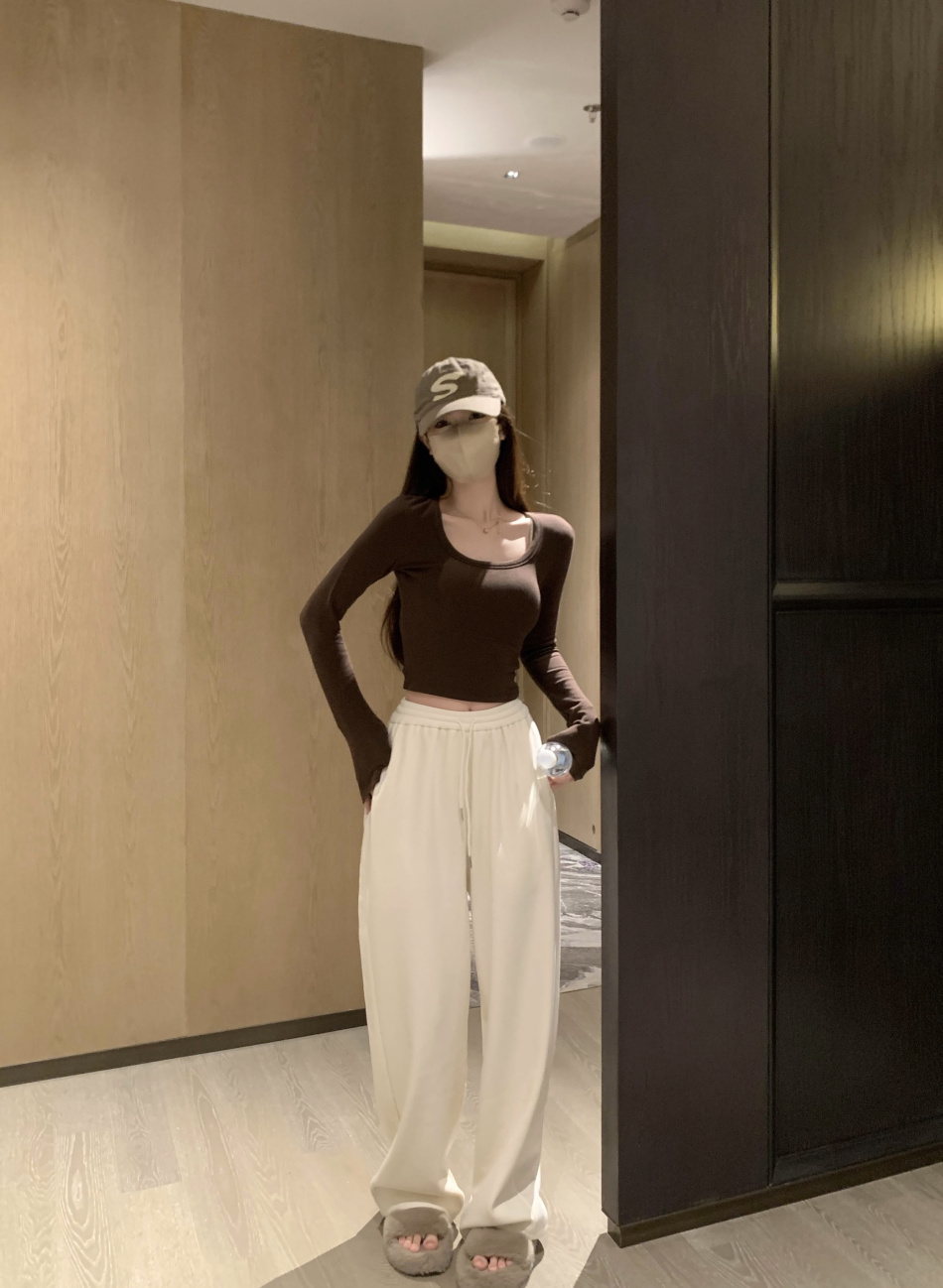 辣妹u領磨毛咖色打底衫女秋冬新款韓版修身性感薄絨長袖t恤女短款