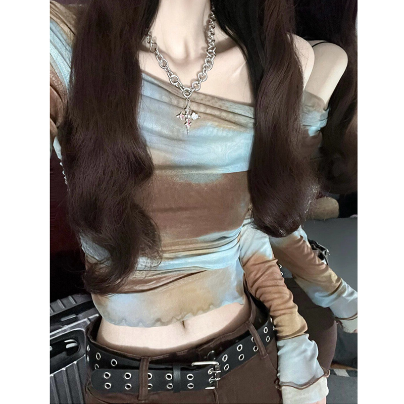 美式紥染網紗一字肩上衣雪紡衫女夏季性感修身甜辣妹露肩罩衫薄紗