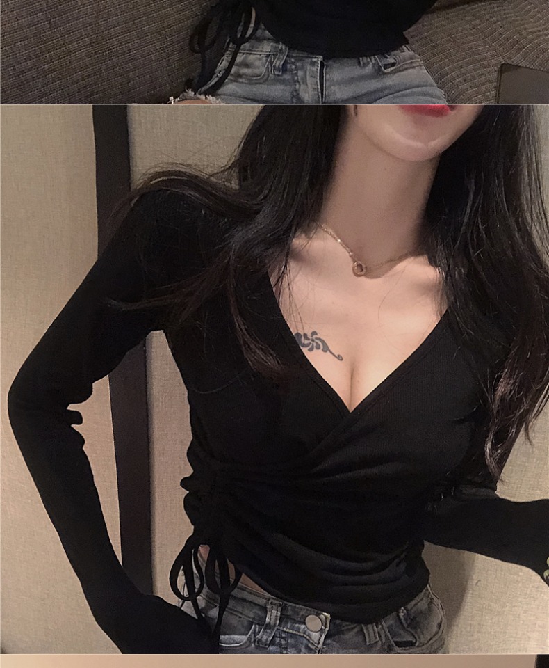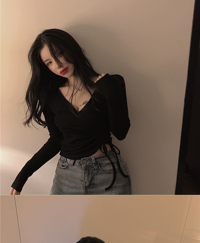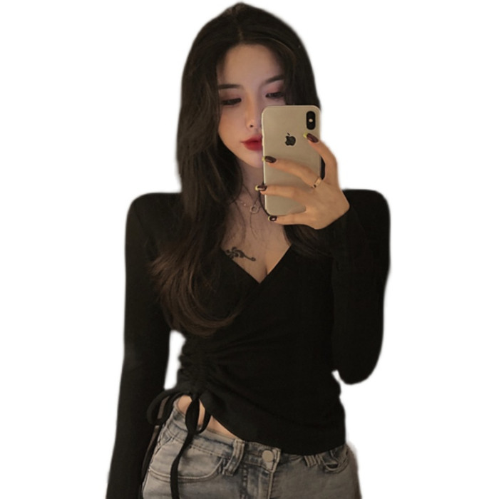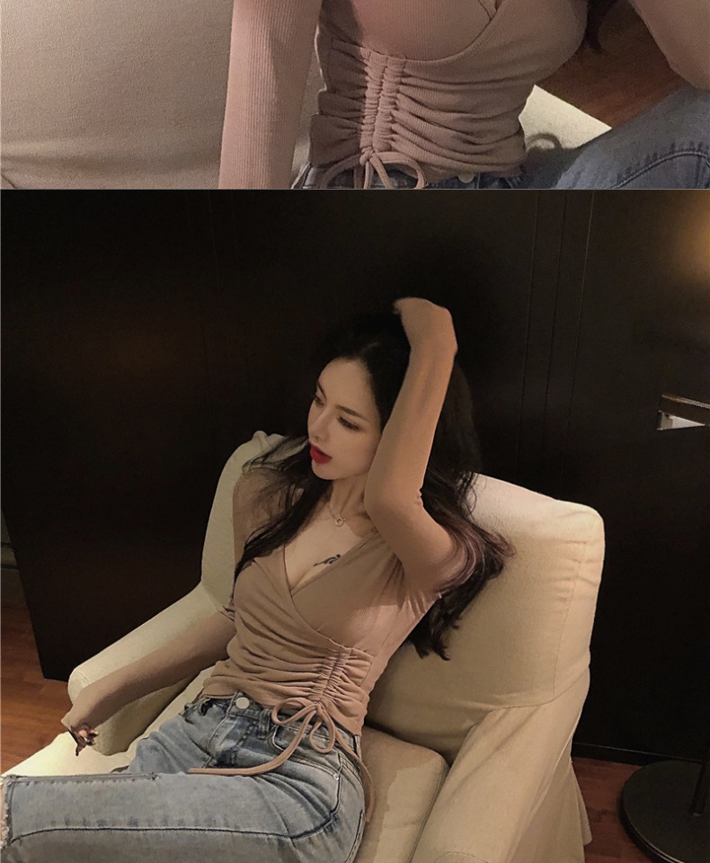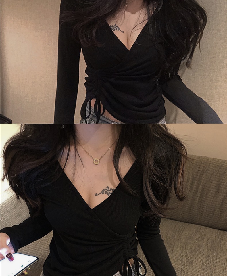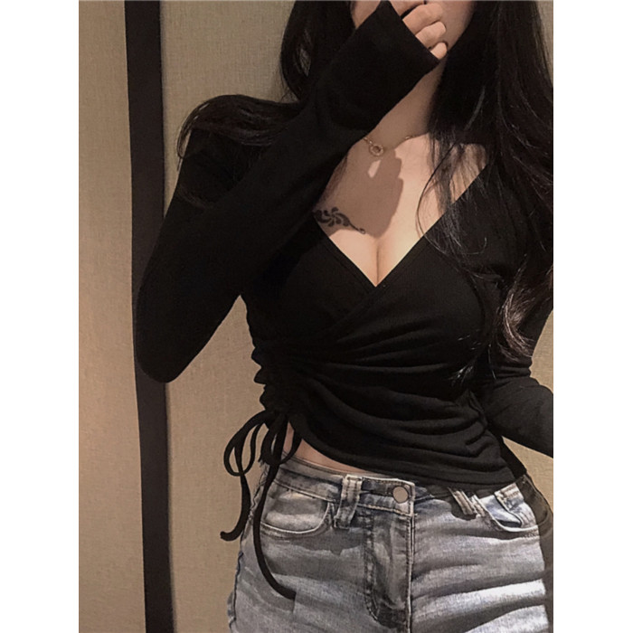純欲風高腰短款V領抽繩小衆正肩T恤氣質別致辣妹上衣打底衫女早春