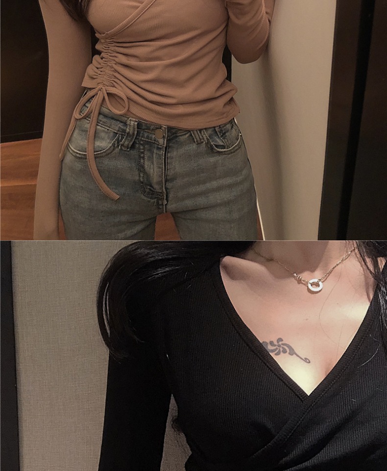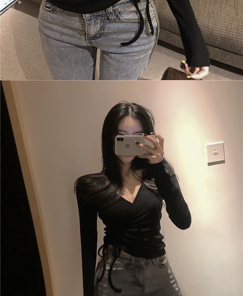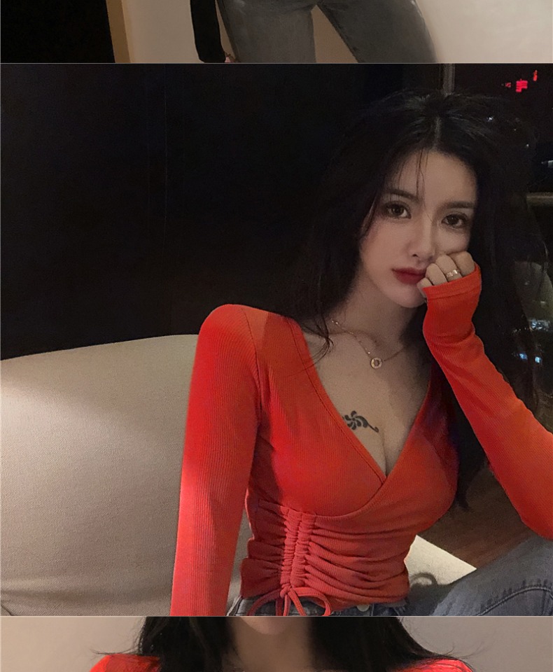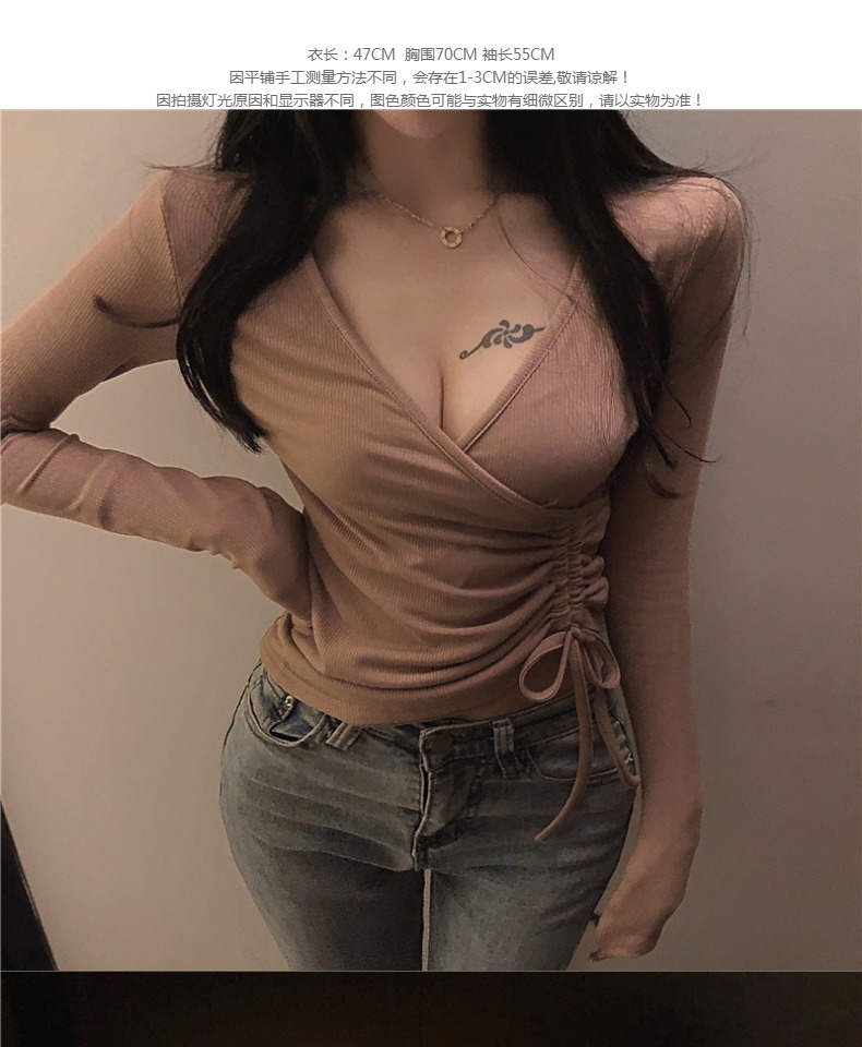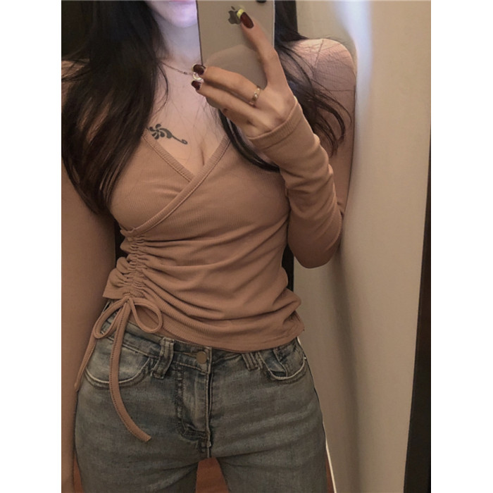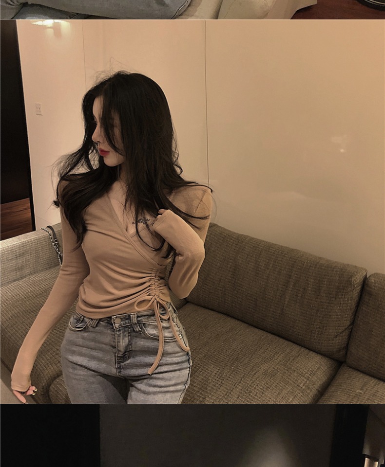 純欲風高腰短款V領抽繩小衆正肩T恤氣質別致辣妹上衣打底衫女早春