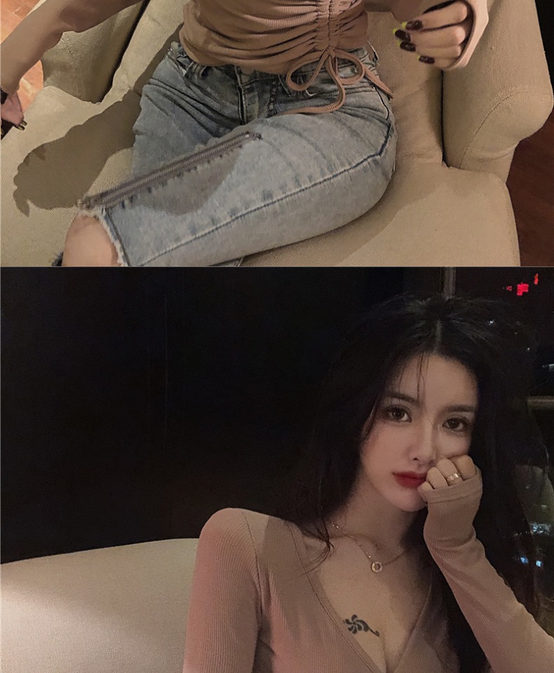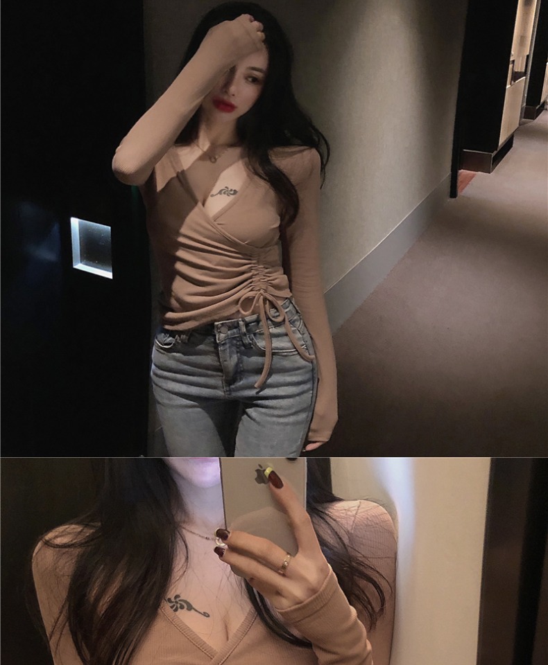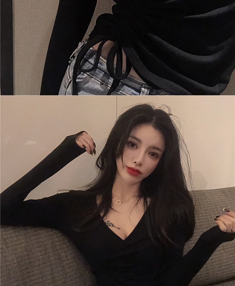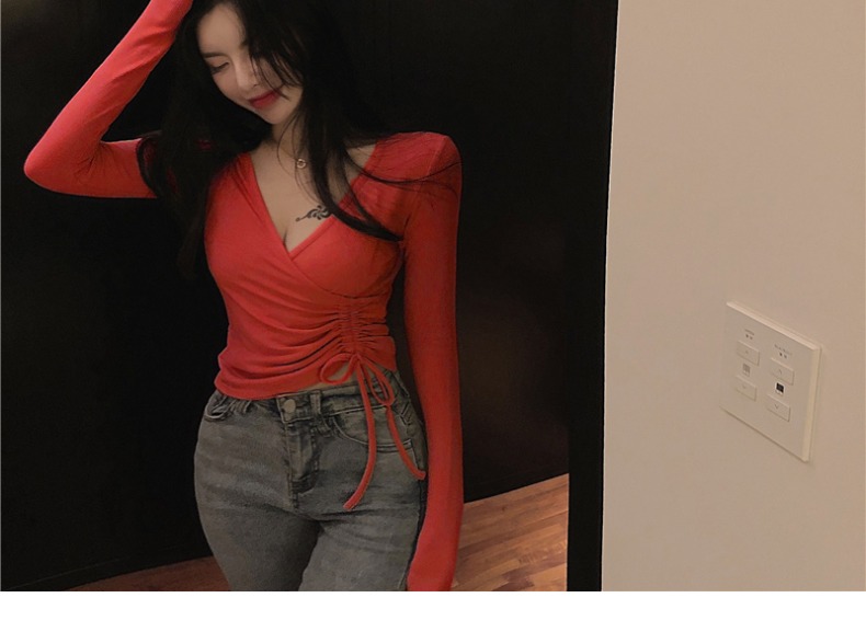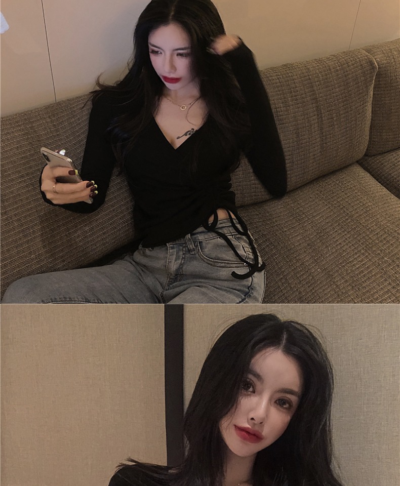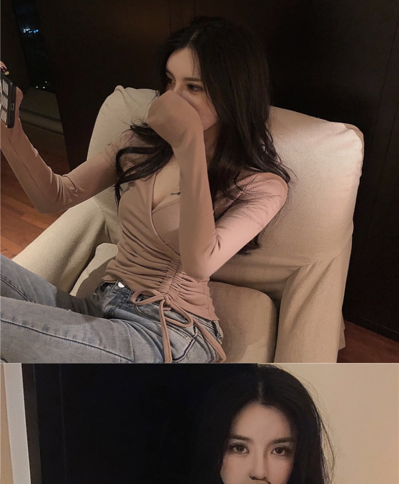純欲風高腰短款V領抽繩小衆正肩T恤氣質別致辣妹上衣打底衫女早春