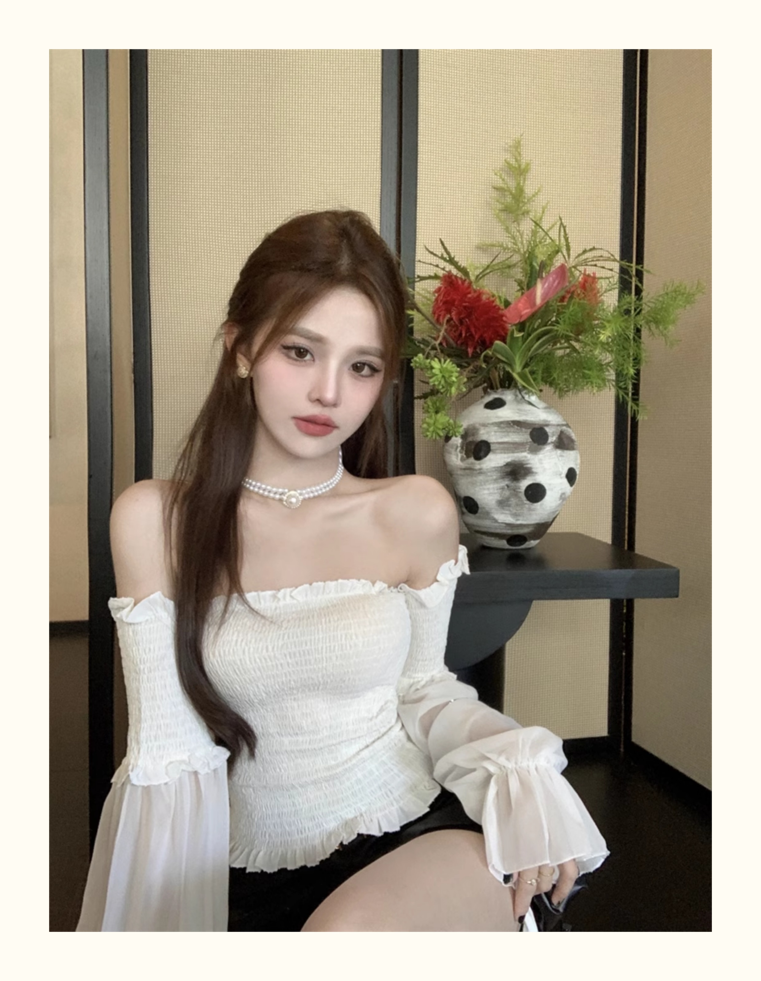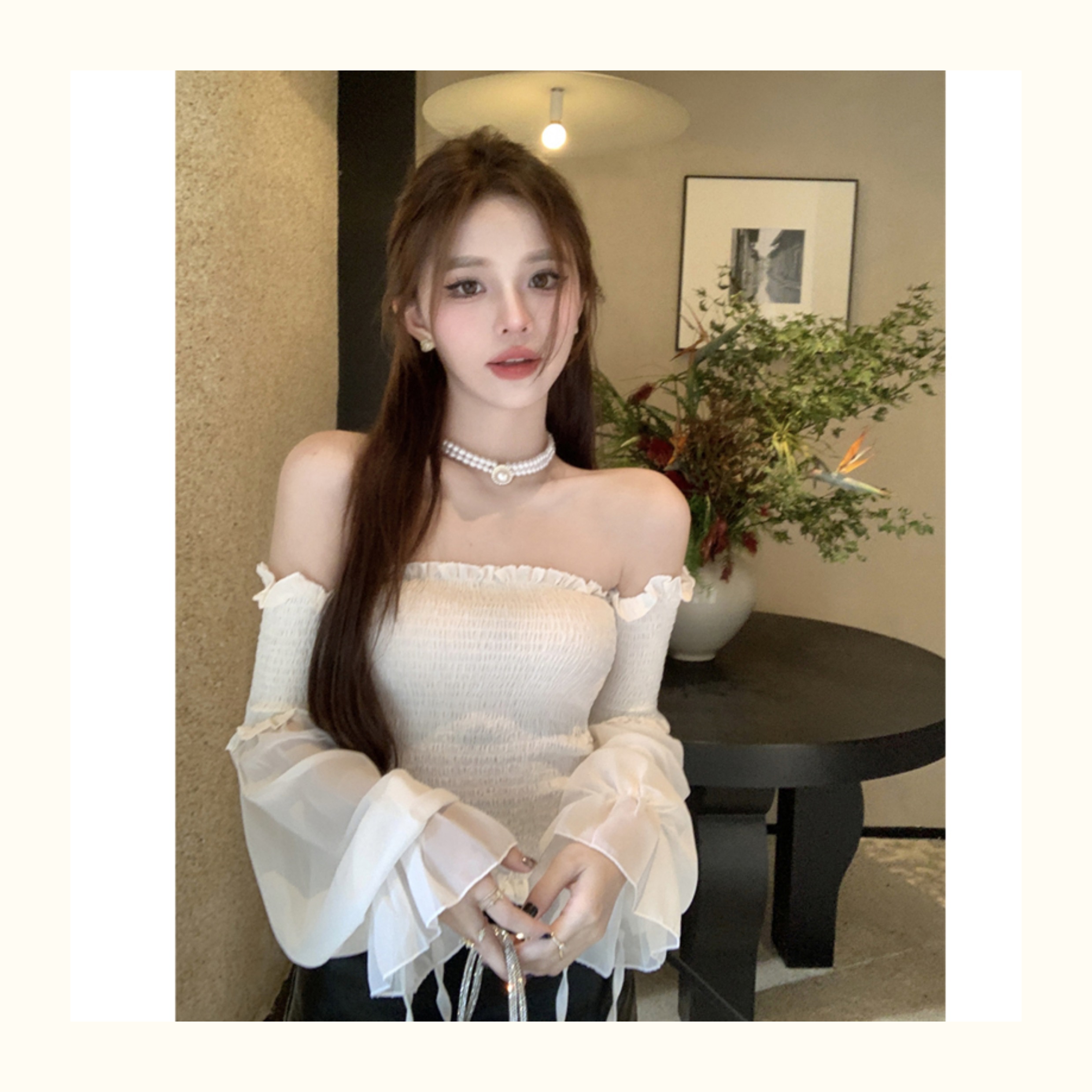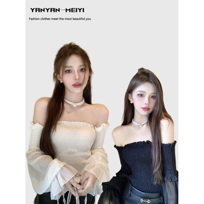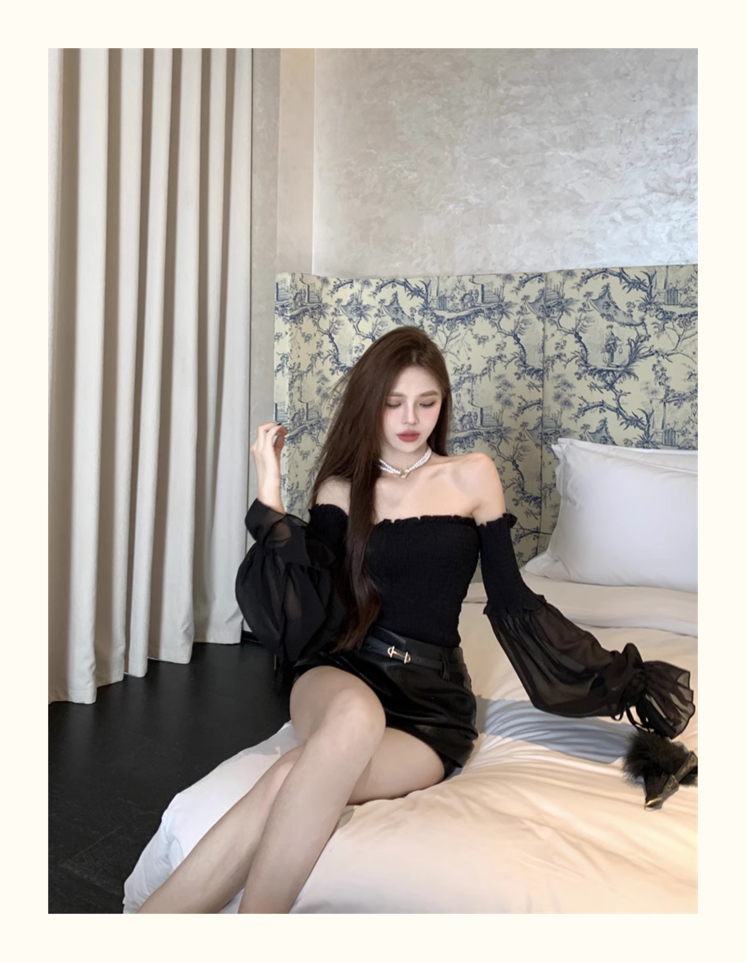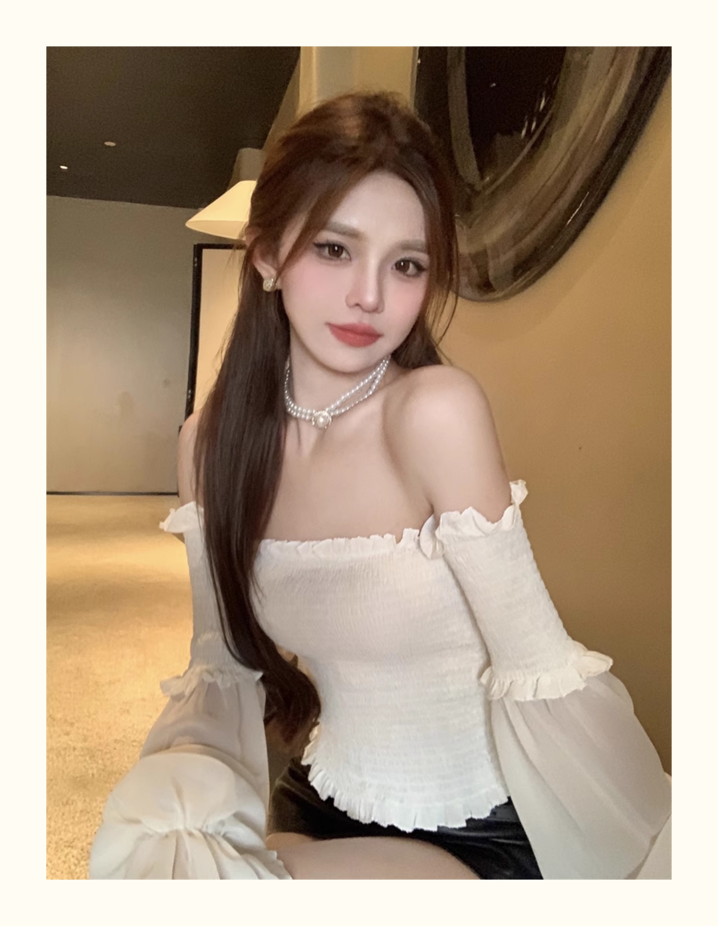 度假一字肩雪紡襯衫女夏設計感泡泡袖修身顯瘦抹胸絕美鎖骨上衣潮