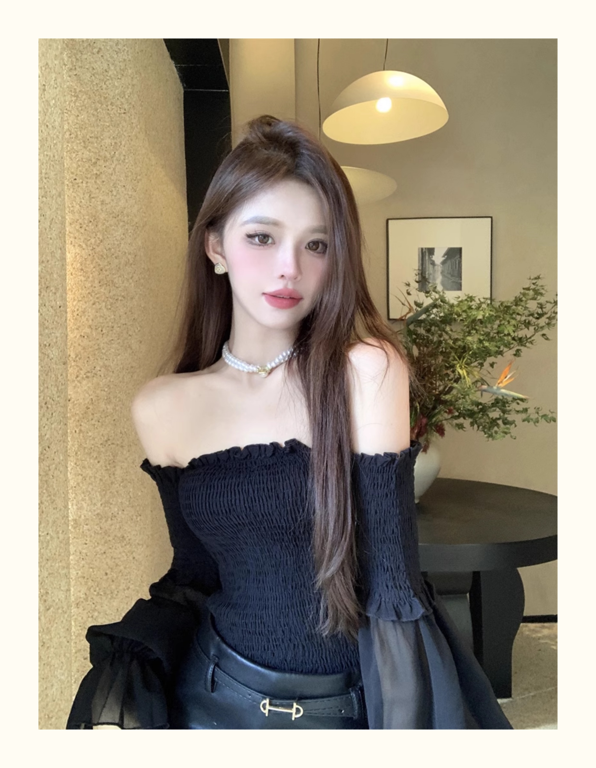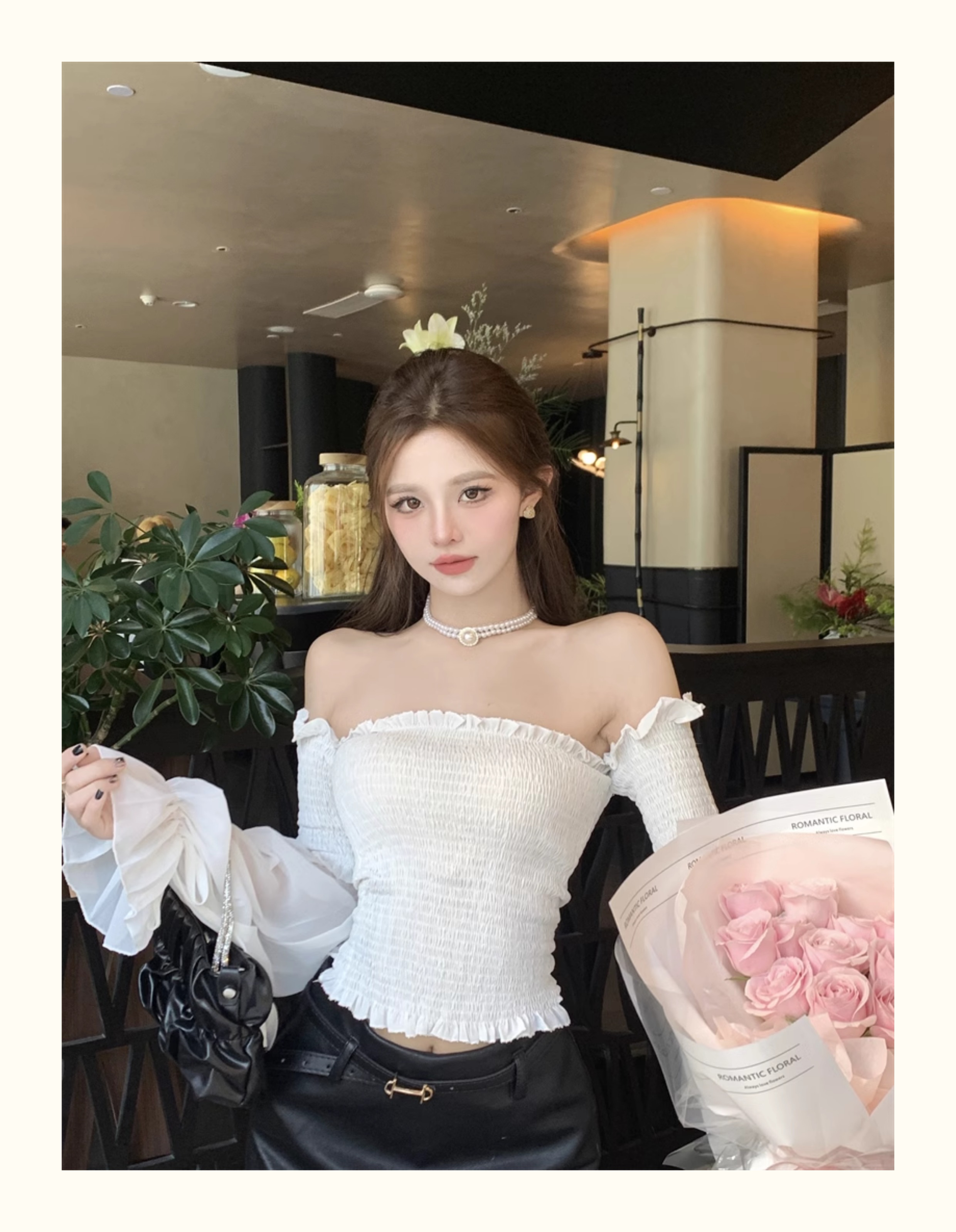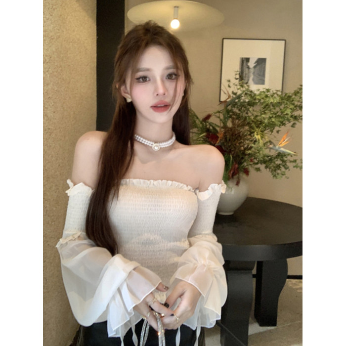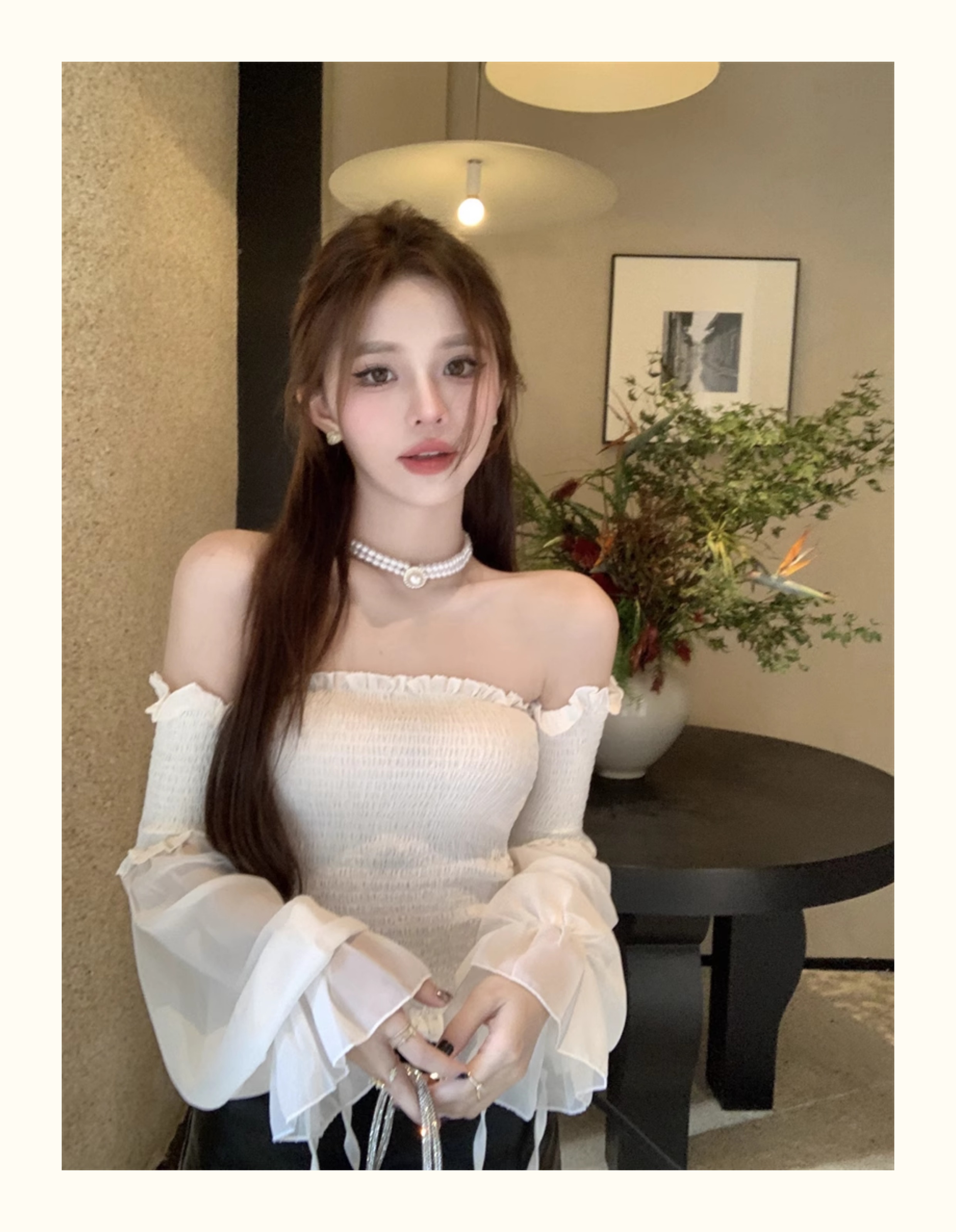 度假一字肩雪紡襯衫女夏設計感泡泡袖修身顯瘦抹胸絕美鎖骨上衣潮