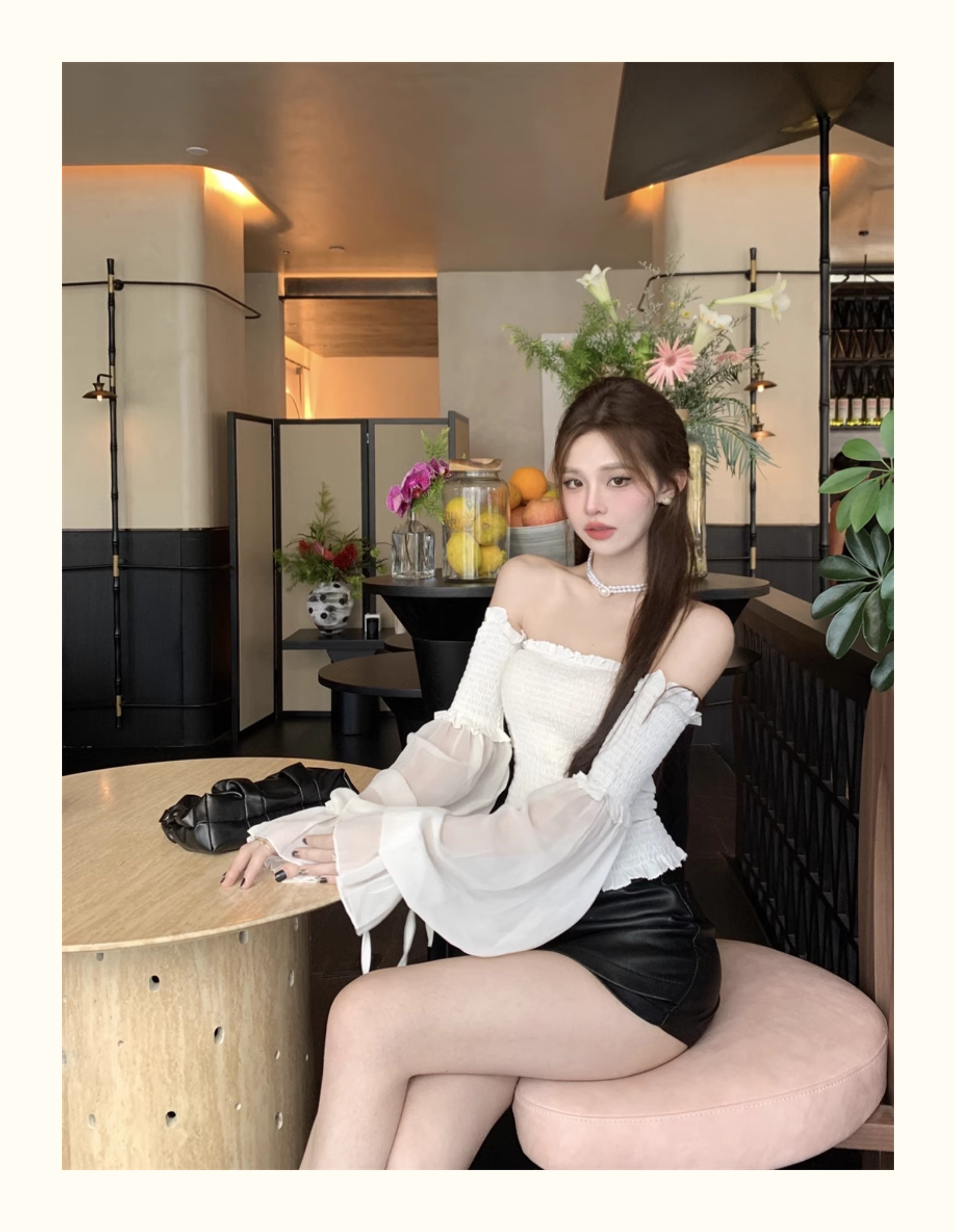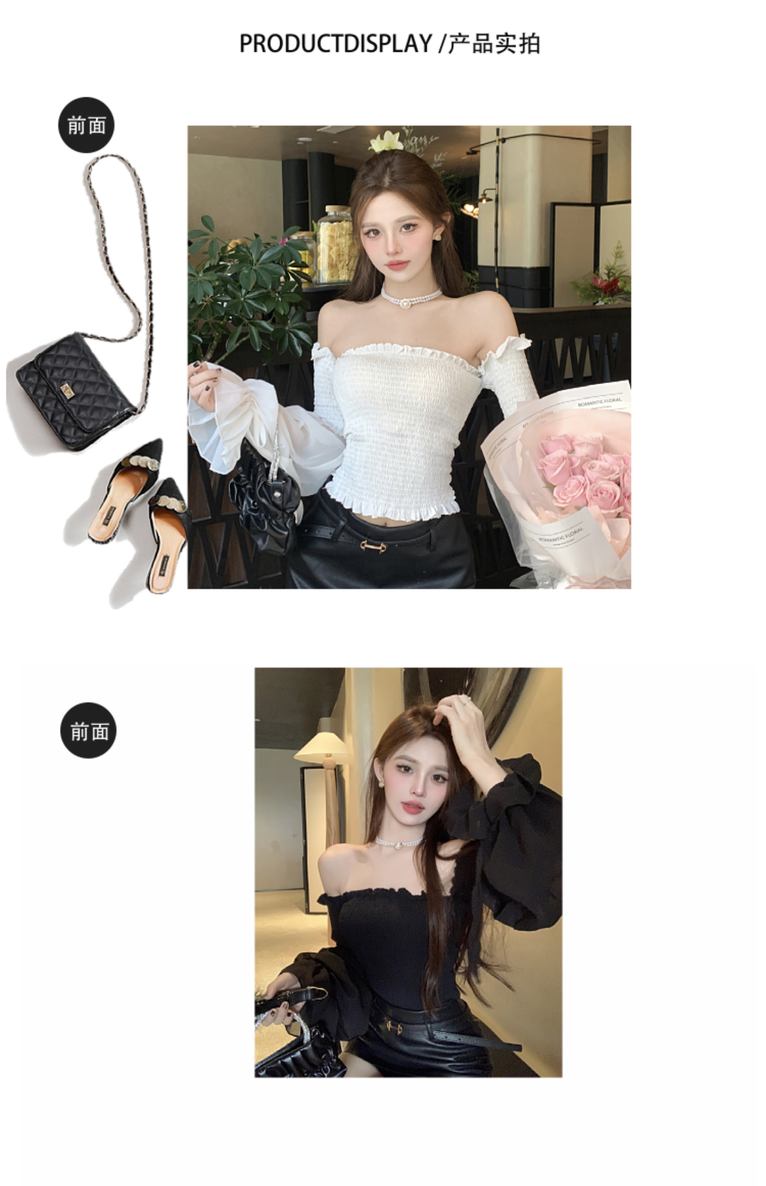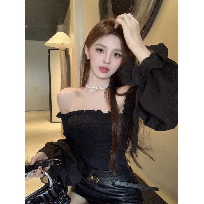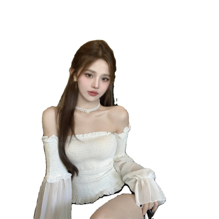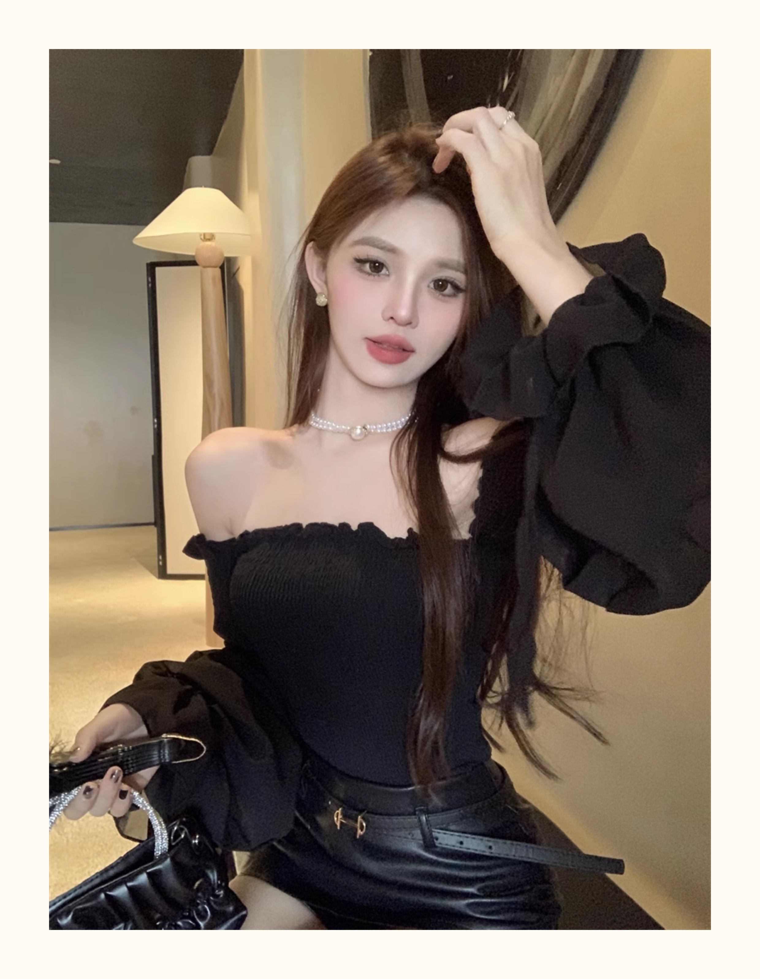 度假一字肩雪紡襯衫女夏設計感泡泡袖修身顯瘦抹胸絕美鎖骨上衣潮